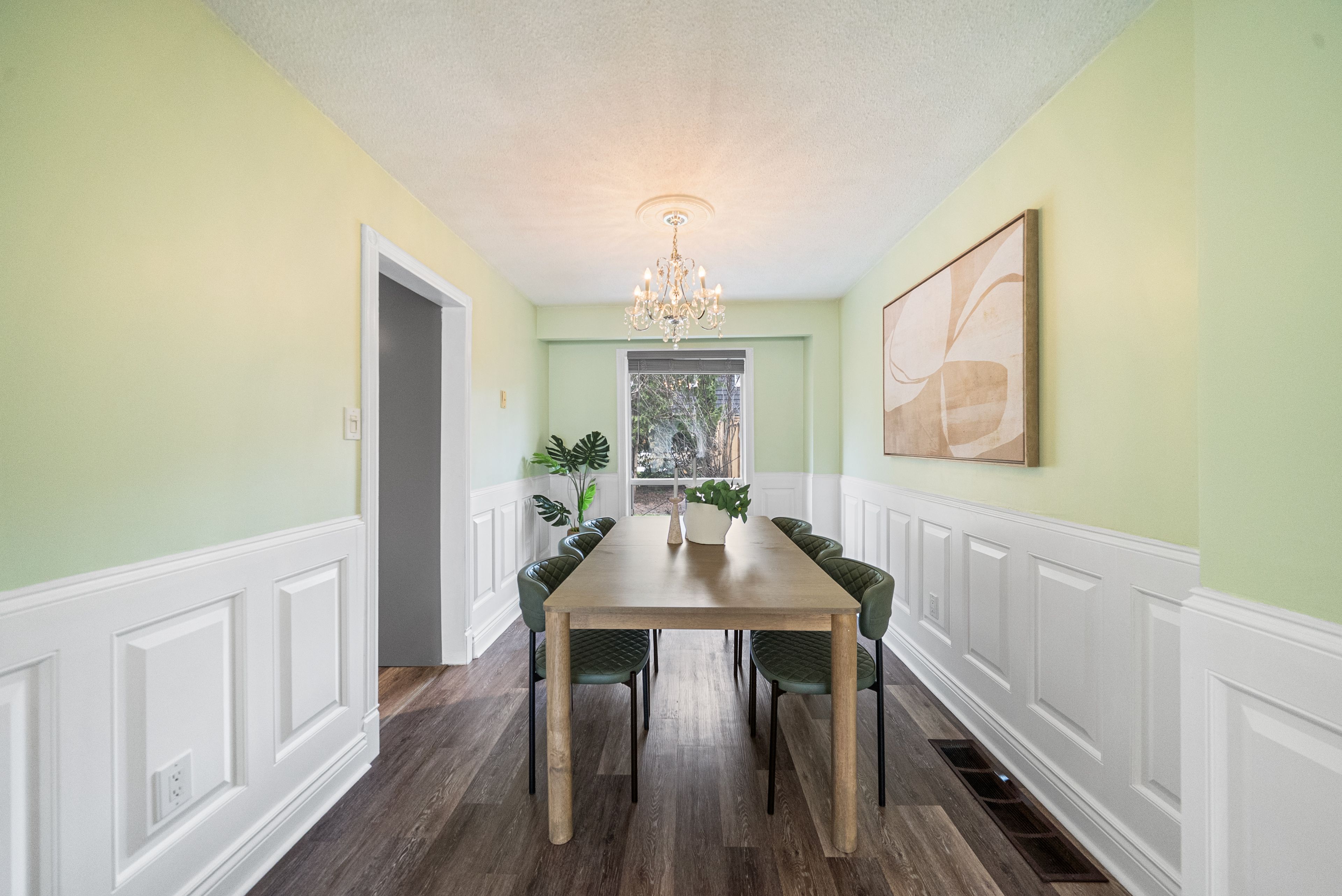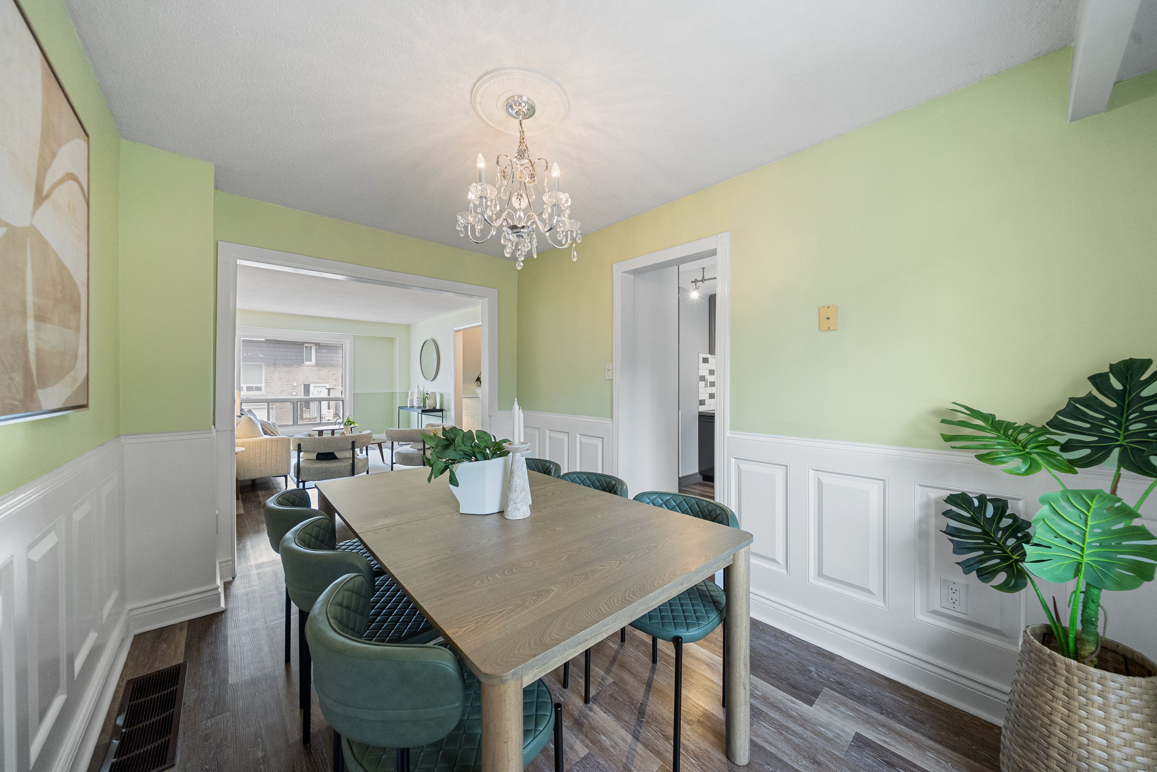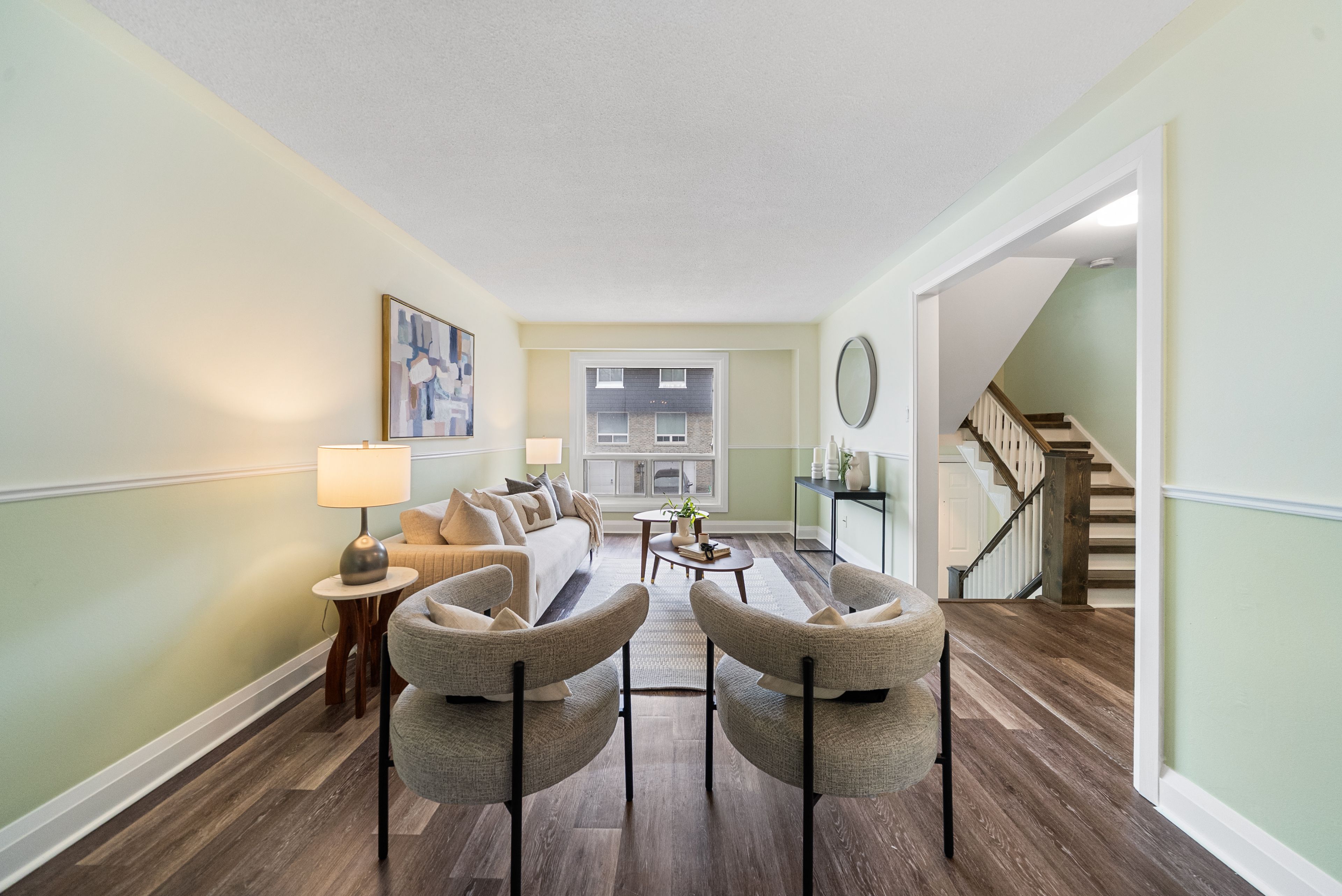 • Open-concept living and dining rooms filled with natural light from large windows.