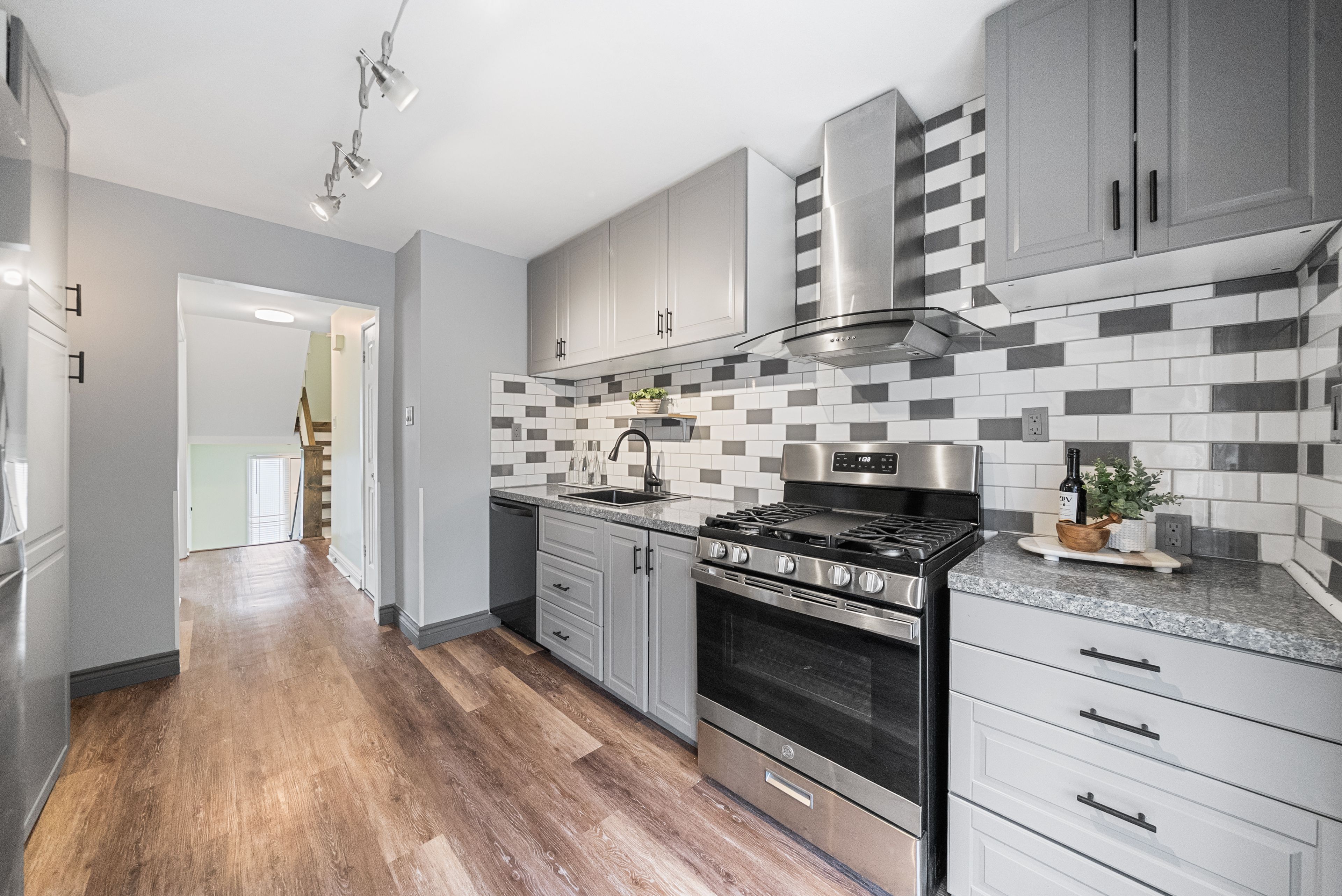 • Updated kitchen with stylish cabinetry, stainless steel appliances, and pantry organizers.