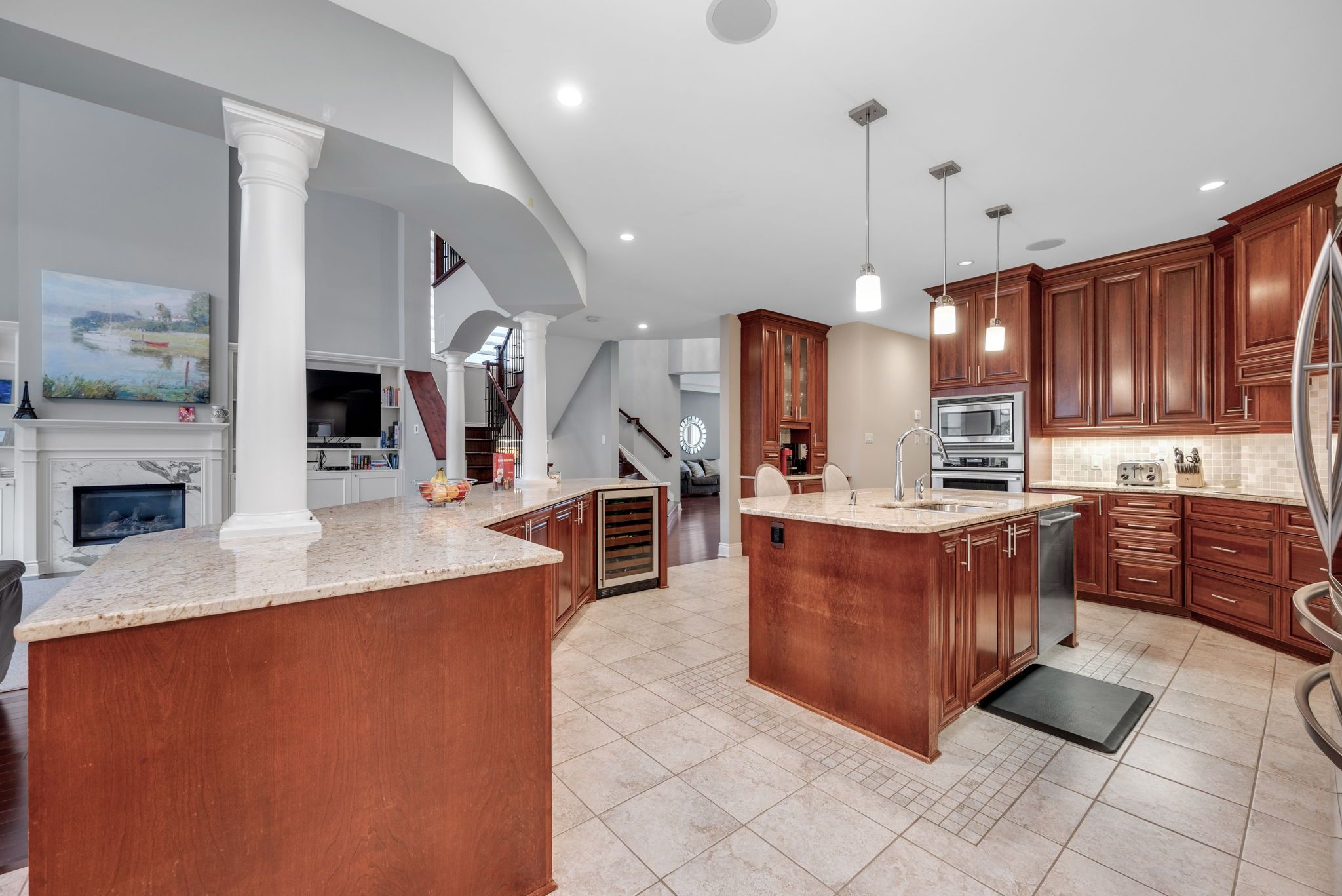 • Epicurean kitchen with double islands and sunroom view.