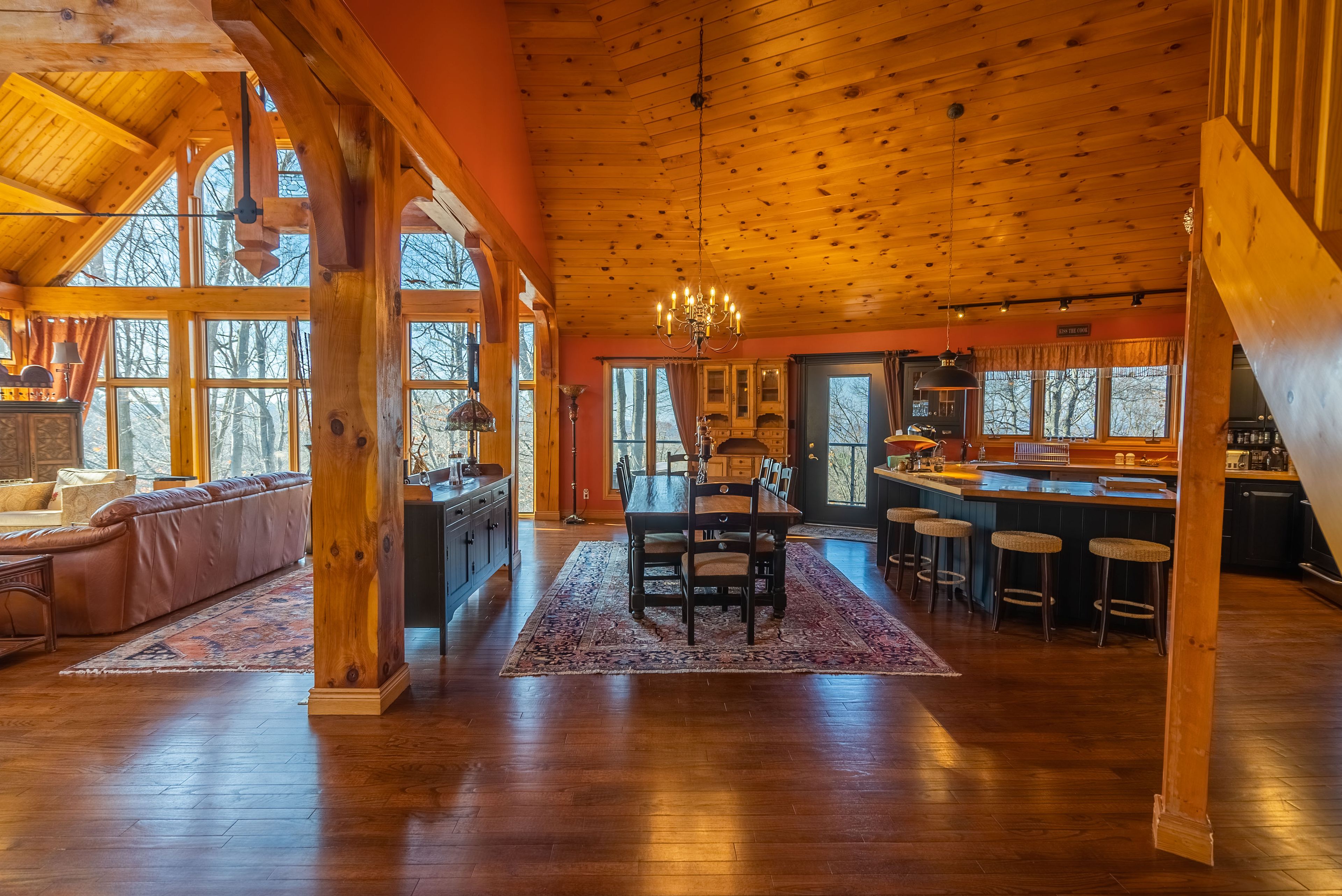 Stunning executive chalet style, located in the prestigious highlands of horseshoe ~ post & beam open concept bungaloft with 4 bedrooms and a walk-out lower level. Master bedroom with privacy in the loft with beautiful ensuite bathroom overlooking the hills and valley, 2 walk in closets, and additional storage rooms. Main level with office/bedroom, full bath, mud room laundry + garage access. Lower level stunning open concept family room with fireplace, 2 walk-out patio doors, kitchenette/bar, wine cellar, sauna/pantry room, 2 bedrooms, huge walk in hall closet + full bathroom. Over 4000 sq ft of living space! Double car garage + outdoor shed. Spectacular views and breathtaking sunsets! Fully furnished + utilities included!
