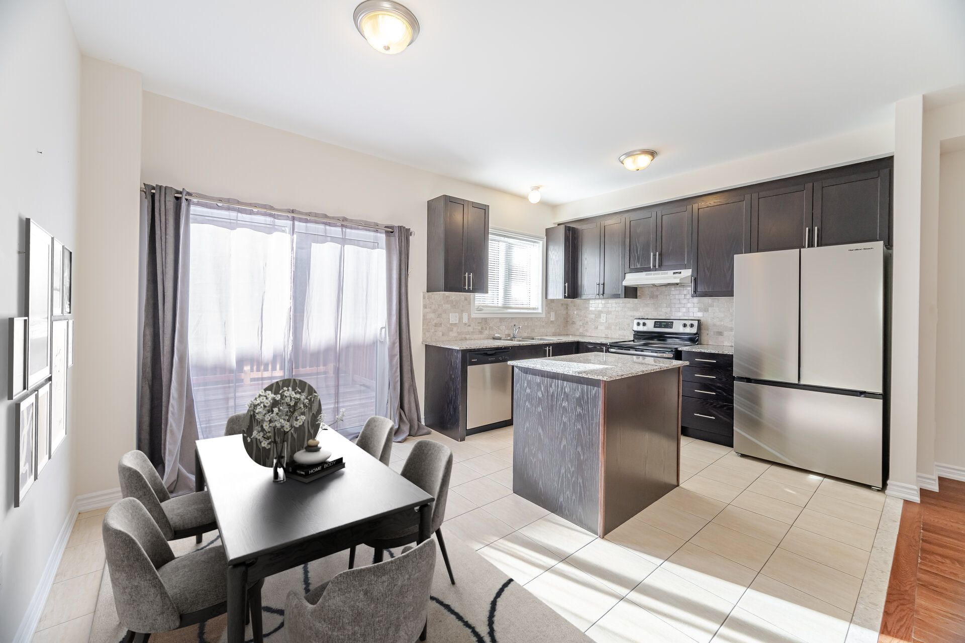 • Stylish kitchen with stainless steel appliances and quartz countertops.
