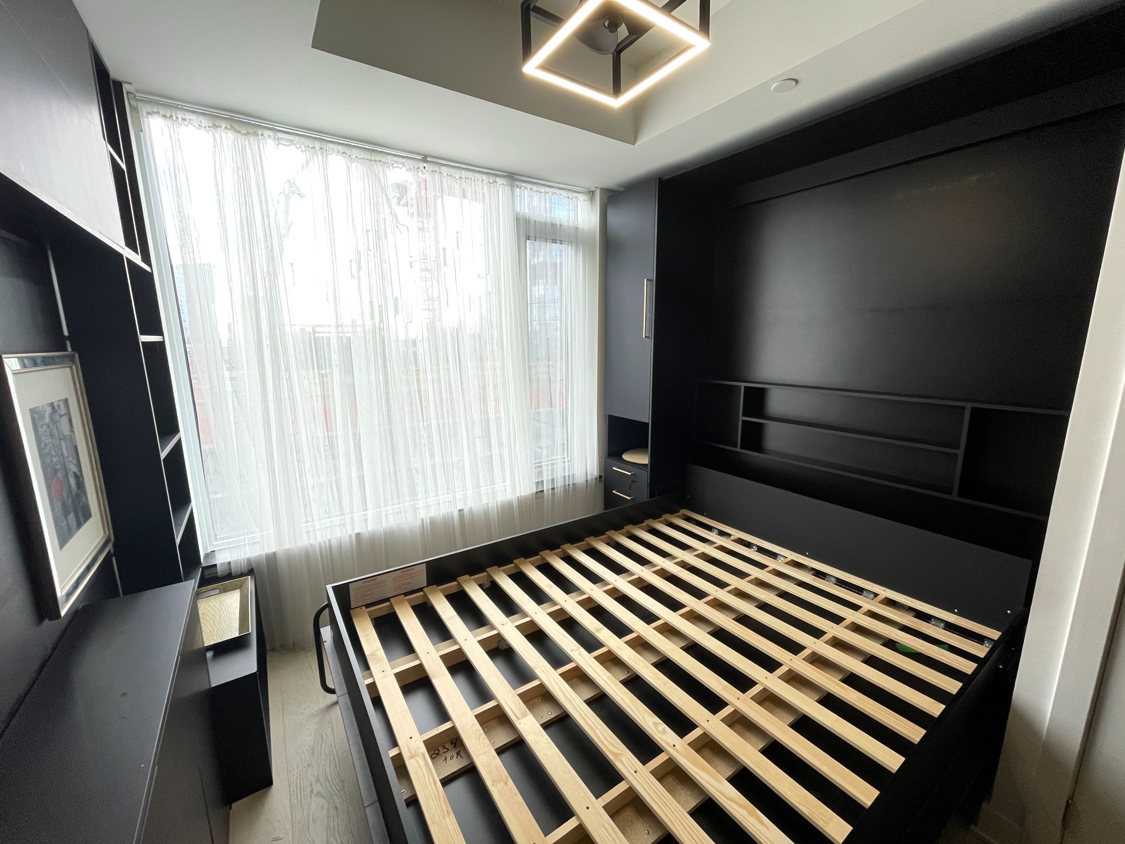 • Custom closet system and Murphy bed for maximum functionality.