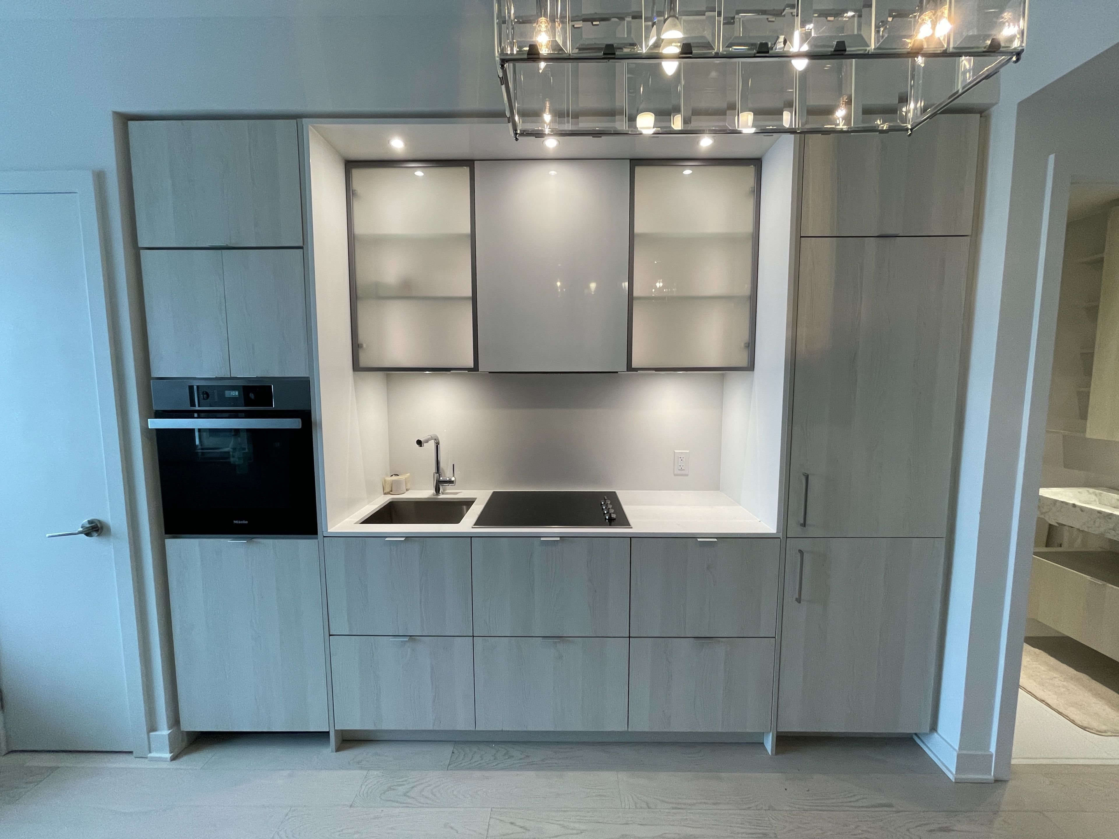 • Open-concept kitchen with upscale Miele appliances and quartz counters.