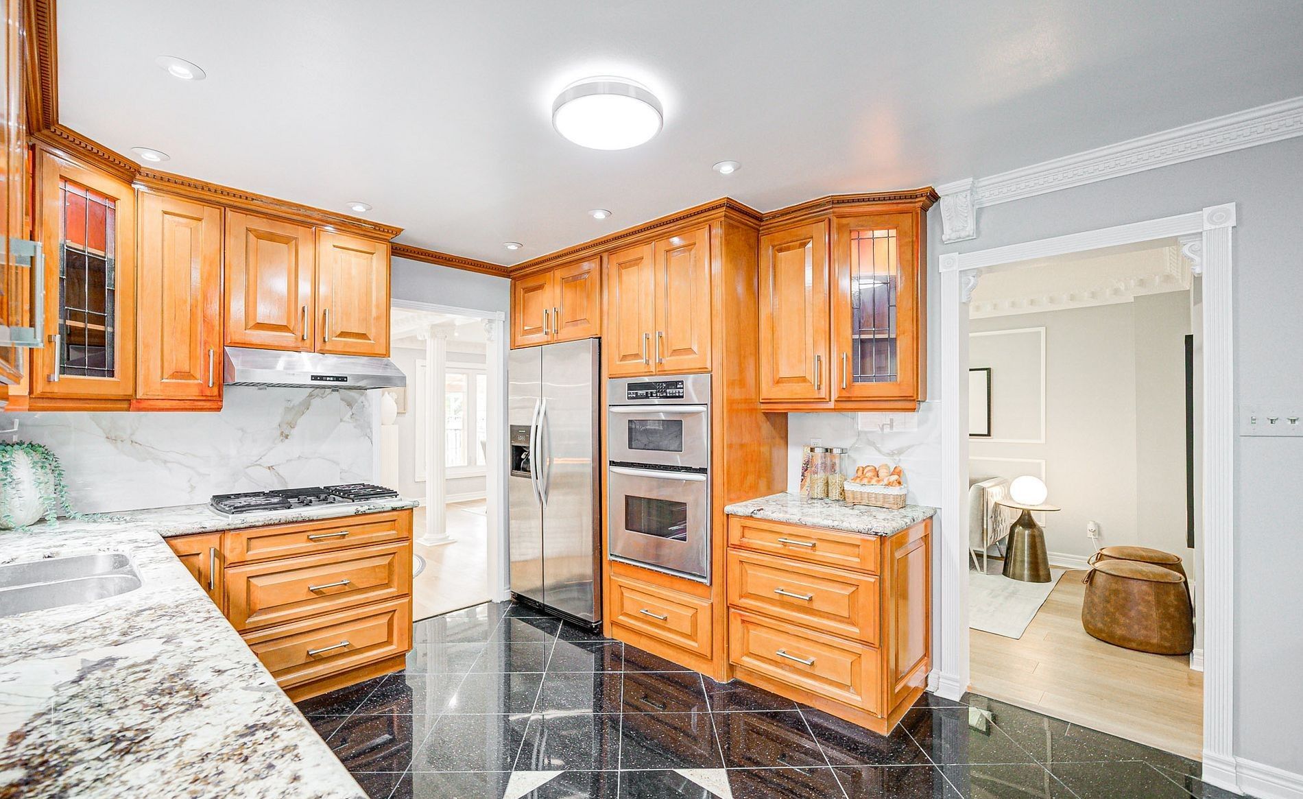 • Family-size kitchen with stainless steel appliances for cooking.