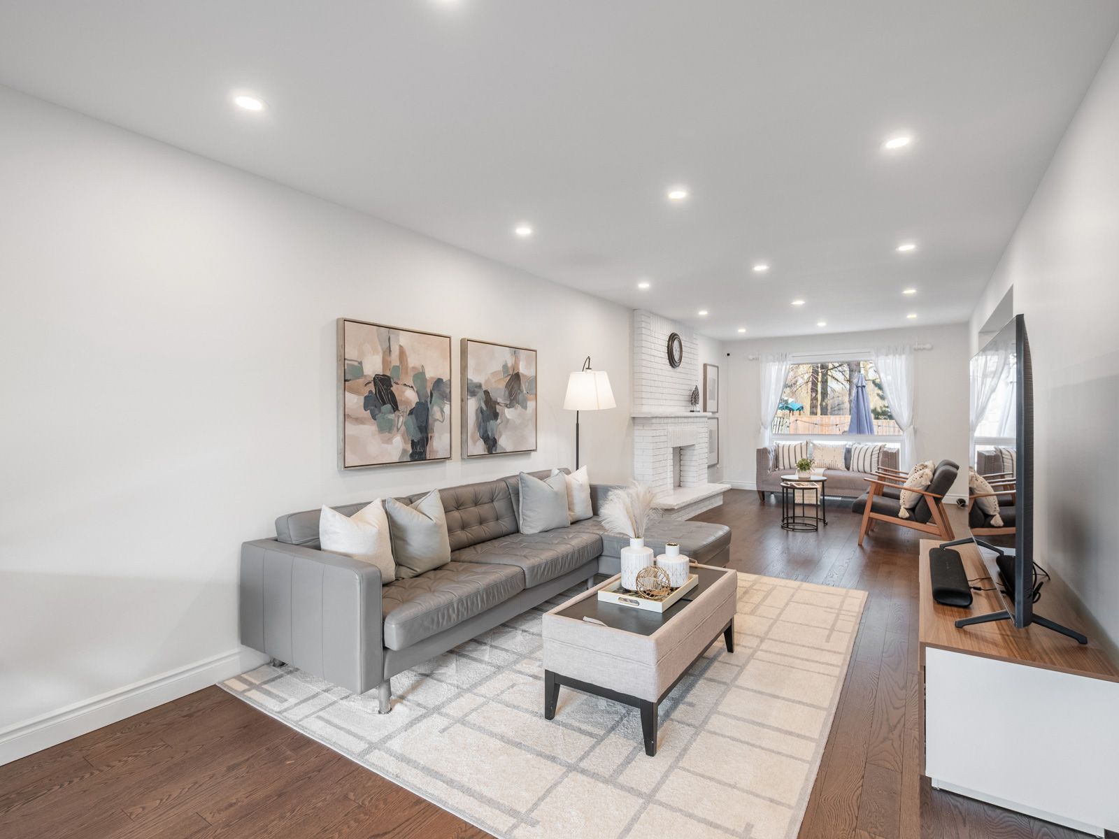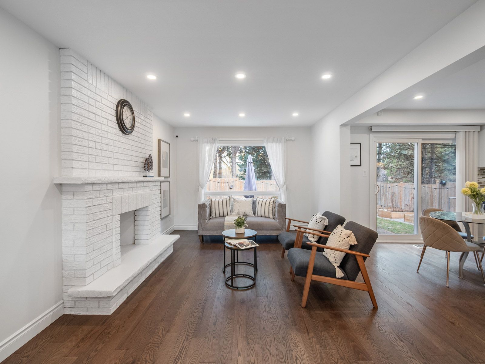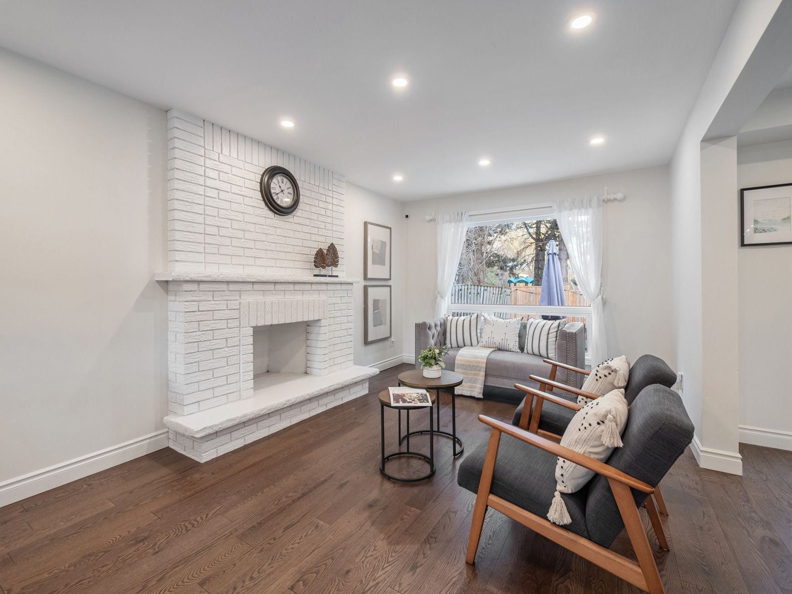 • Bright main level with hardwood flooring and a cozy brick fireplace.