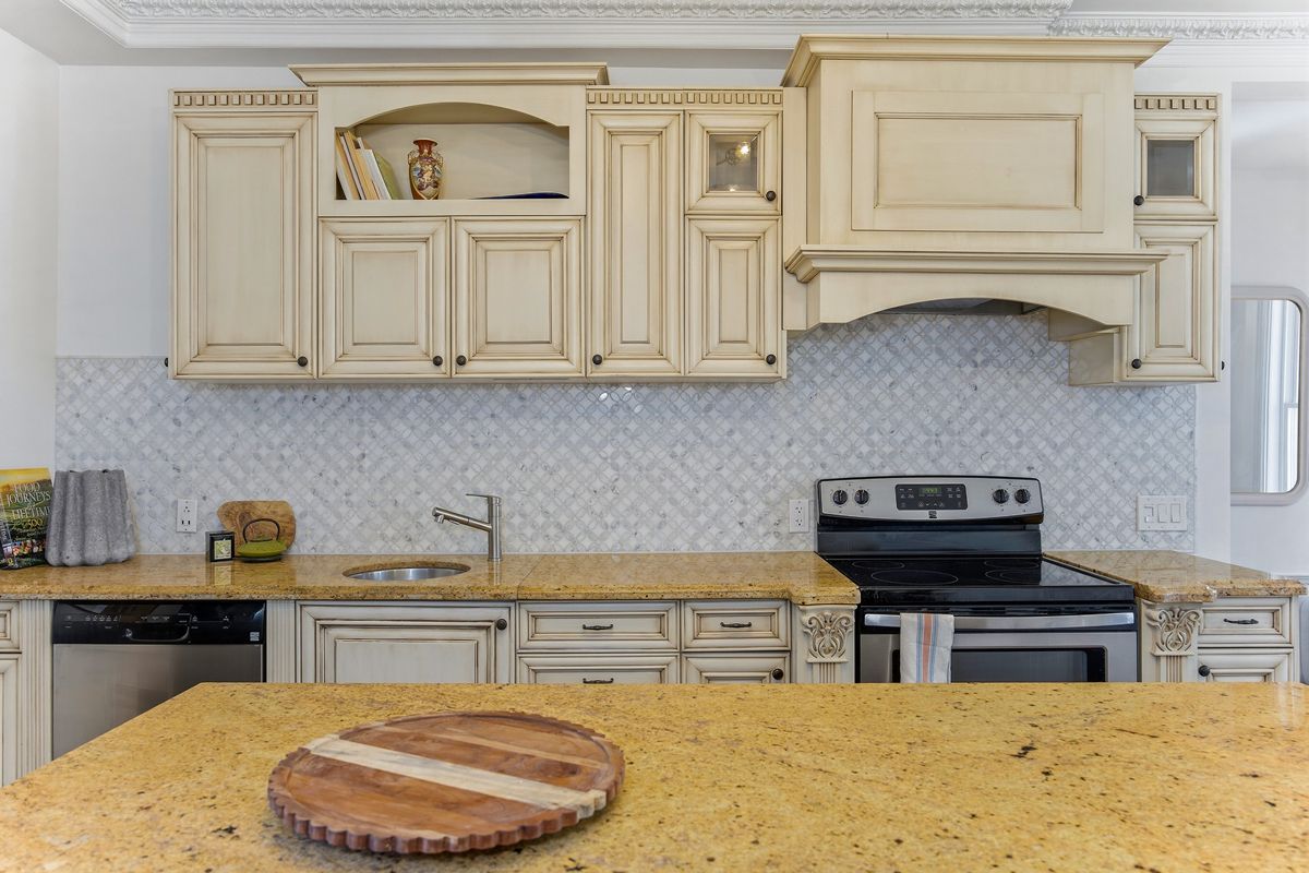 • Designer kitchen featuring granite counters and stainless steel appliances.