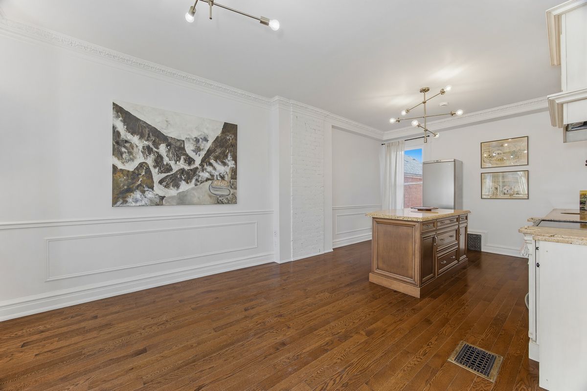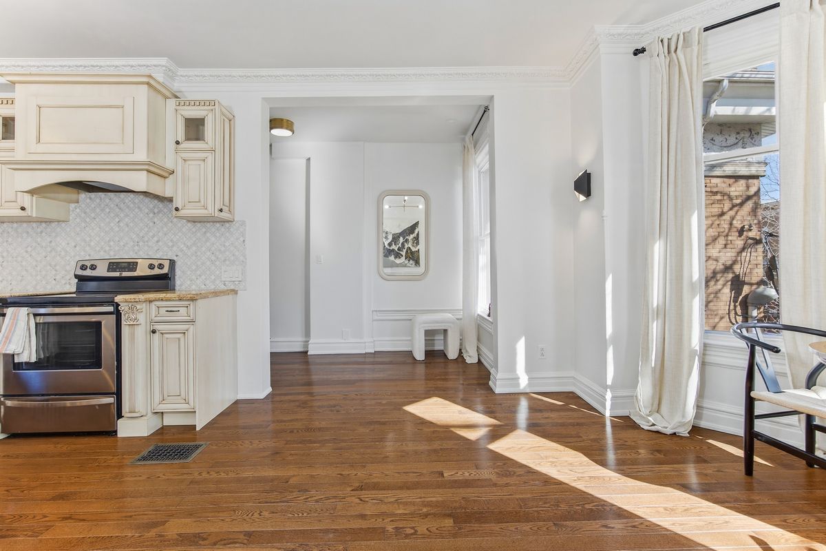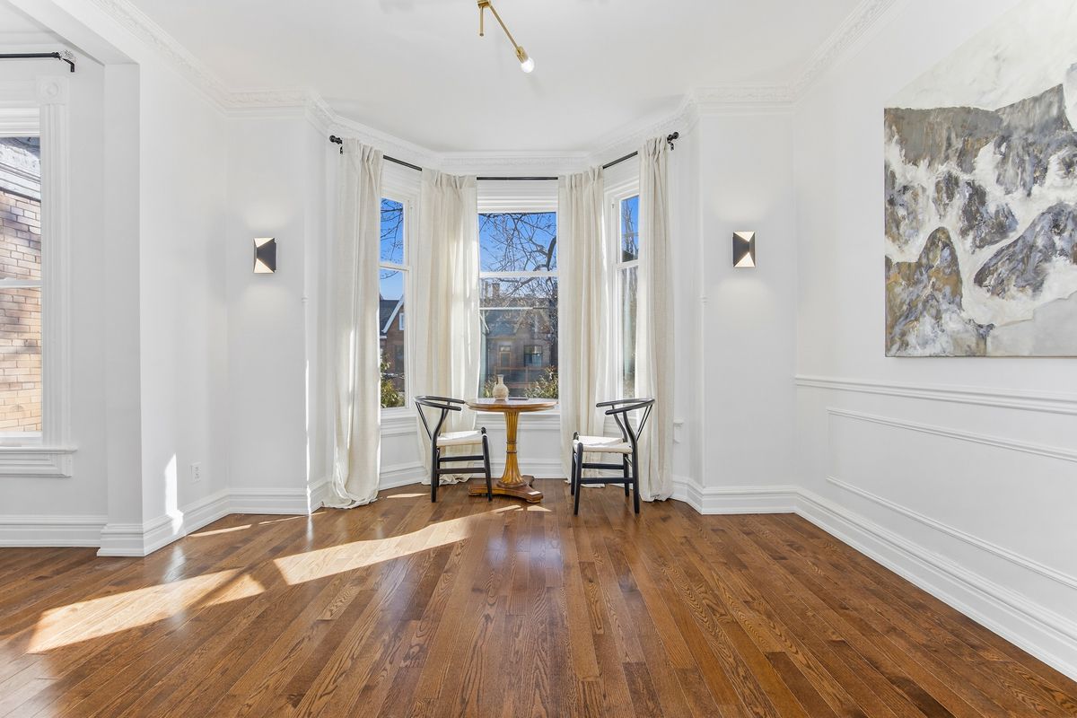 • Bright open-concept living area with elegant wood detailing and bay window.