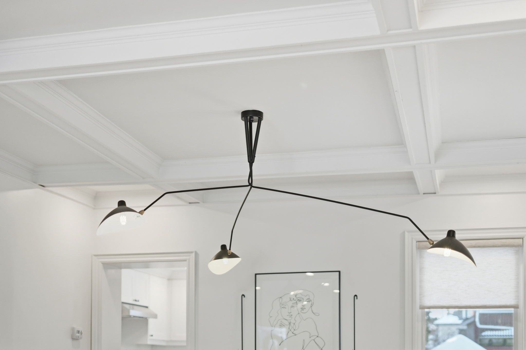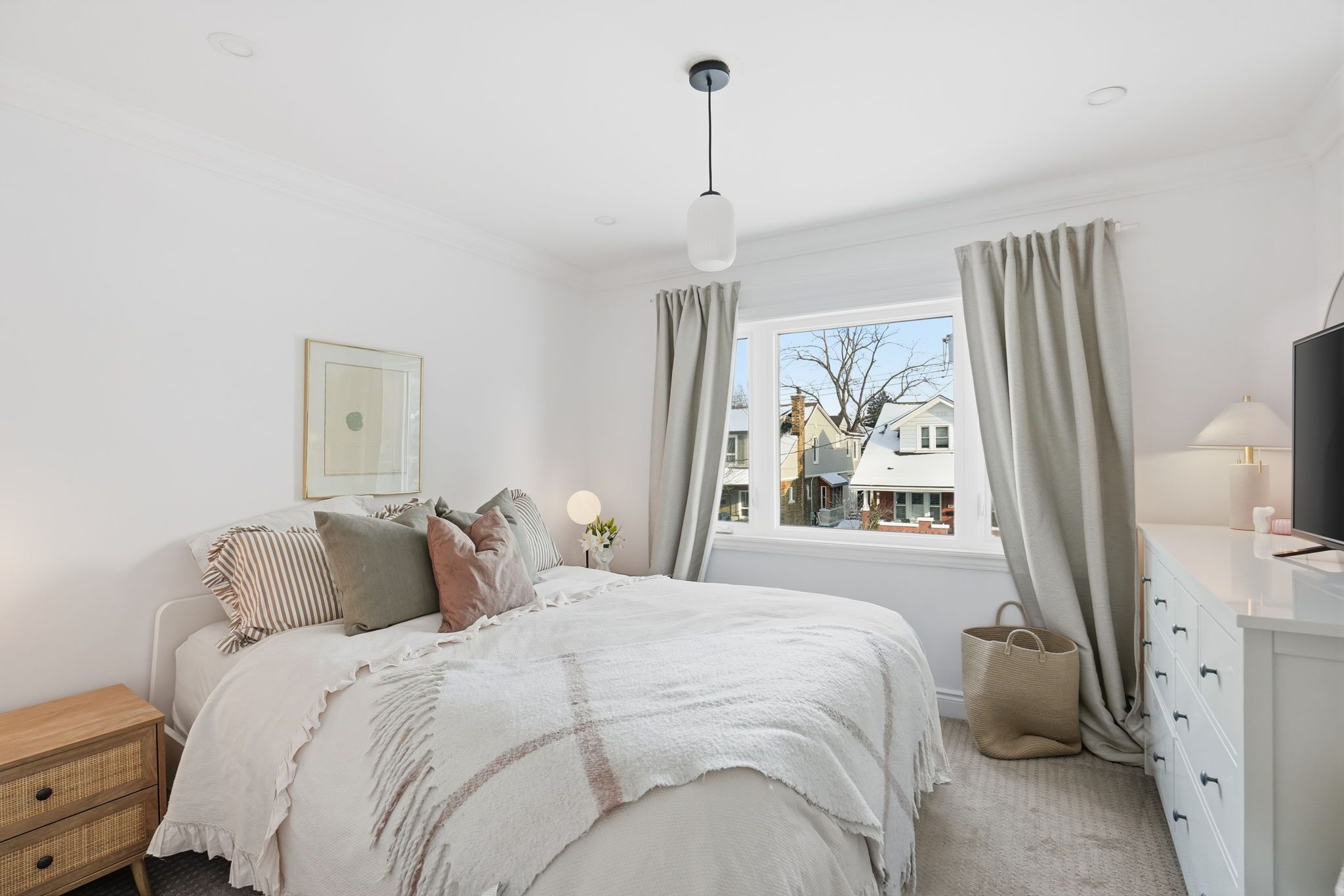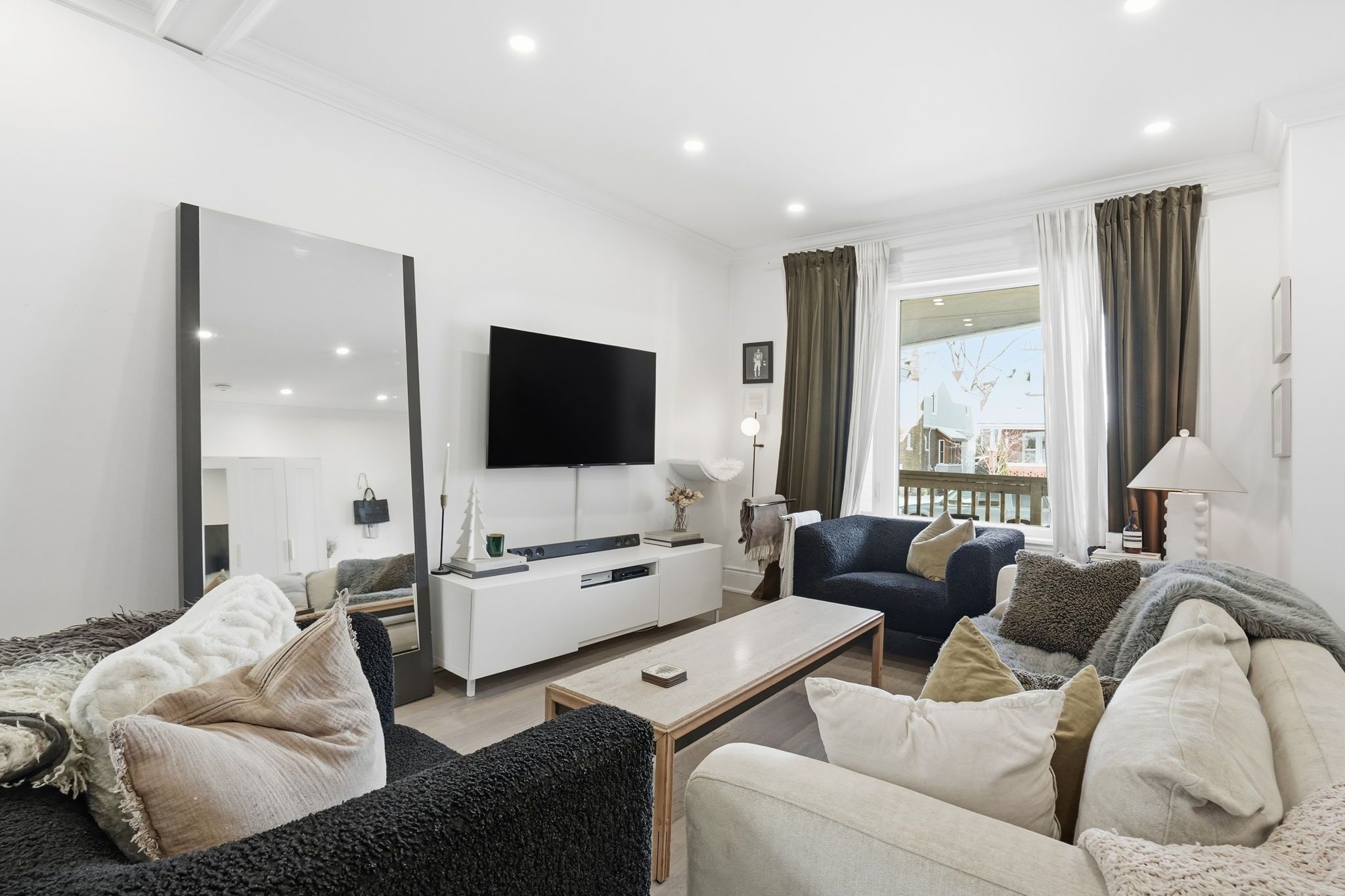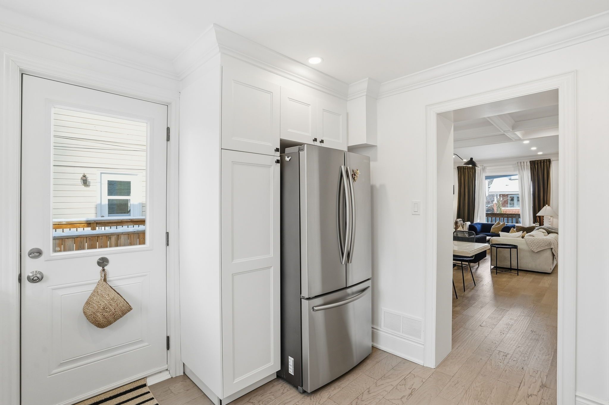 • Bright living space featuring engineered hardwood and crown moulding.