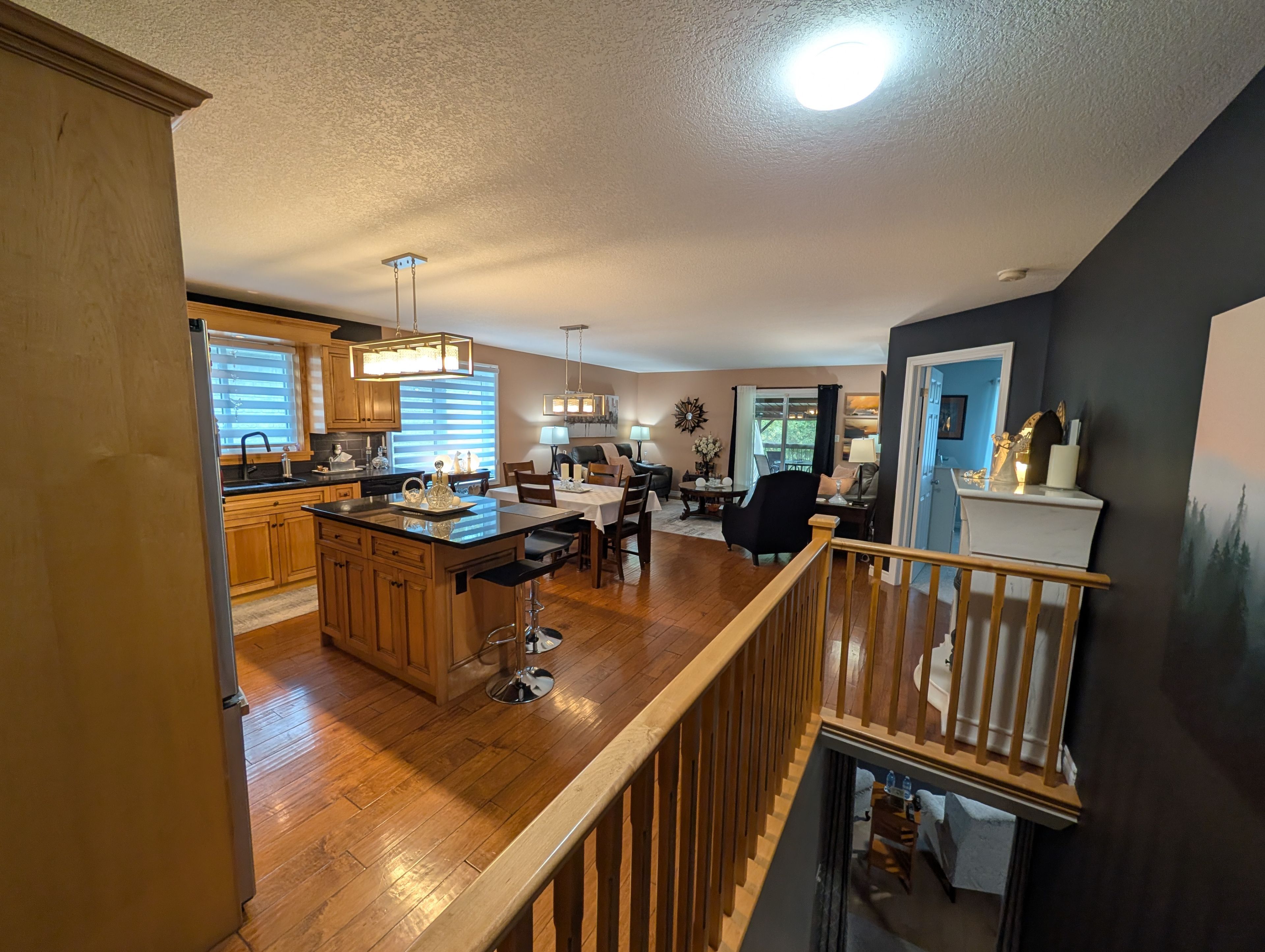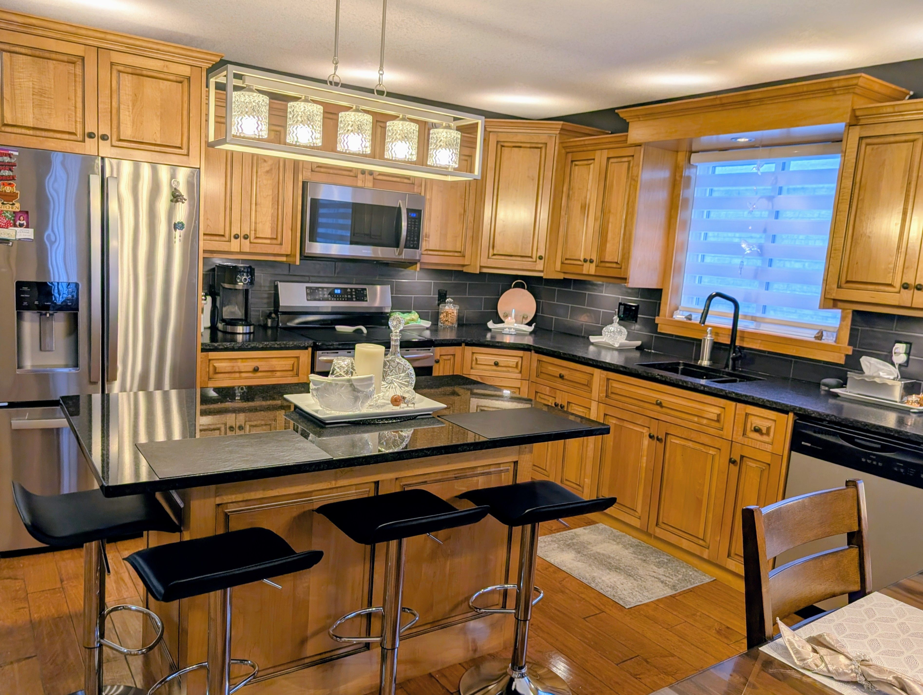 • Open-concept living, dining, and kitchen with modern maple cabinets and granite countertops.