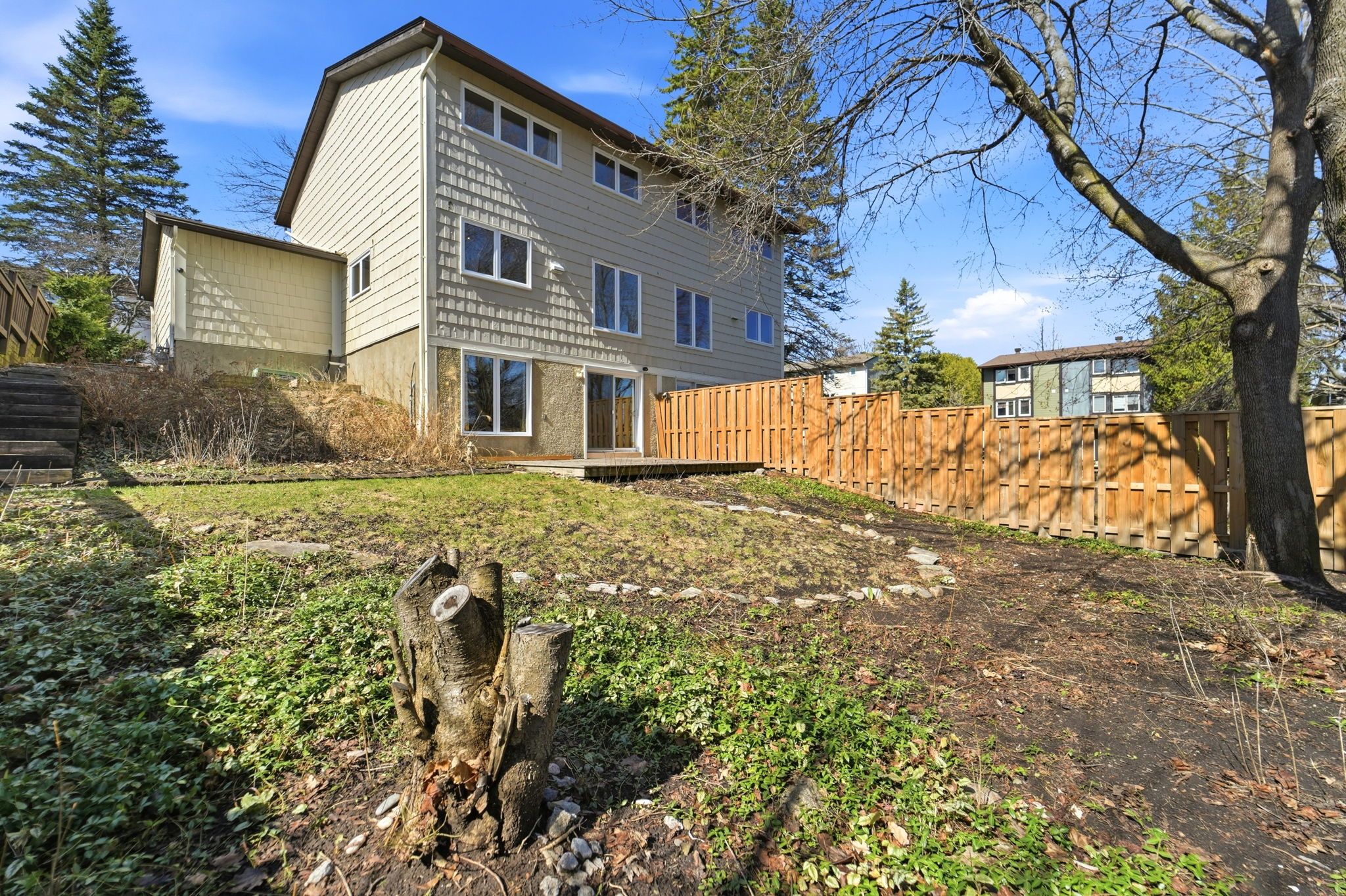 • Private backyard with a wood deck and mature greenery.