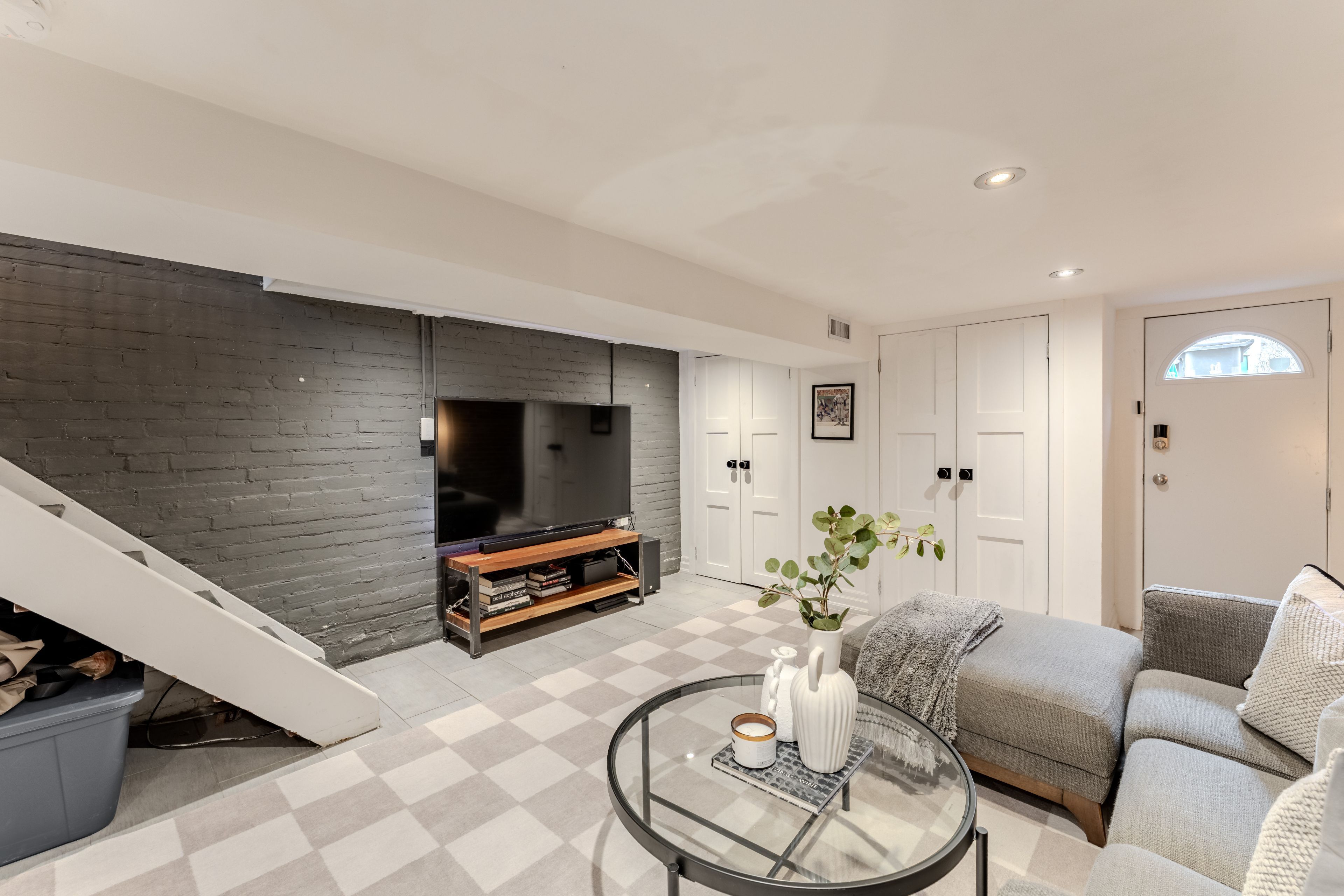 • Charming basement with exposed brick wall, perfect for relaxation or entertaining.