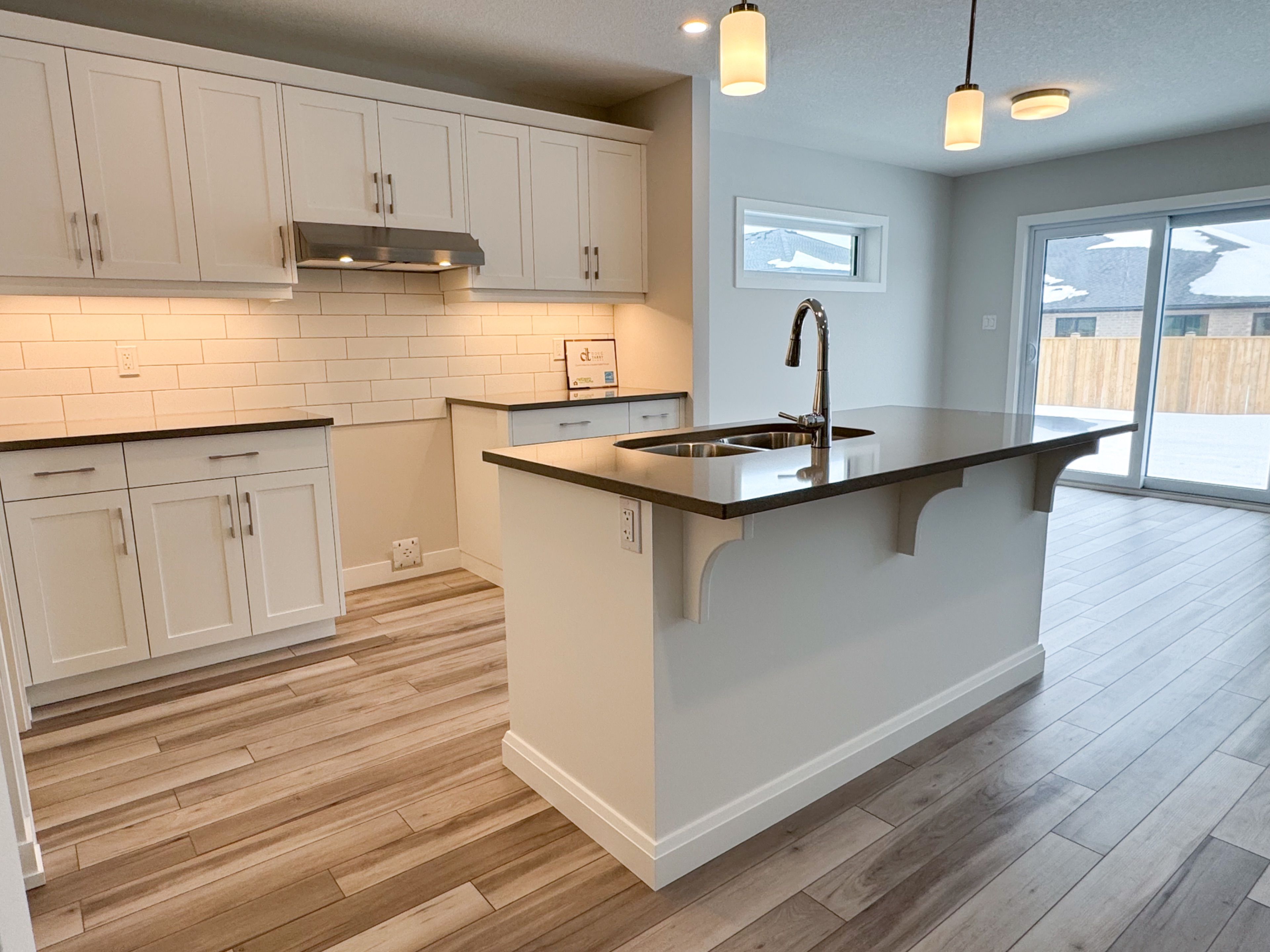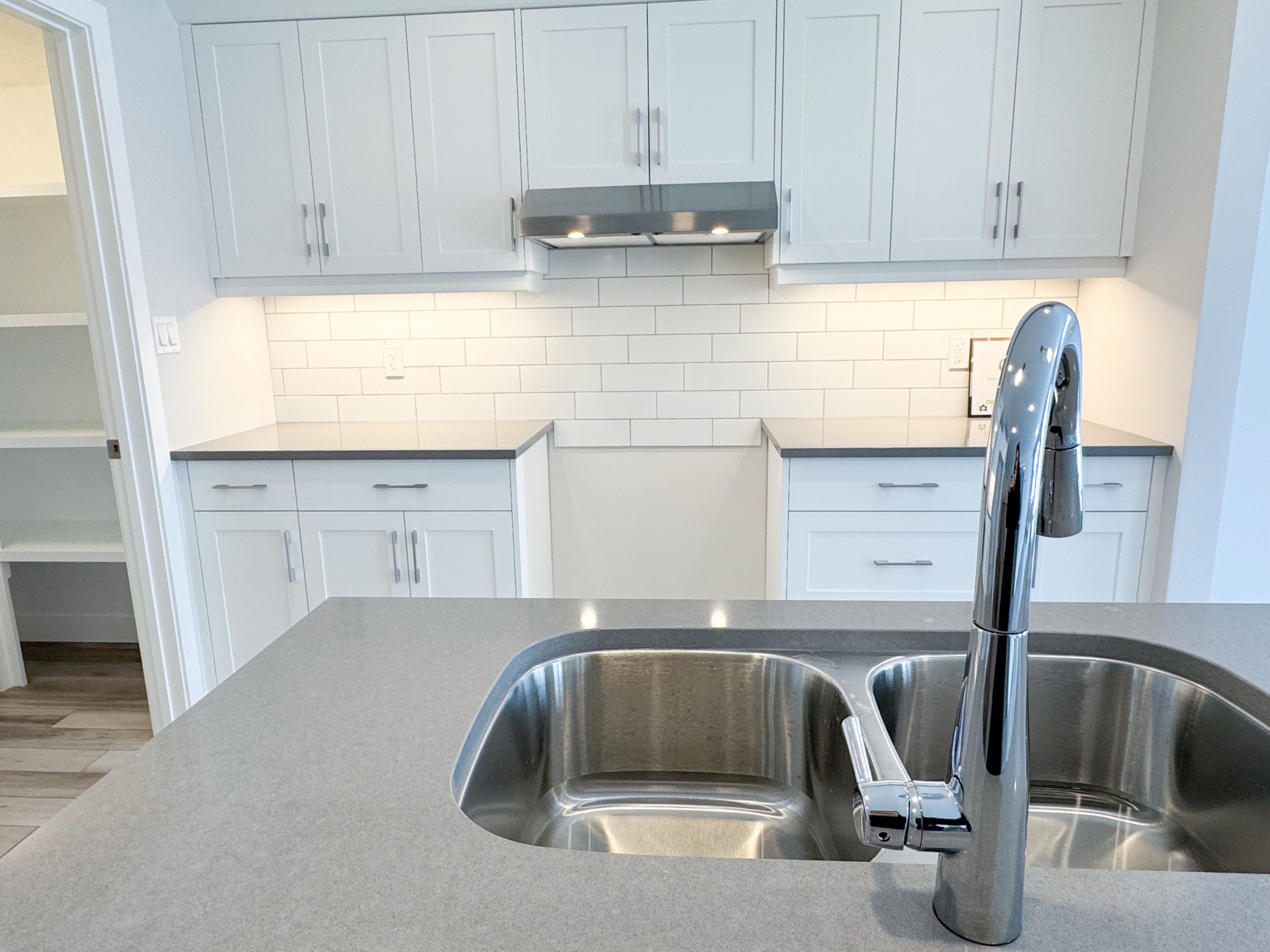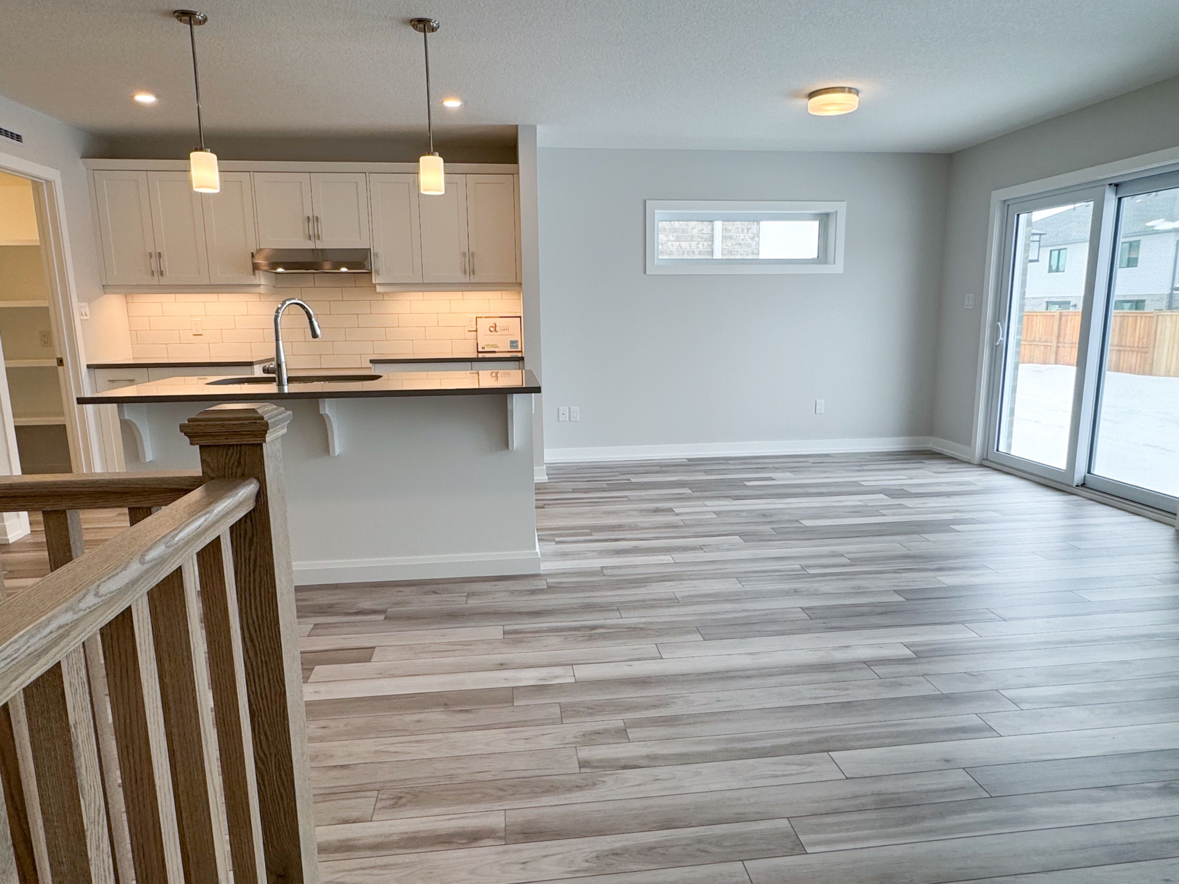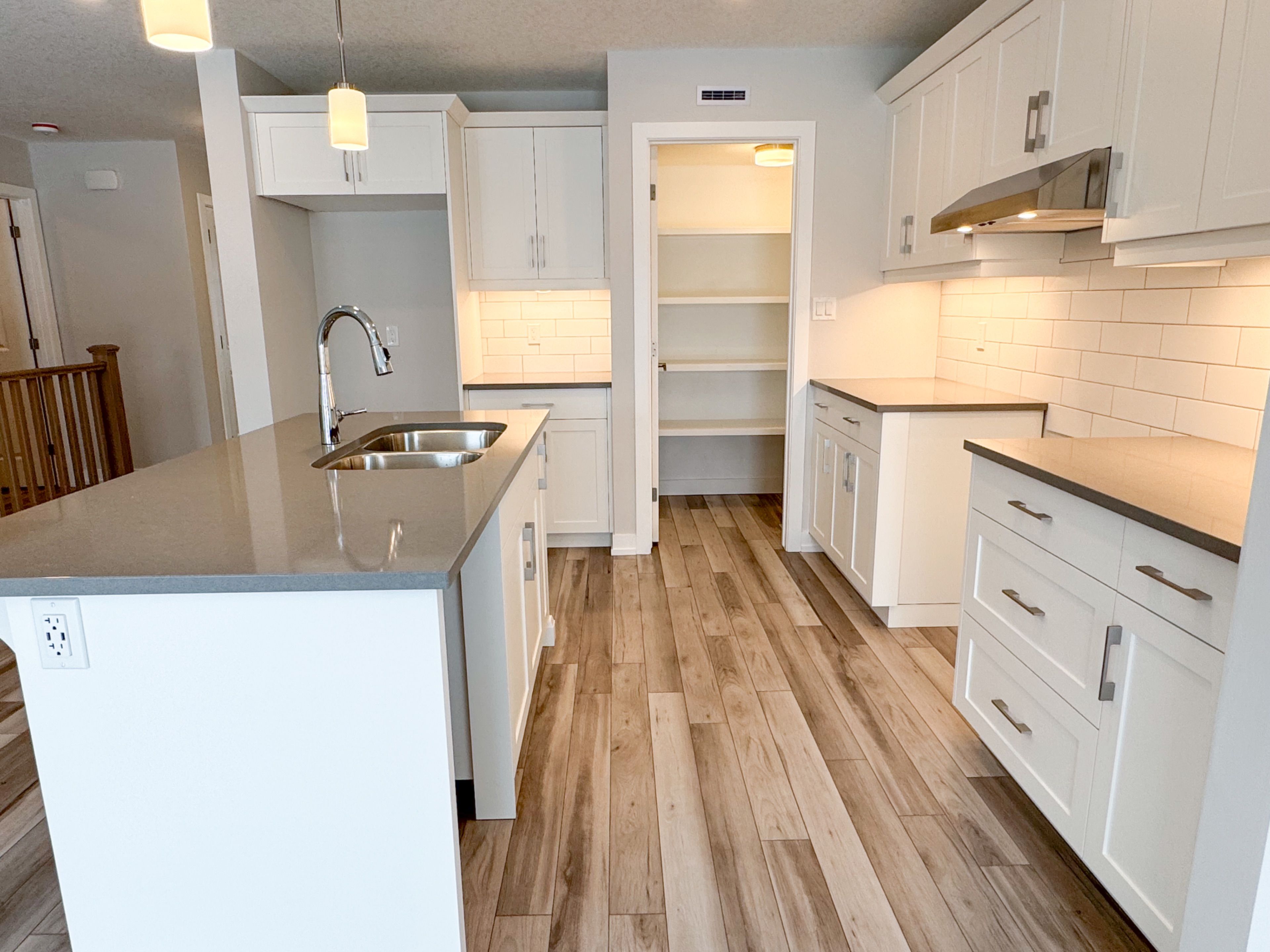 • Open concept kitchen with quartz island and large pantry.