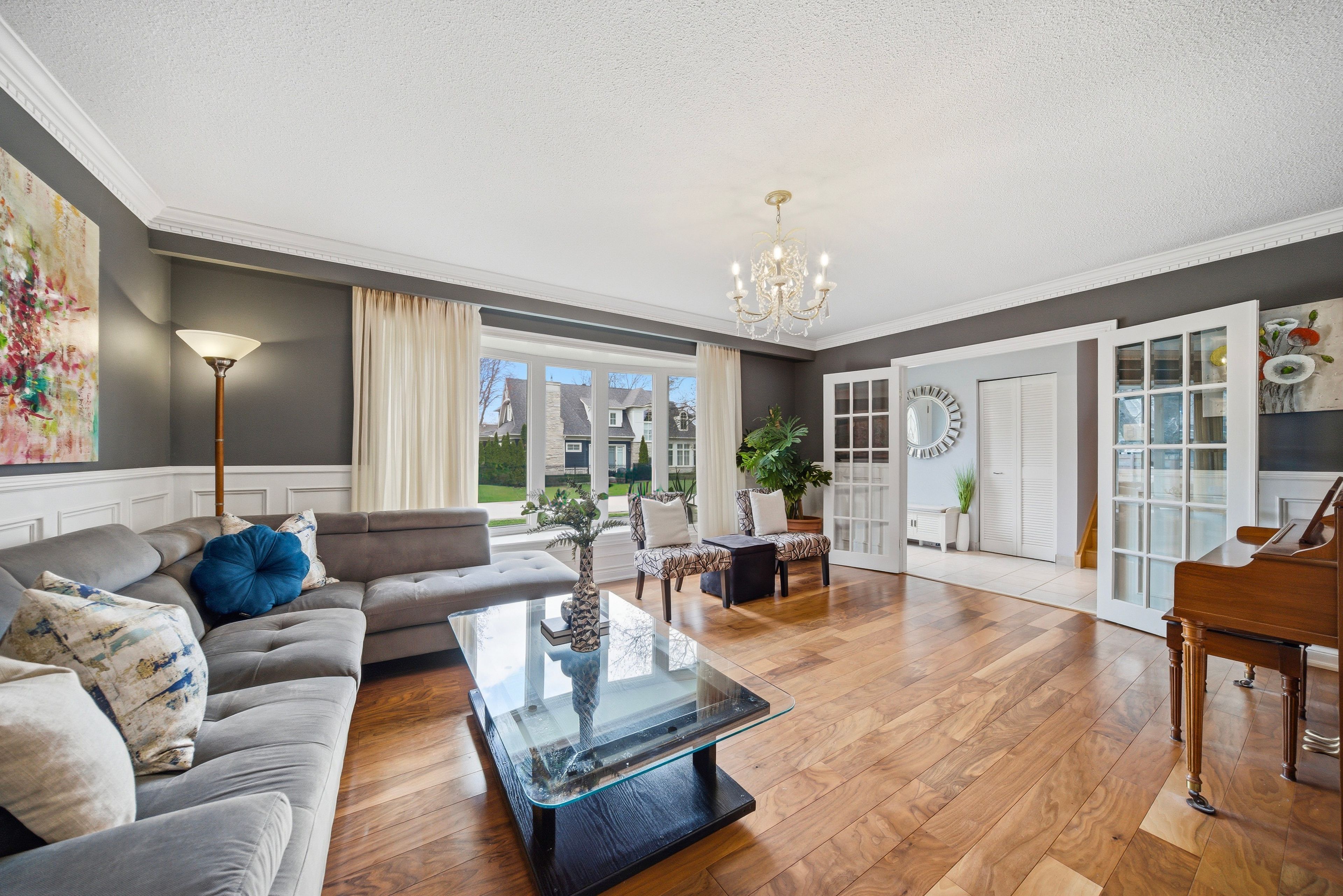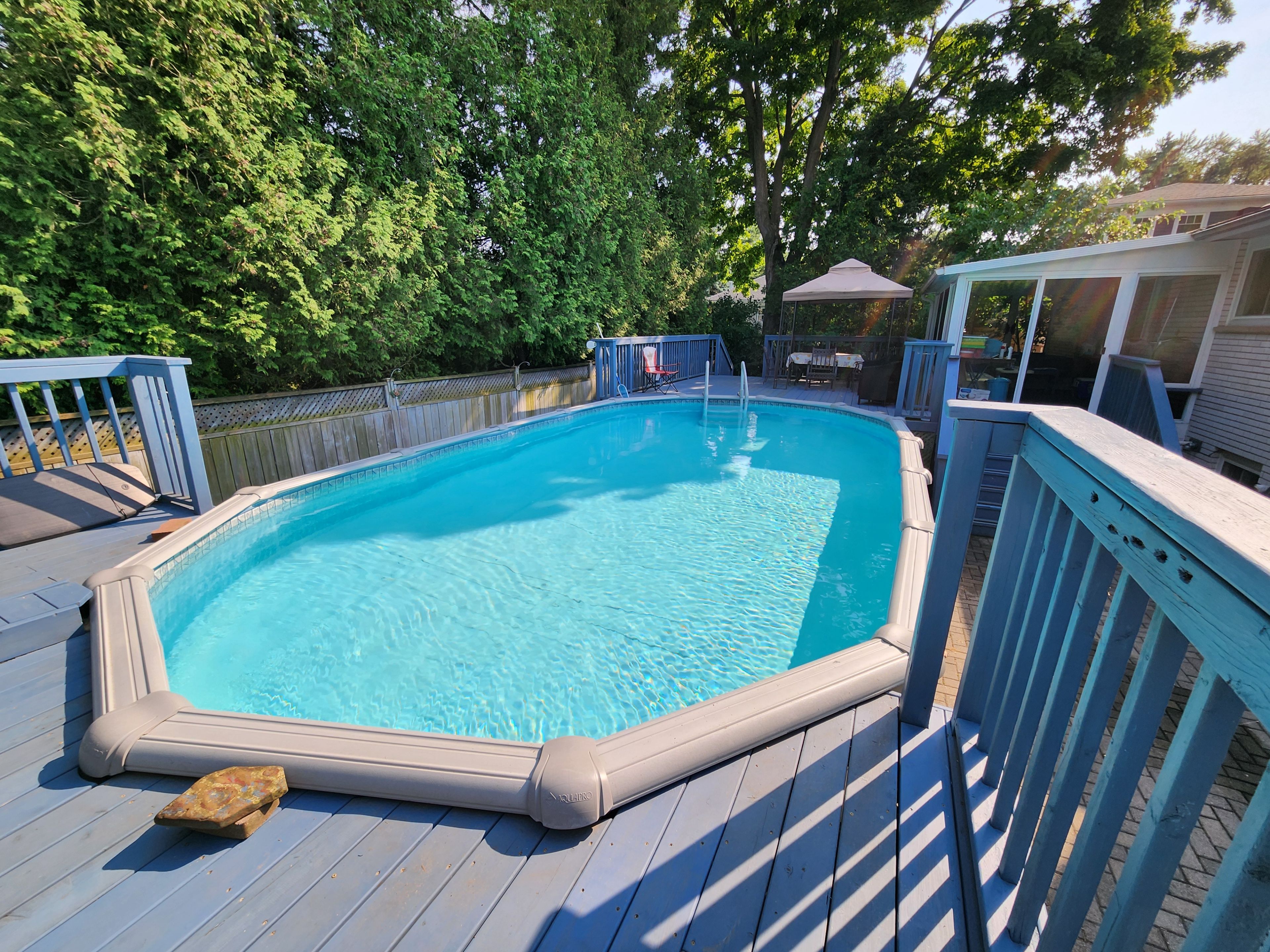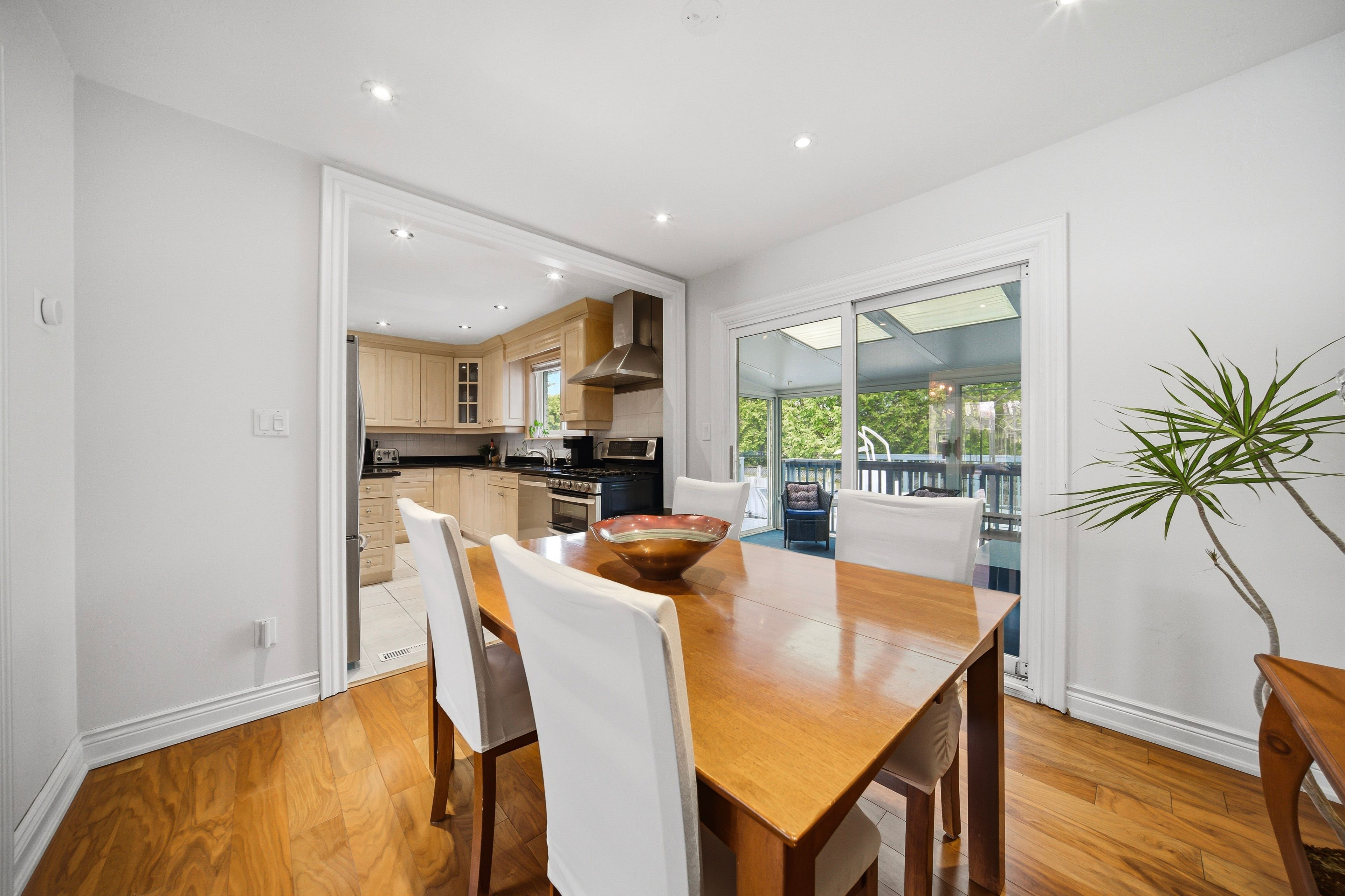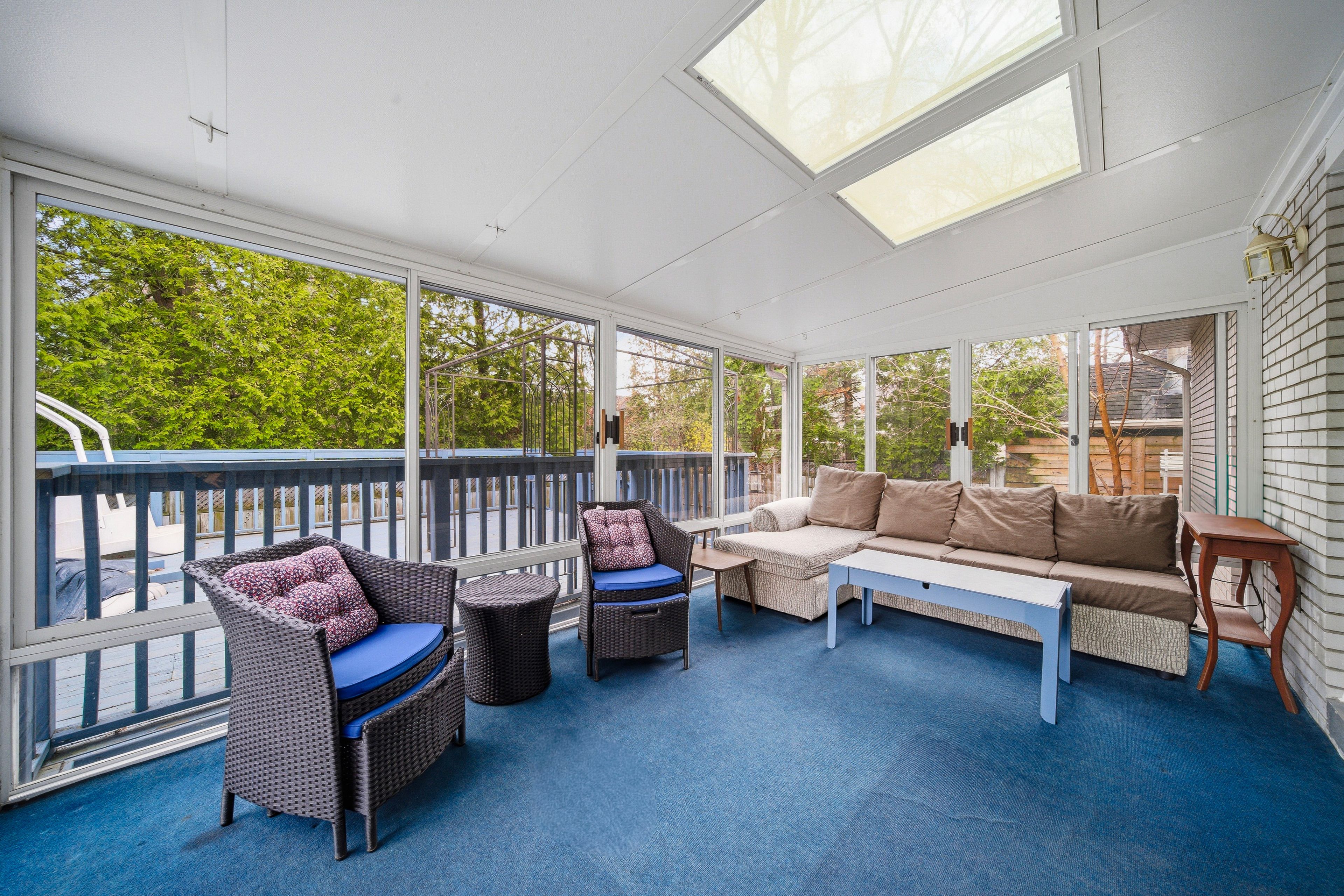 Stunning four-level side split in highly sought-after west oakville. Completely private and tranquil rear yard oasis features a custom 17' x 17' wood deck, surrounded by mature trees, a bright sunroom with sliding windows, a sparkling above-ground pool, and an interlock patio ideal for relaxing or entertaining. Elegant living and dining rooms feature rich hardwood flooring, french doors, crown moulding, wainscoting, and a large bay window. Upgraded kitchen blends style and functionality with granite countertops, a breakfast bar, ample cabinetry, and a reverse osmosis water filtration tap. Offering 3 + 1 bedrooms, with three on the upper level and one on the lower level, this home also features a custom, wood-panelled library/family room with a hampton wood-burning fireplace, along with a beautifully renovated bathroom featuring imported tile, a curbless shower, and a premium riobel rainfall system and heated towel rack. Professionally finished basement includes a recreation room with a gas fireplace, laminate flooring, and a dedicated exercise area. Wired ethernet ports on three levels provide fast, reliable connectivity for modern living. Ideally located within walking distance to top-rated schools including brookside public school, thomas a. Blakelock high school, pine grove french immersion, and appleby college (one of canada's top private schools), as well as scenic trails, parks, and all amenities. A true gem in a beautiful, quiet neighbourhood.