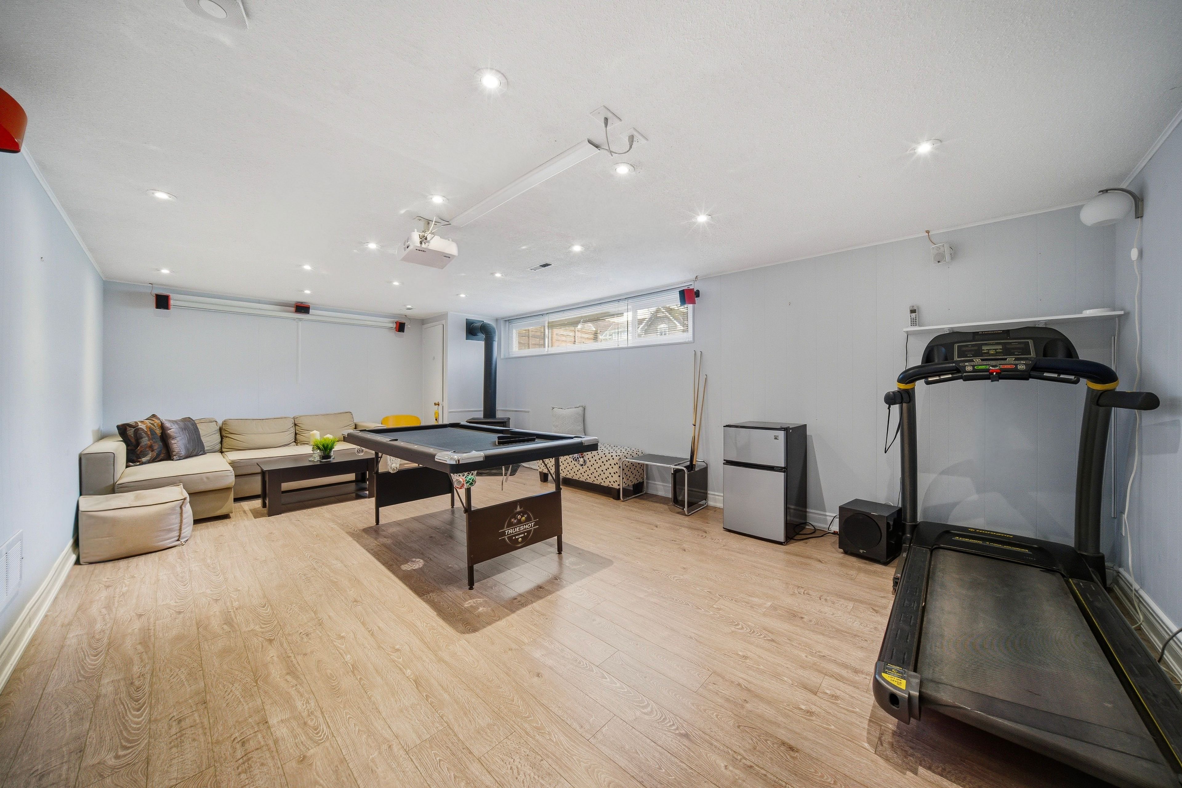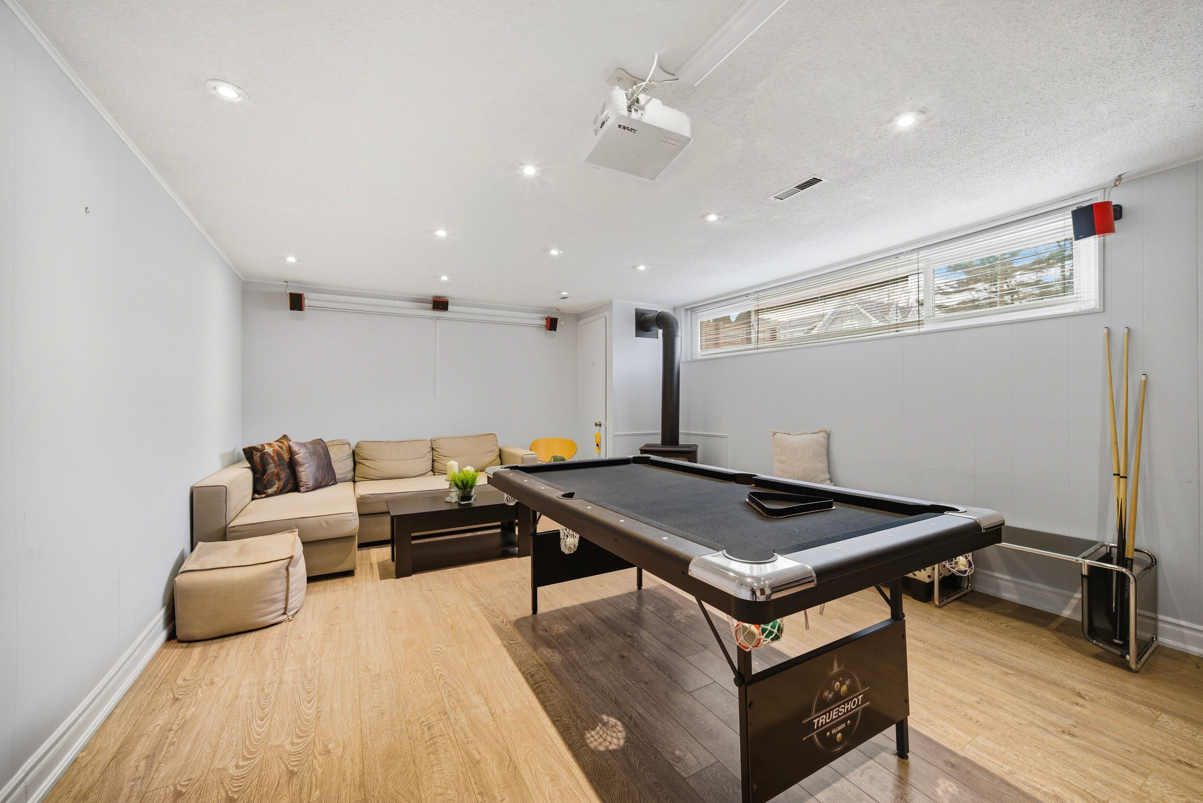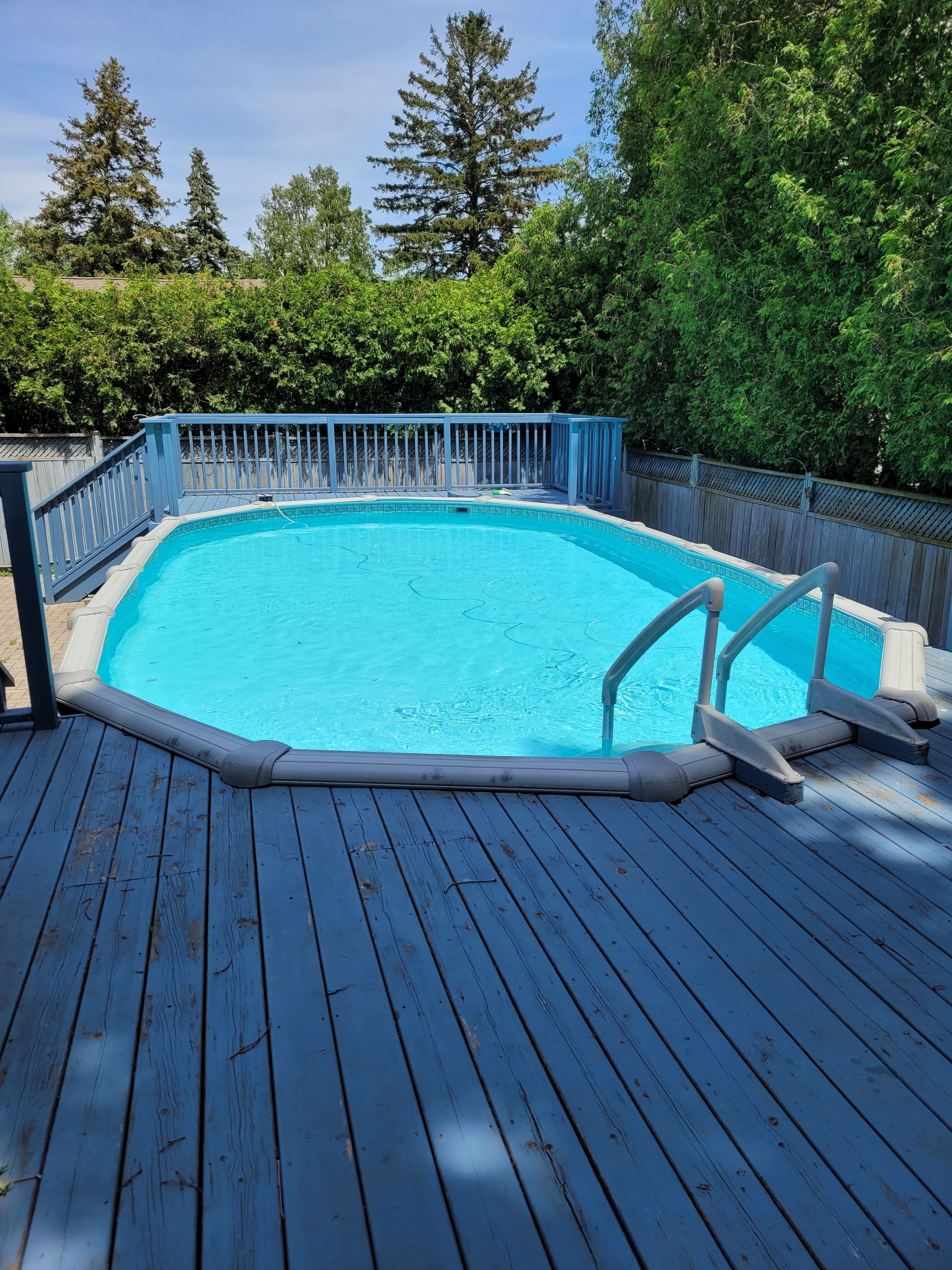 Stunning four-level side split in highly sought-after west oakville. Completely private and tranquil rear yard oasis features a custom 17' x 17' wood deck, surrounded by mature trees, a bright sunroom with sliding windows, a sparkling above-ground pool, and an interlock patio ideal for relaxing or entertaining. Elegant living and dining rooms feature rich hardwood flooring, french doors, crown moulding, wainscoting, and a large bay window. Upgraded kitchen blends style and functionality with granite countertops, a breakfast bar, ample cabinetry, and a reverse osmosis water filtration tap. Offering 3 + 1 bedrooms, with three on the upper level and one on the lower level, this home also features a custom, wood-panelled library/family room with a hampton wood-burning fireplace, along with a beautifully renovated bathroom featuring imported tile, a curbless shower, and a premium riobel rainfall system and heated towel rack. Professionally finished basement includes a recreation room with a gas fireplace, laminate flooring, and a dedicated exercise area. Wired ethernet ports on three levels provide fast, reliable connectivity for modern living. Ideally located within walking distance to top-rated schools including brookside public school, thomas a. Blakelock high school, pine grove french immersion, and appleby college (one of canada's top private schools), as well as scenic trails, parks, and all amenities. A true gem in a beautiful, quiet neighbourhood.