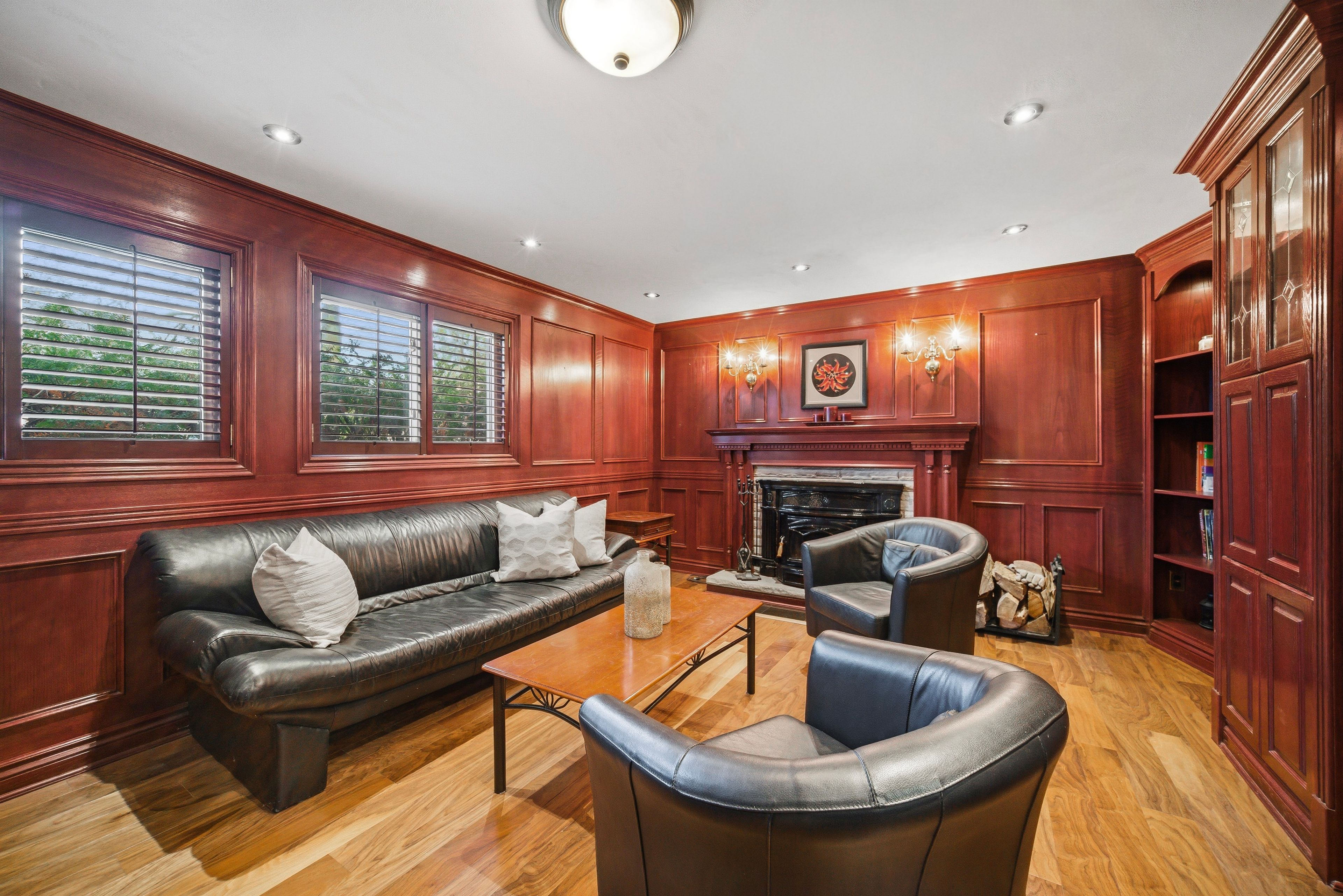 • Custom library/family room with wood-burning fireplace for cozy gatherings.