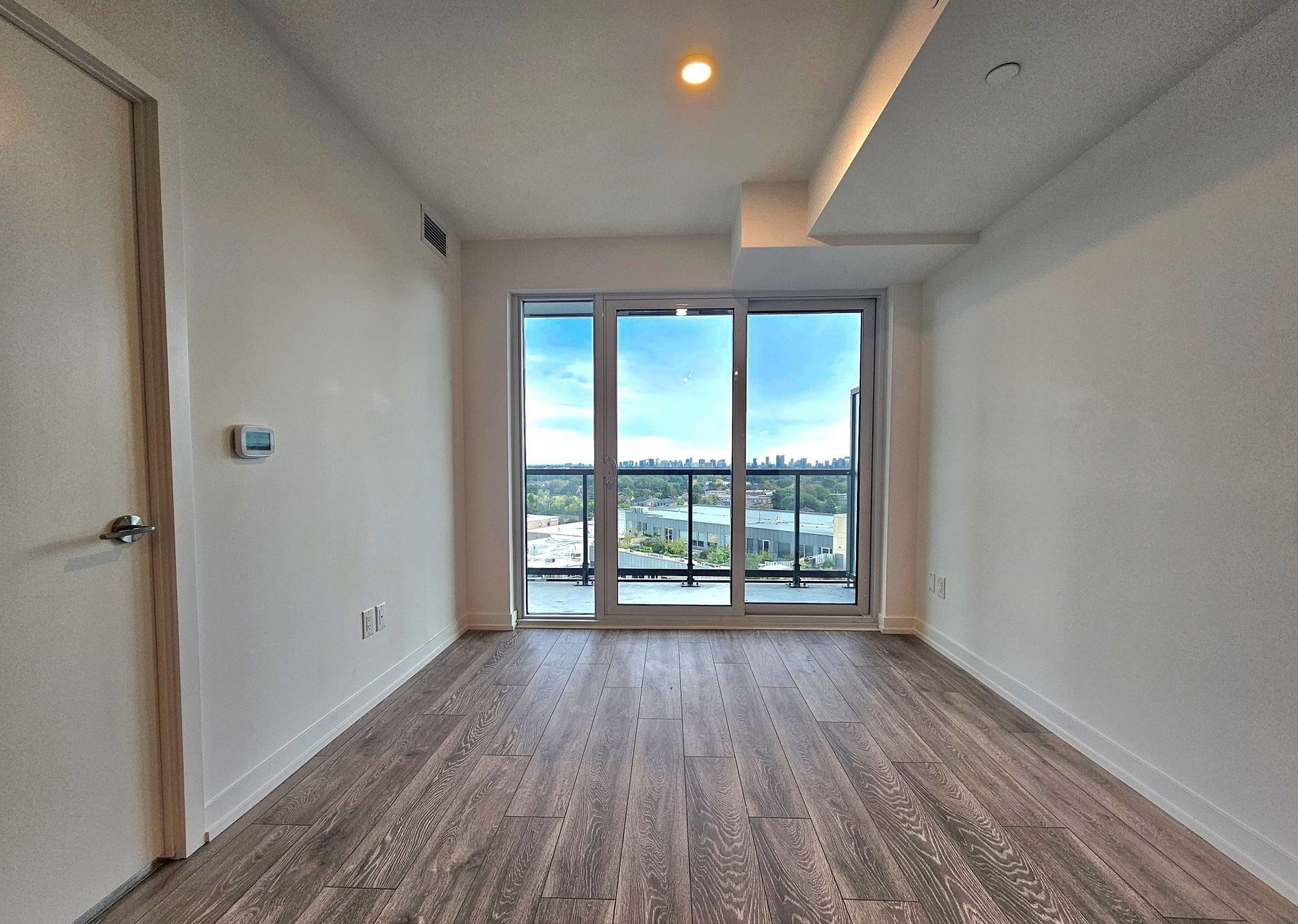 • Open-concept layout with laminate flooring and floor-to-ceiling windows.
