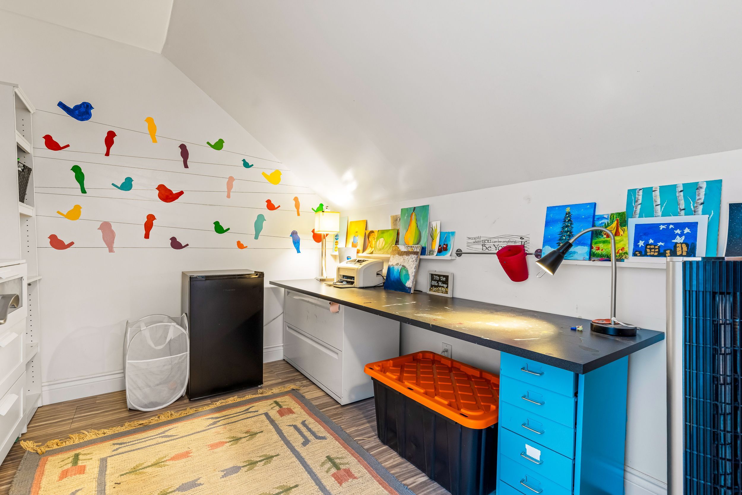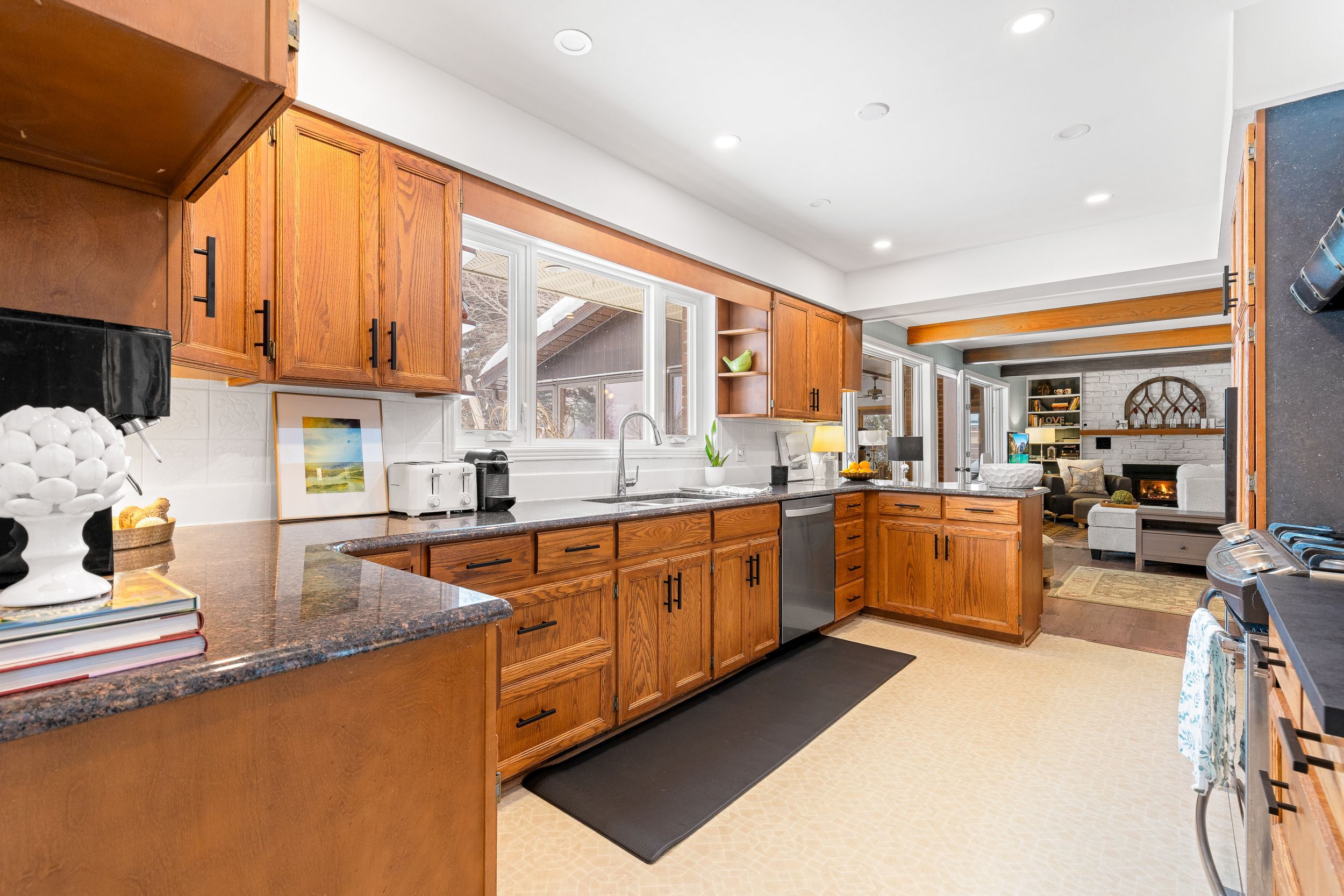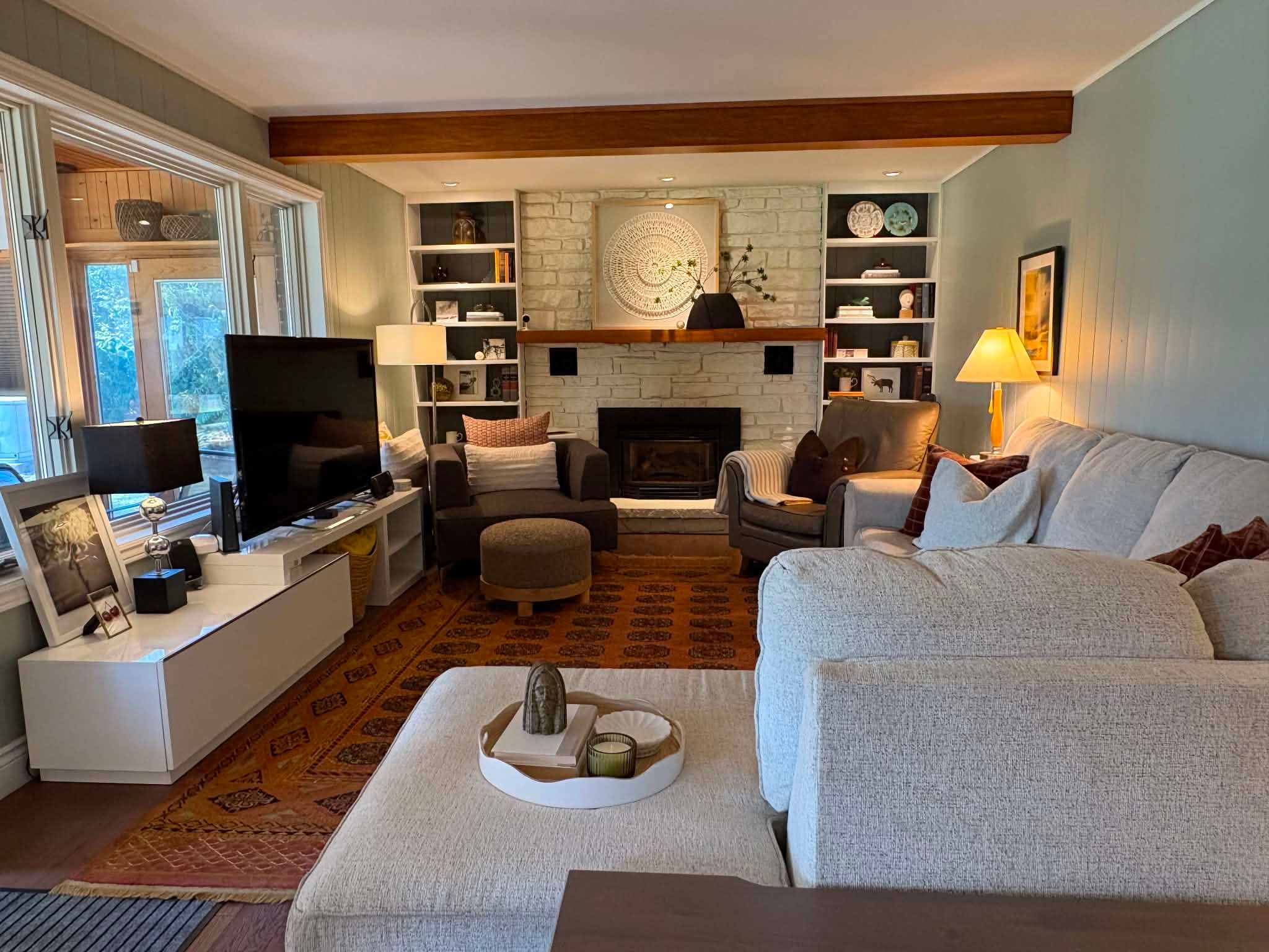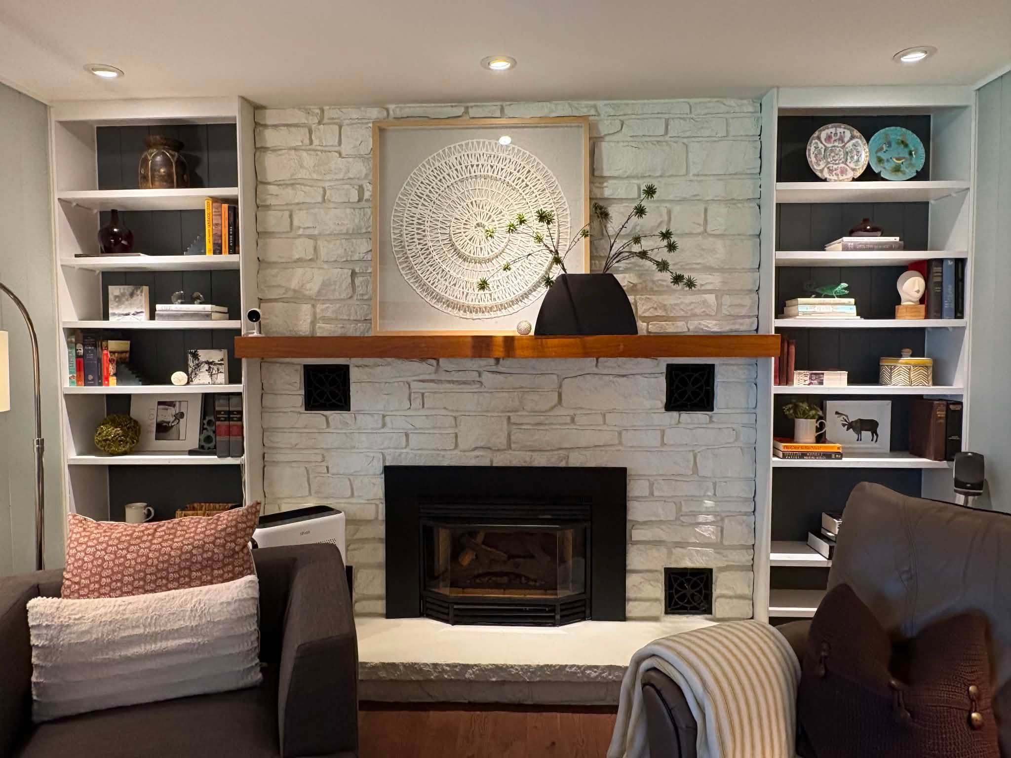 • Cozy family room with gas fireplace and built-in bookshelves.