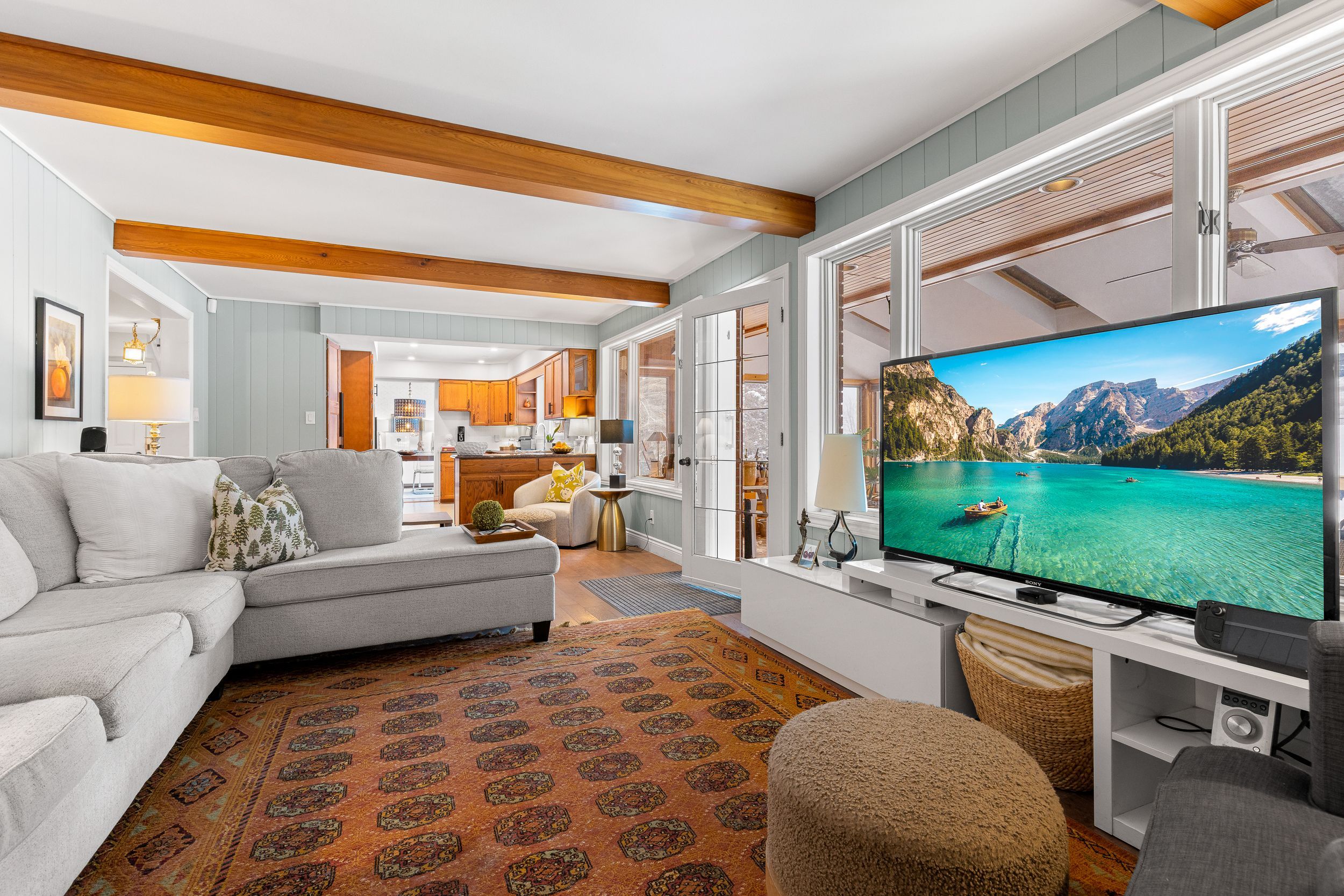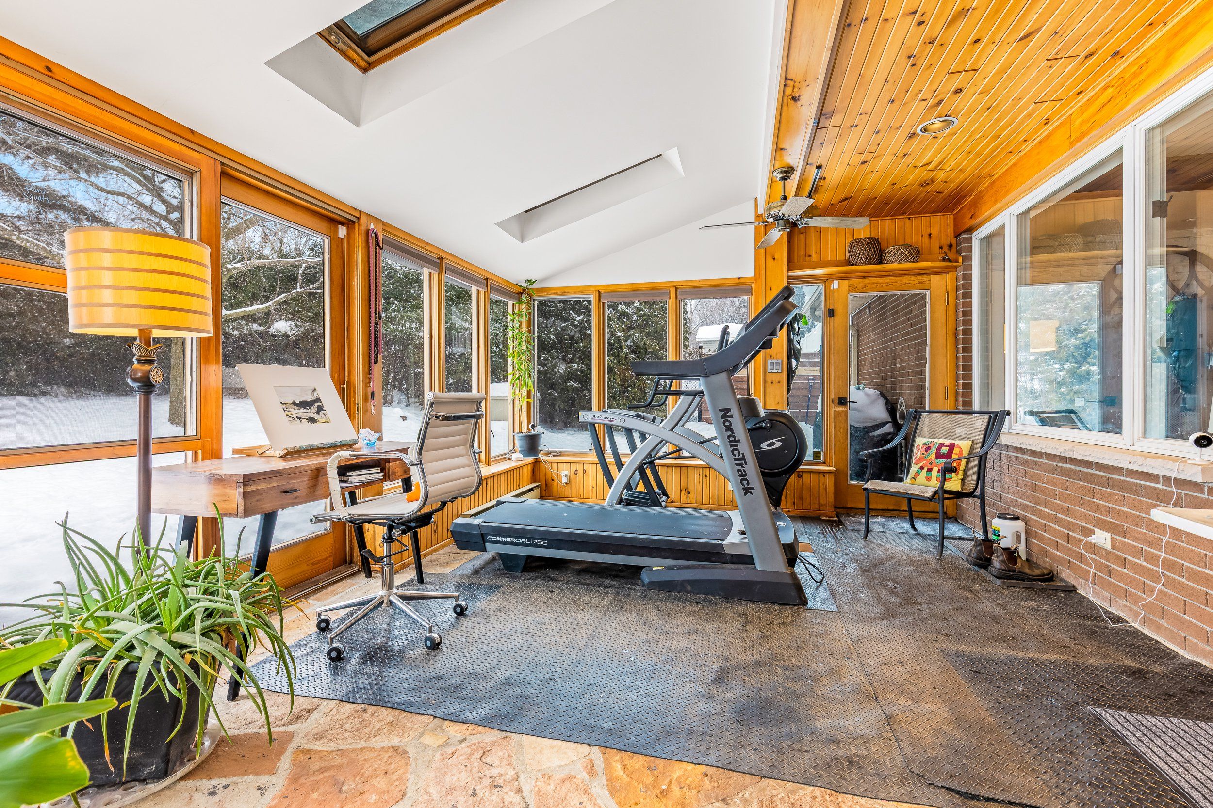 • Four-season atrium featuring flagstone flooring and expansive windows.