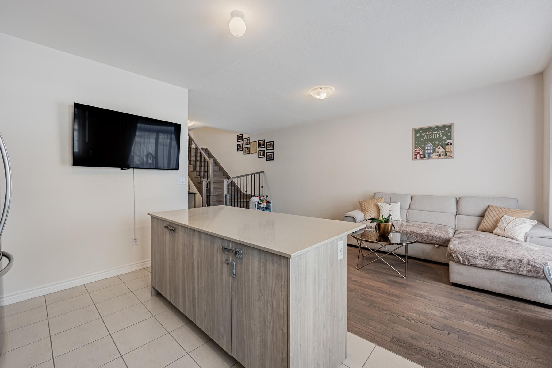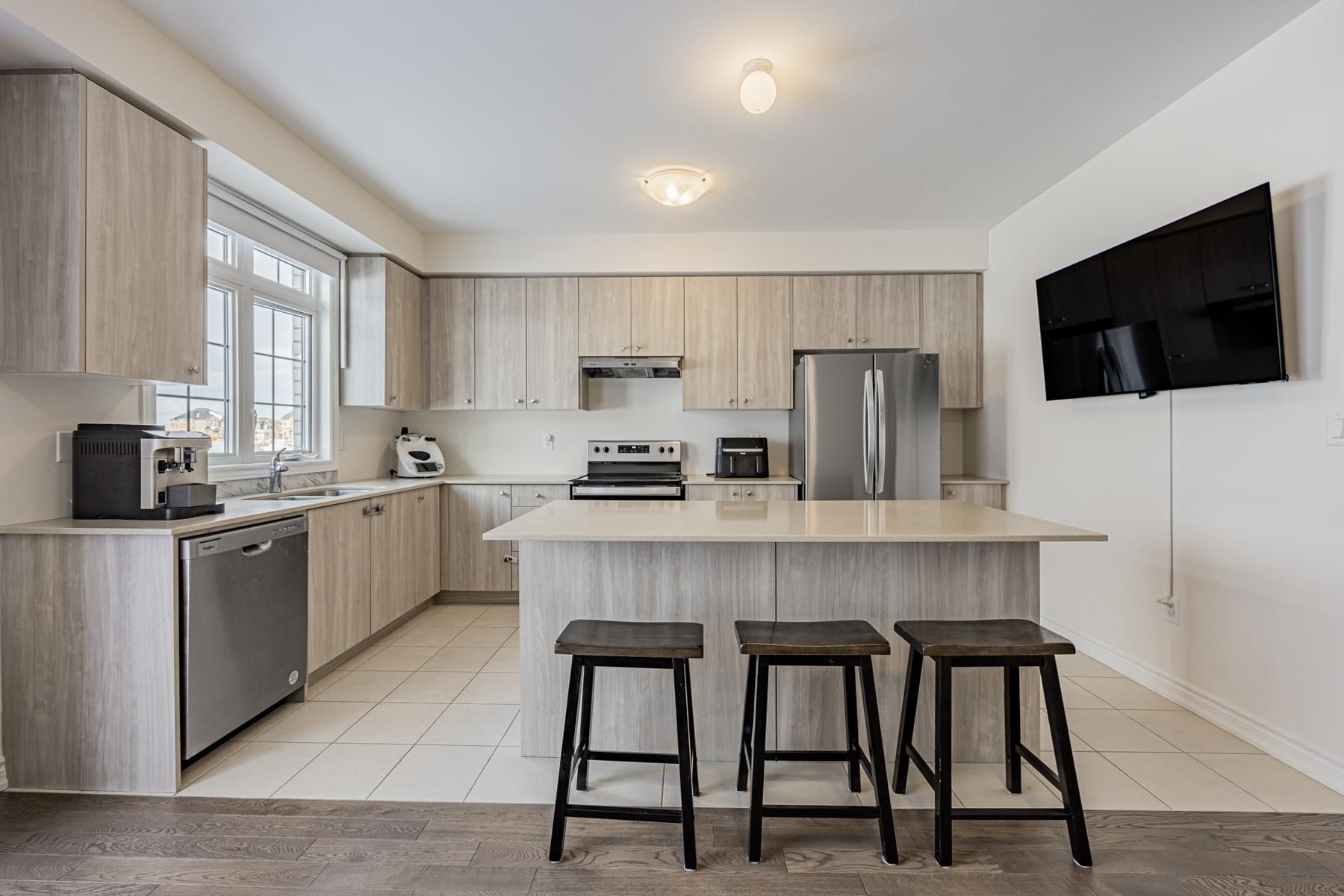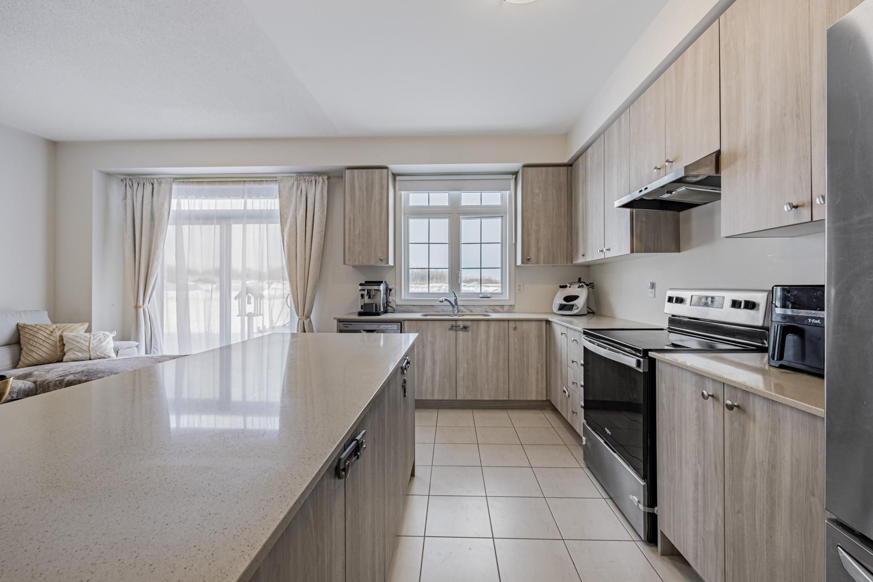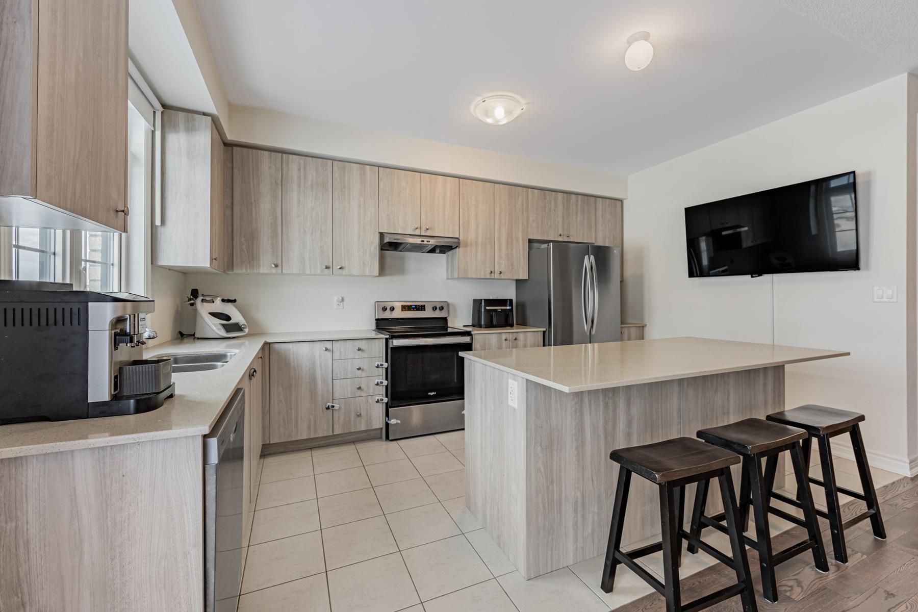 • Modern kitchen with quartz countertops and stainless steel appliances.