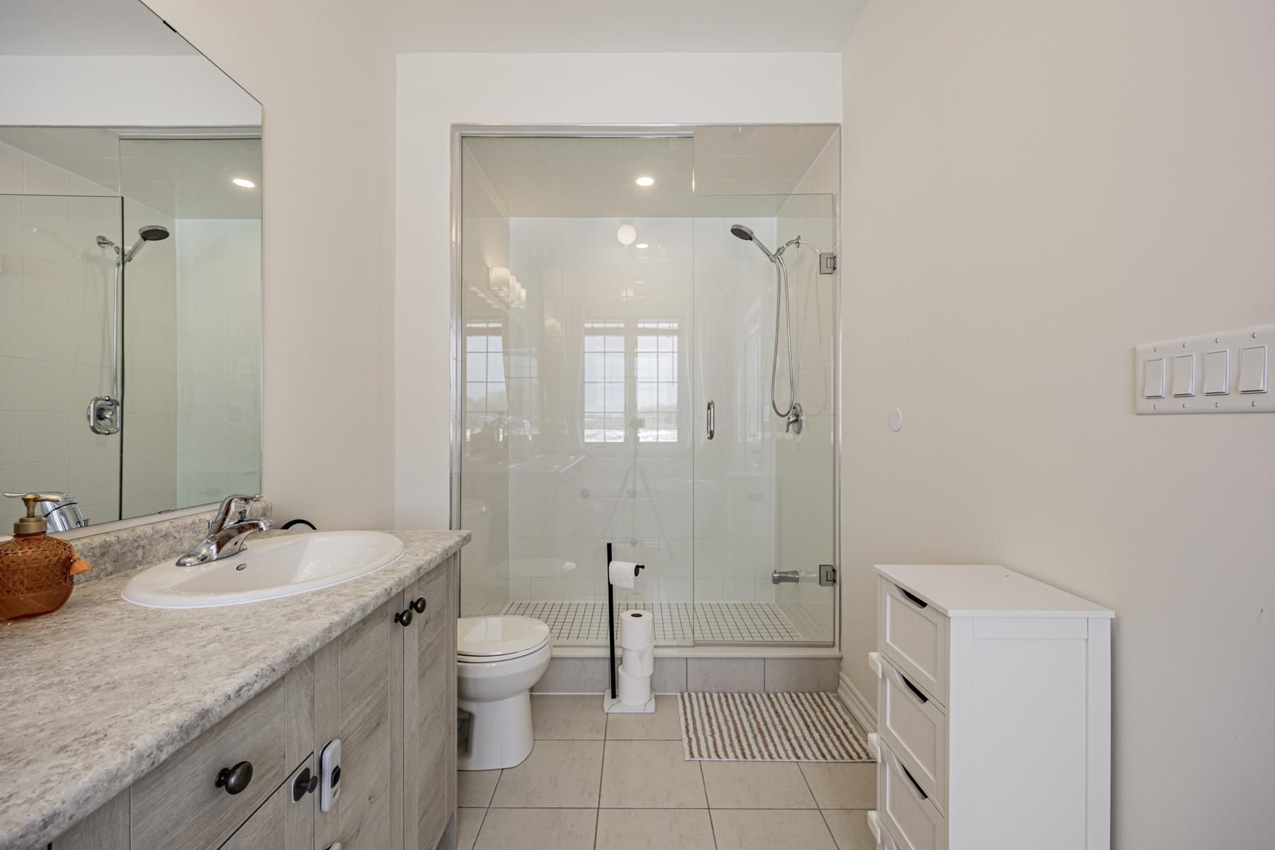 Stunning upgraded newer 2-storey semi-detached home featuring 3 bedrooms, 3 bathrooms and a single-car garage, located in a welcoming family-friendly neighbourhood in greenwood, pickering. Open-concept layout with 9-ft ceilings on all levels except the basement. The main floor offers a spacious great room combined with the dining room, highlighted by hardwood flooring throughout and an elegant staircase with iron pickets. Upgraded kitchen cabinetry with quartz countertops and stainless steel appliances. Legal side entrance provides excellent future potential. Primary bedroom features a luxurious ensuite with double sinks and a frameless glass shower. Convenient direct garage access plus an additional separate side entrance. Ideally located minutes to hwy 407 & 401, go station, shopping, schools, parks, trails and other amenities-offering exceptional comfort and convenience.