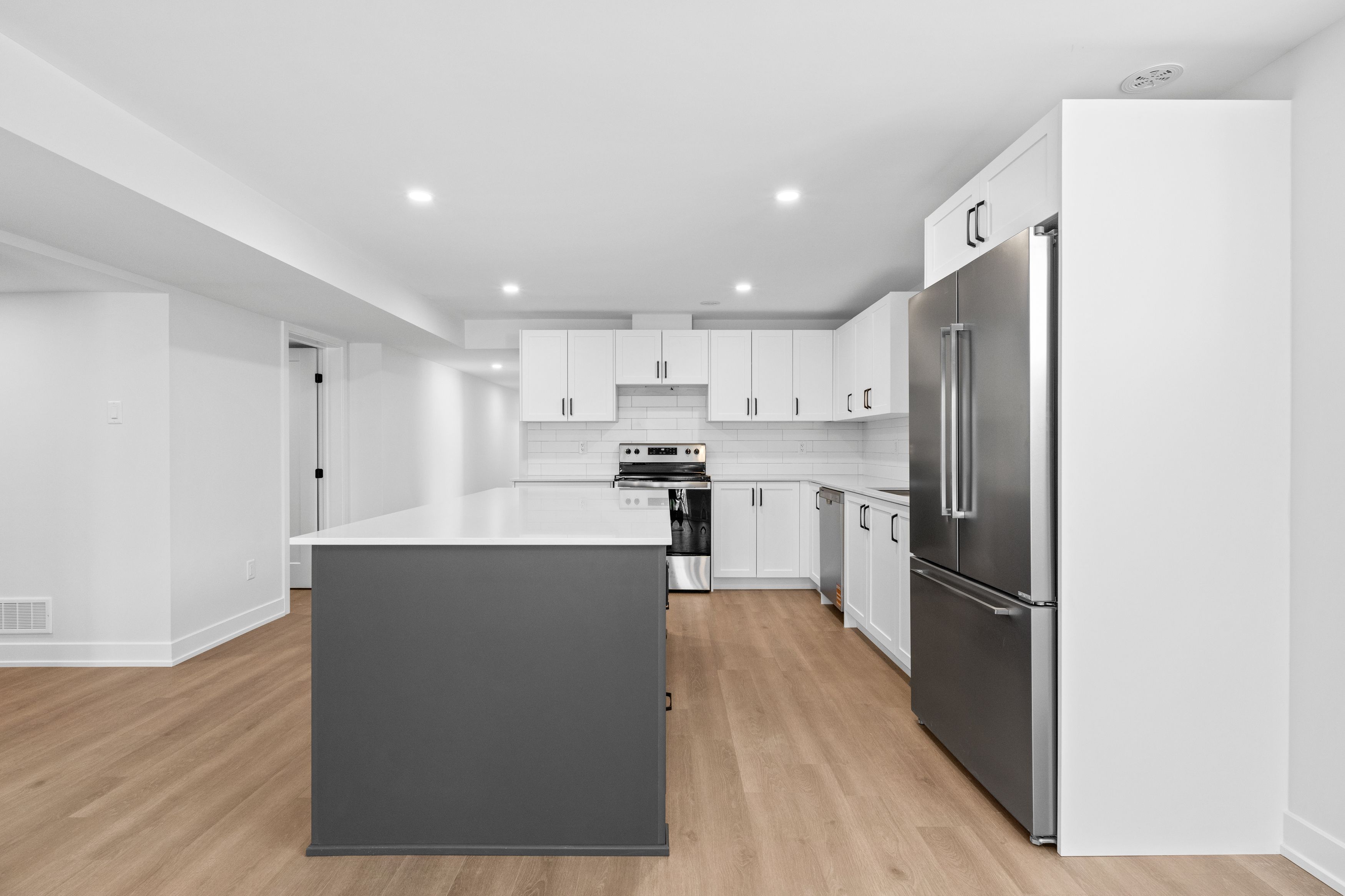 • Modern kitchen with quartz countertops and stainless steel appliances.