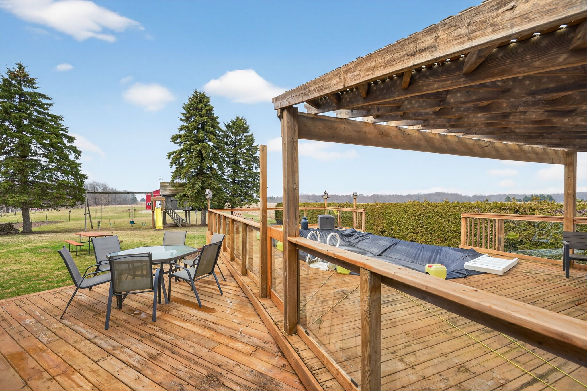 • Outdoor amenities include pasture, creek, and above-ground pool with covered deck.