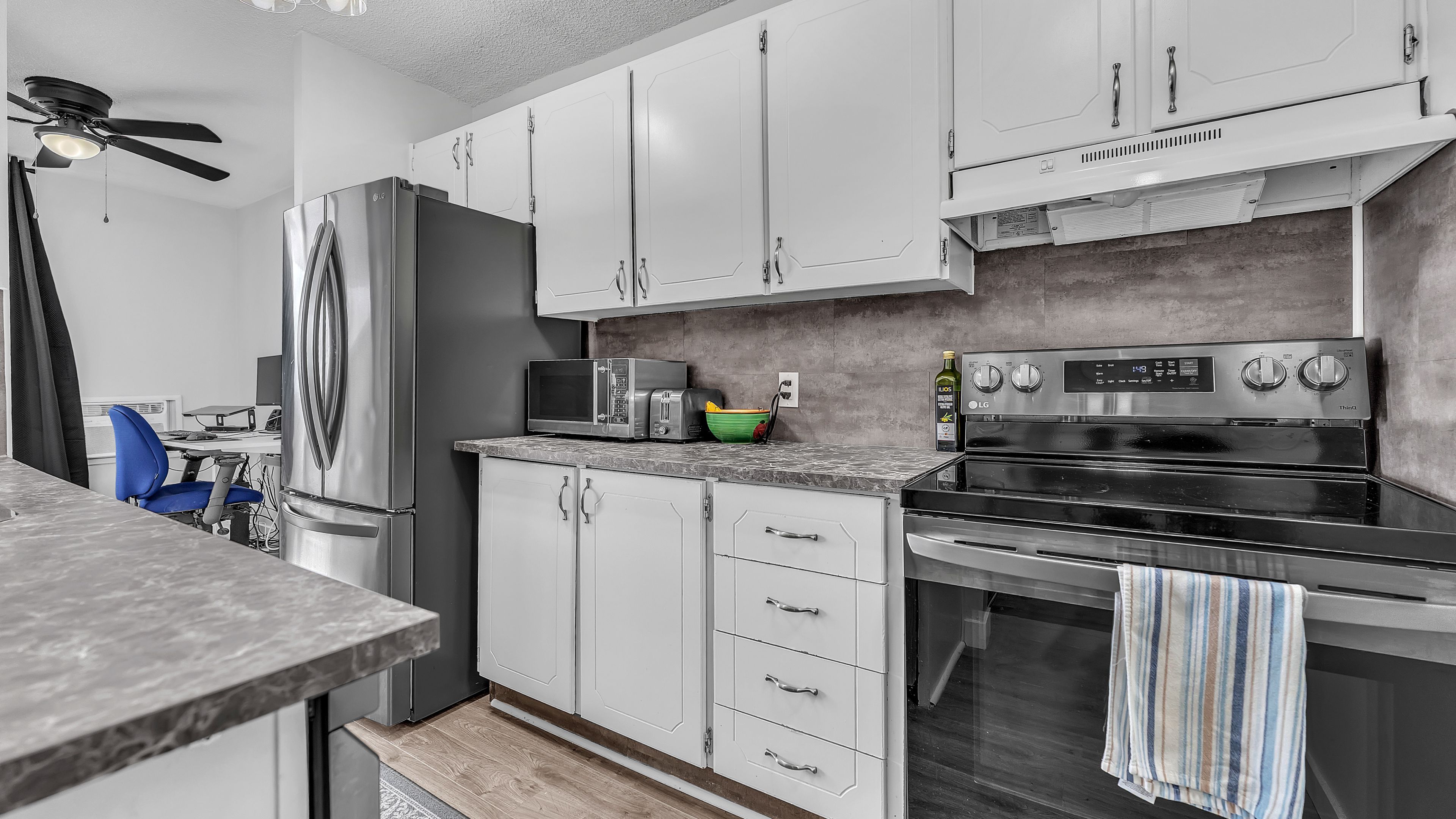 • Galley kitchen with newer appliances and modern fixtures for convenience.
