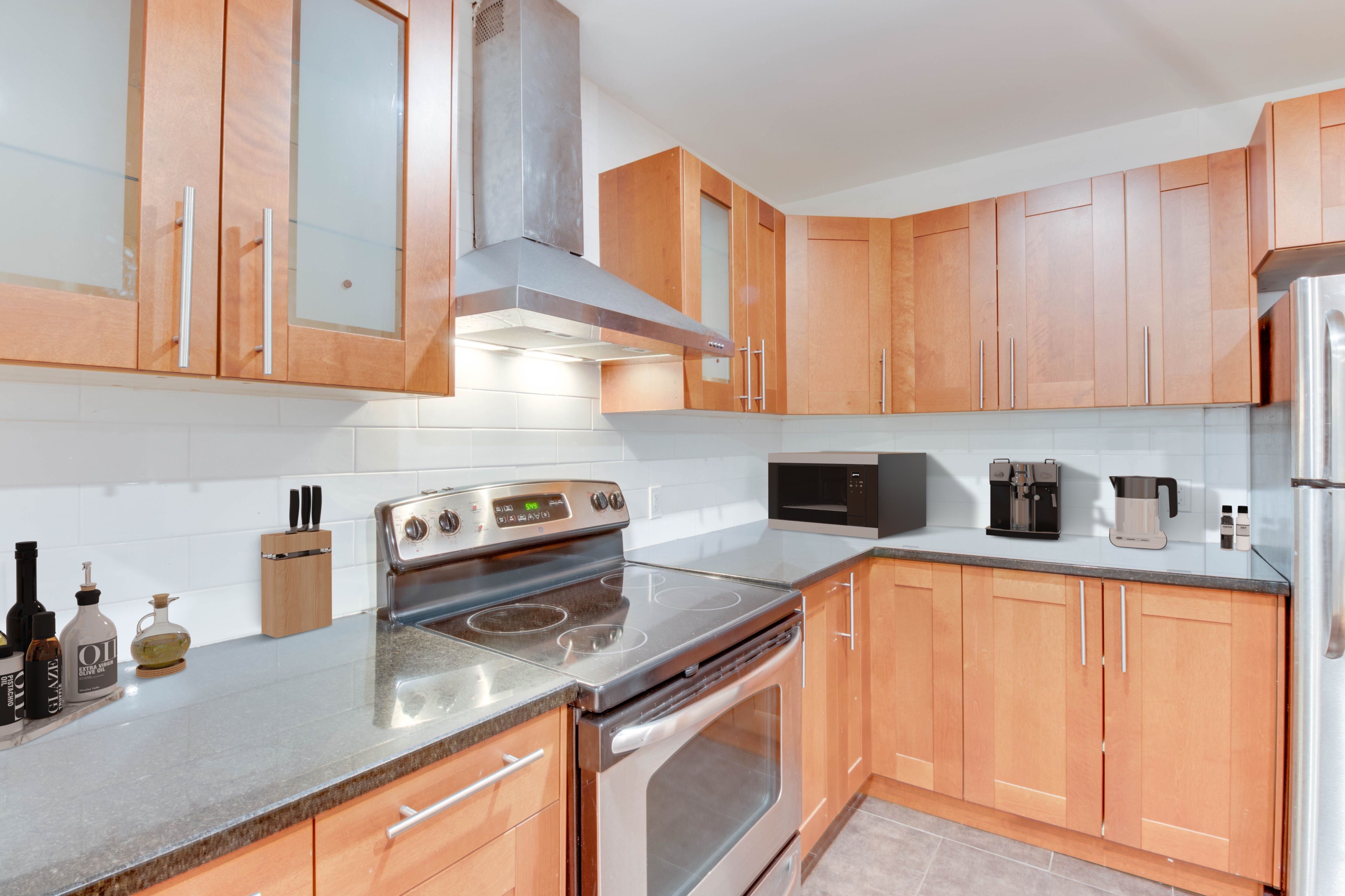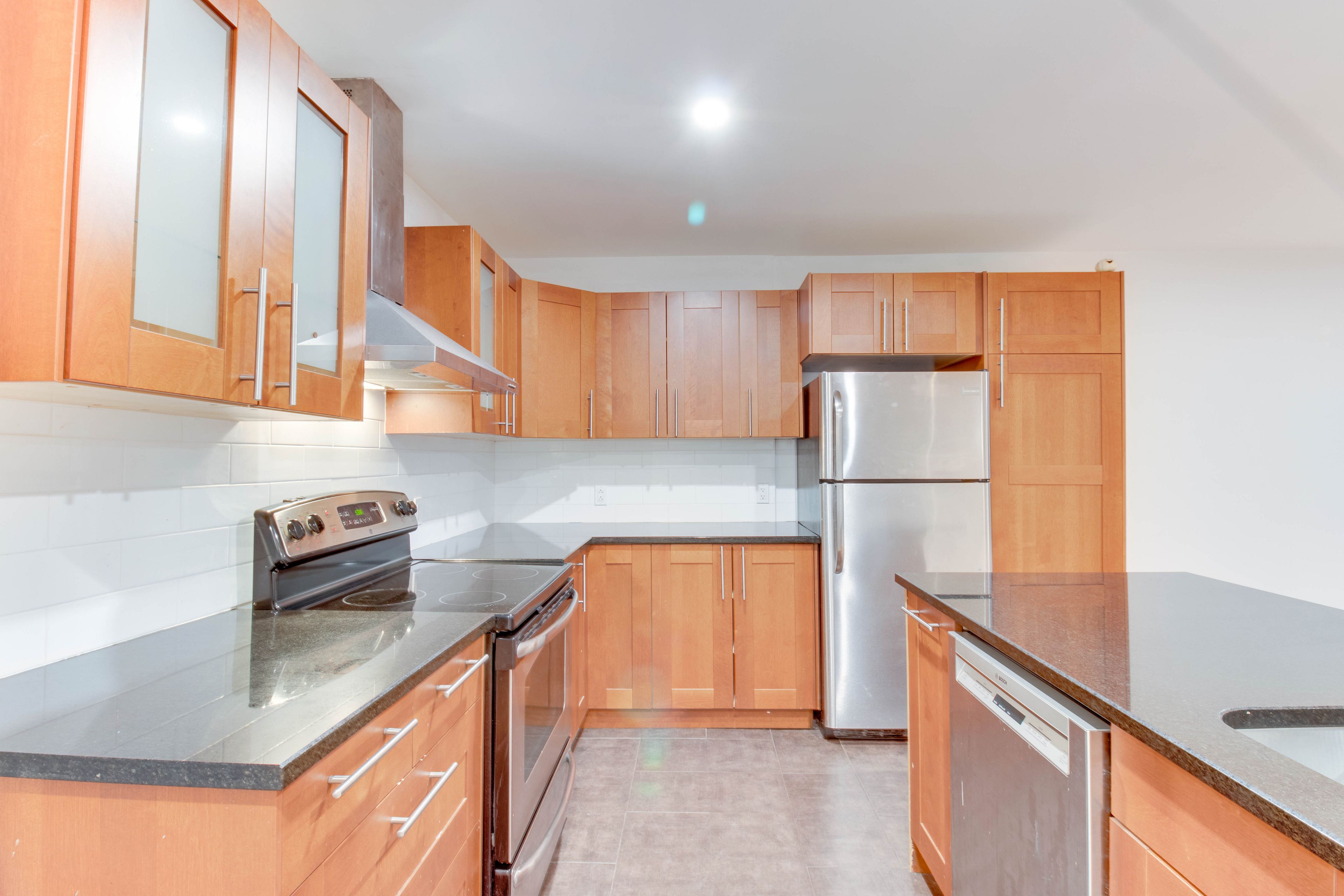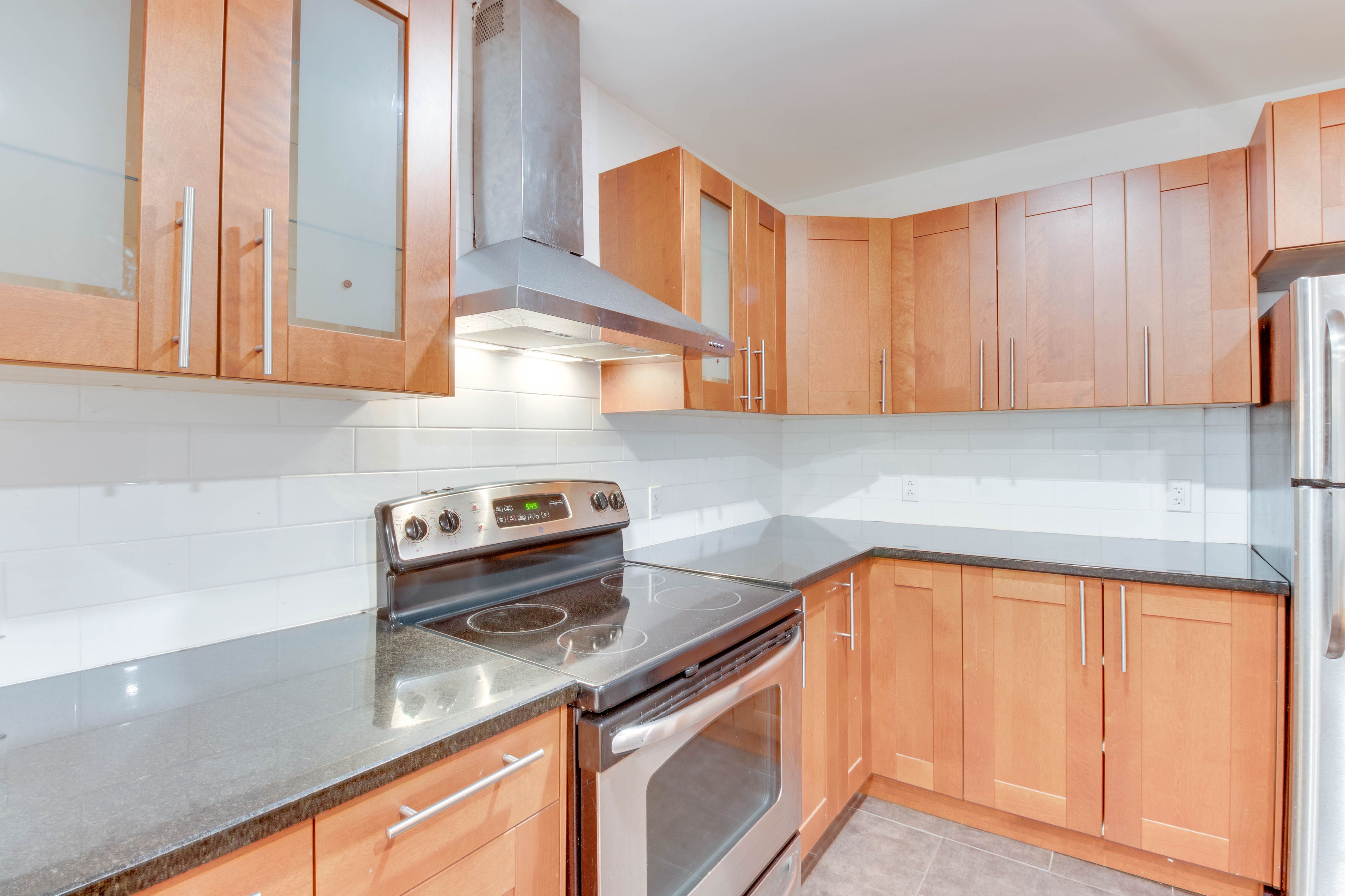 • Modern kitchen featuring granite countertops and hardwood floors.