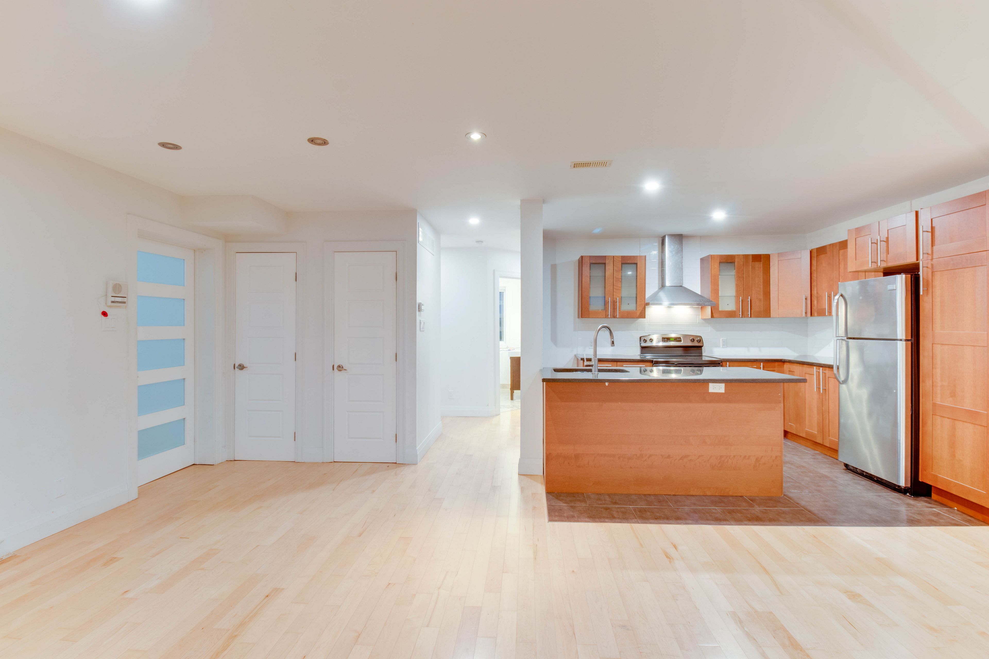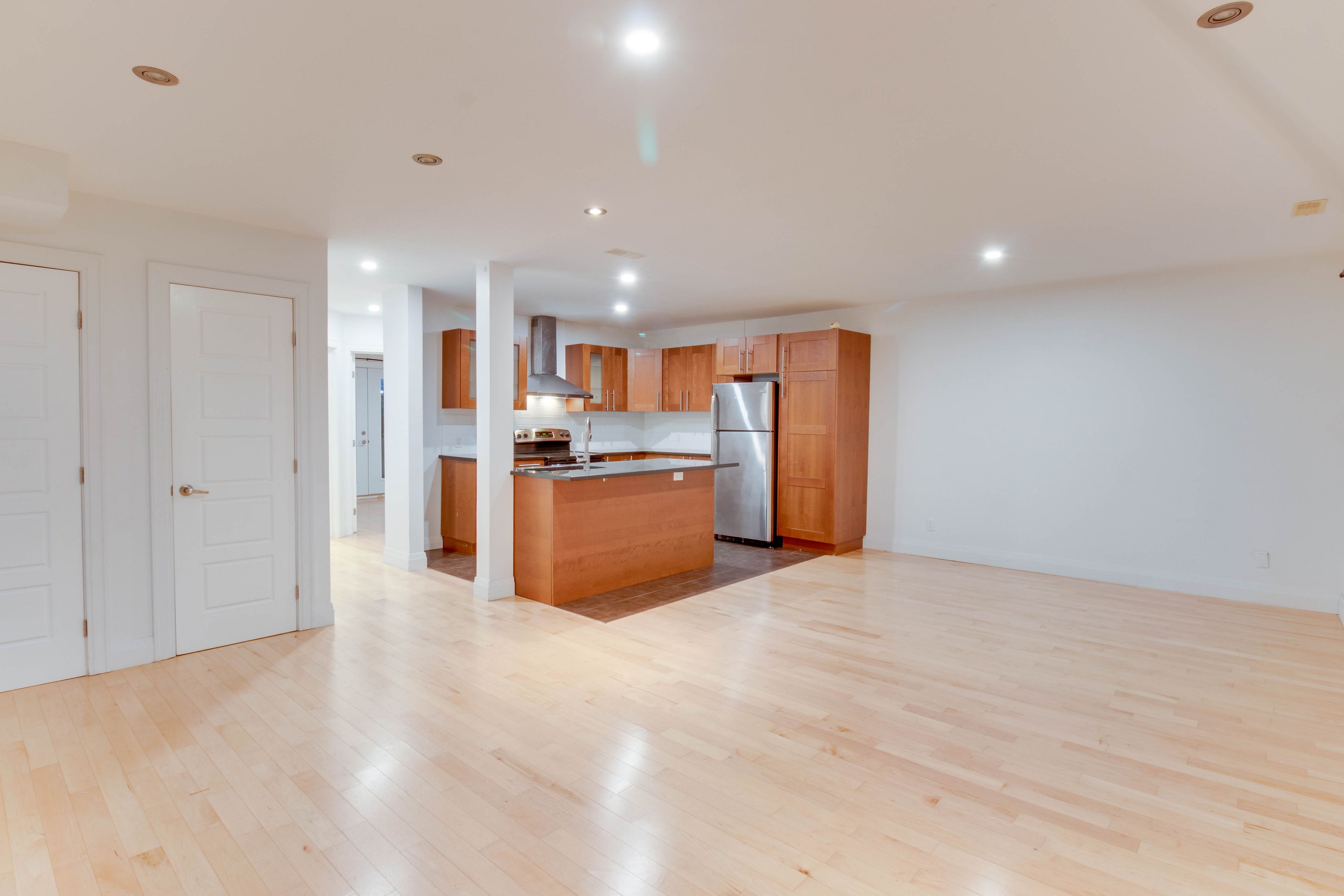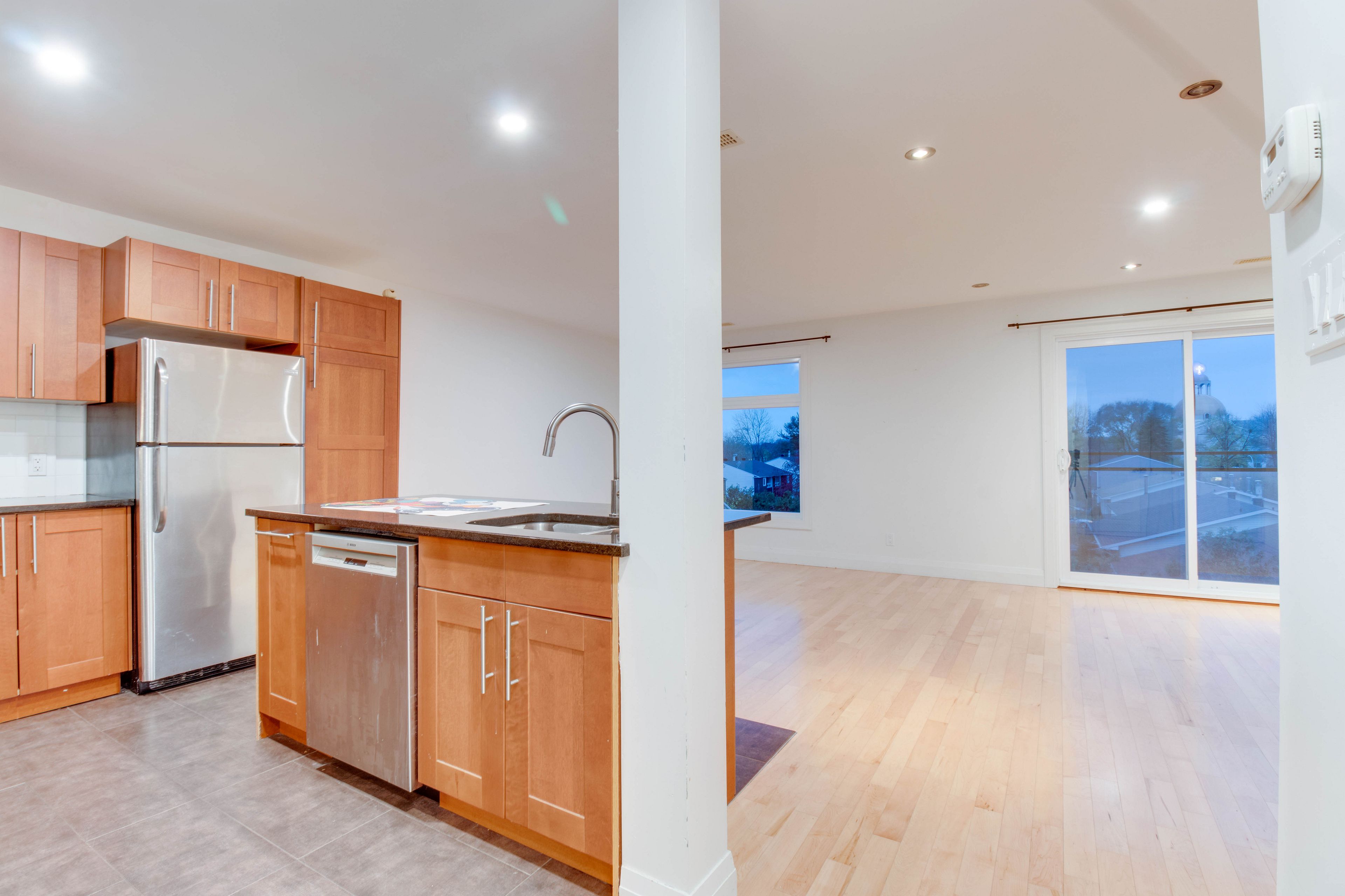• Modern kitchen featuring granite countertops and hardwood floors.