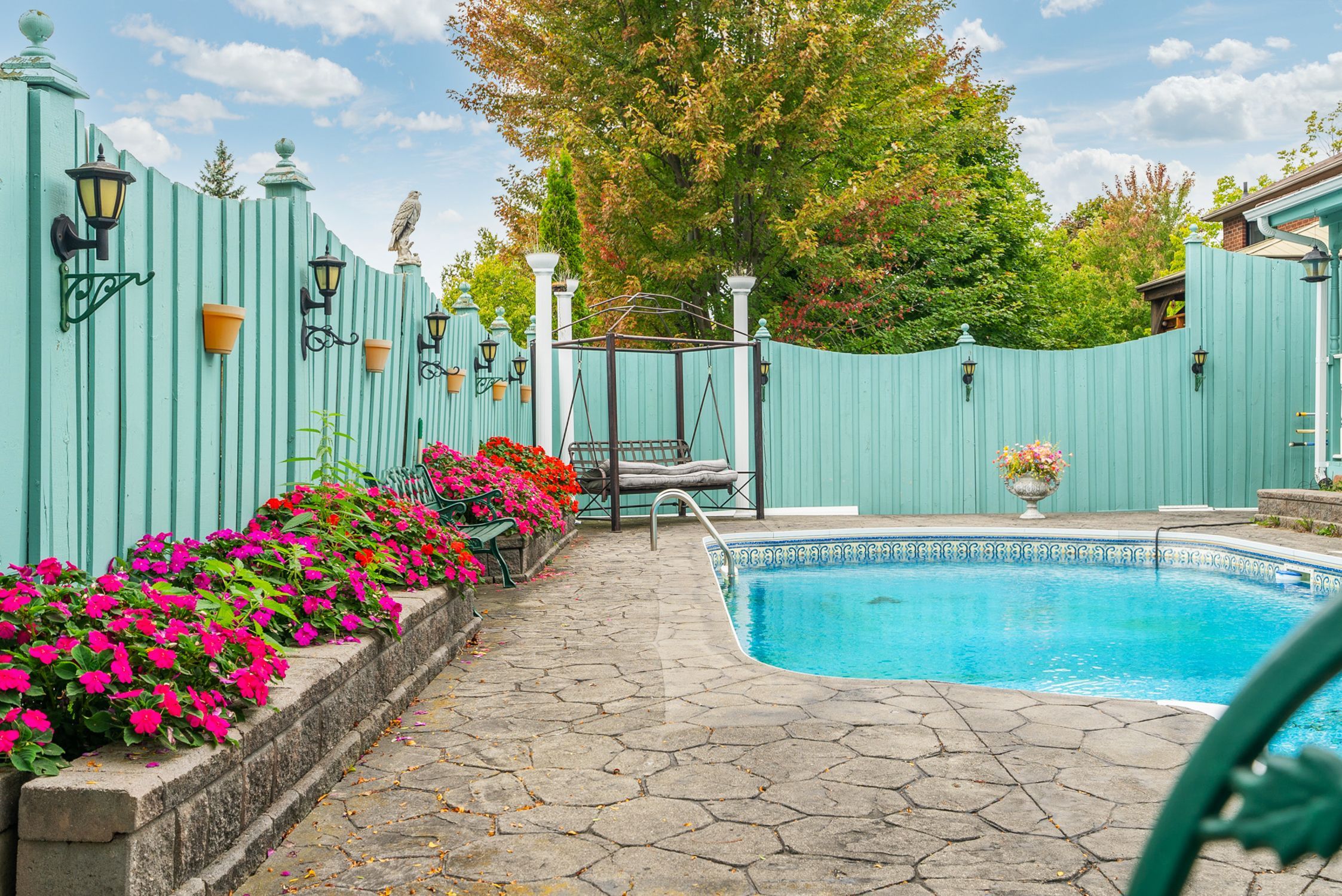 • Gorgeous backyard featuring a heated pool and large partially shaded deck.