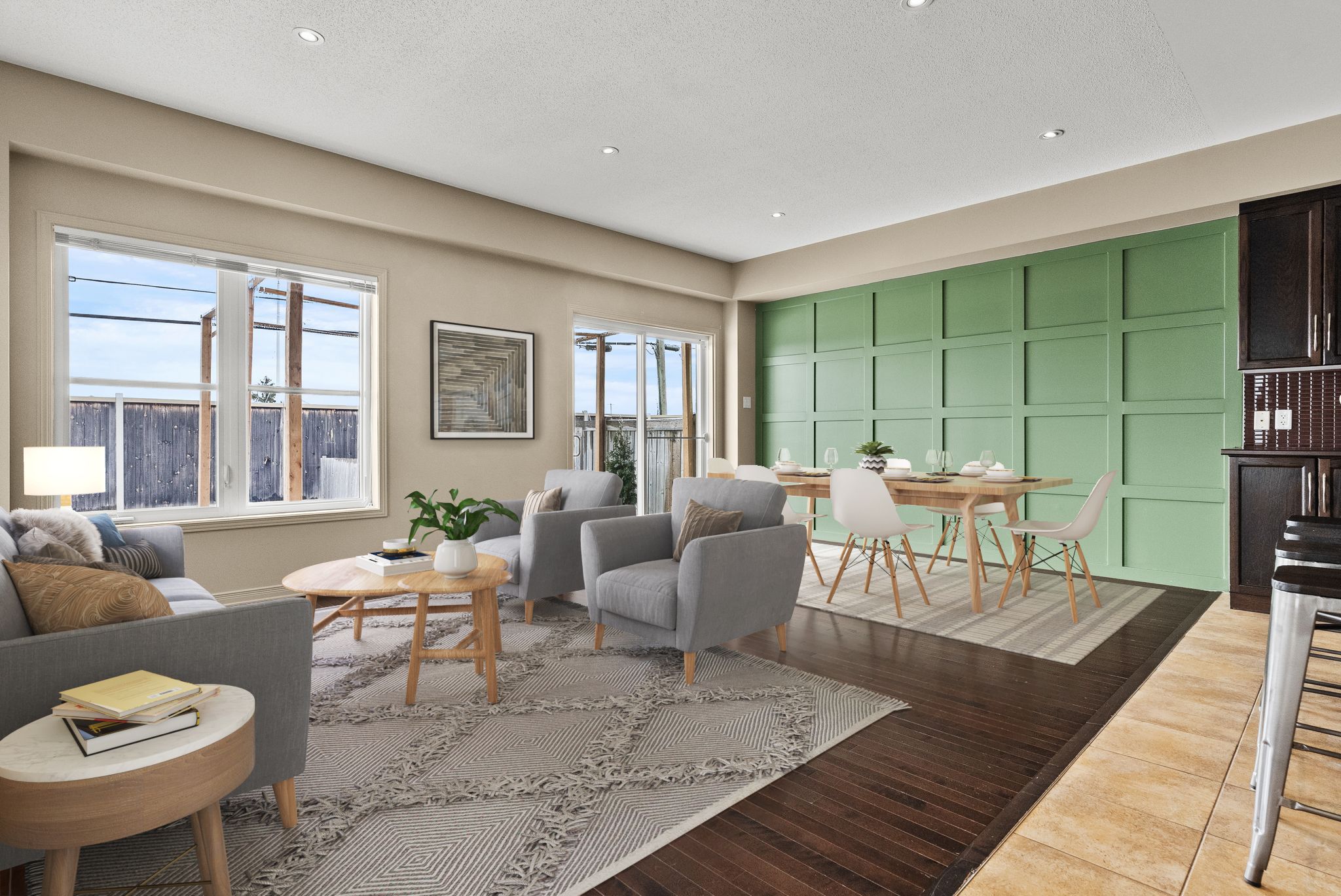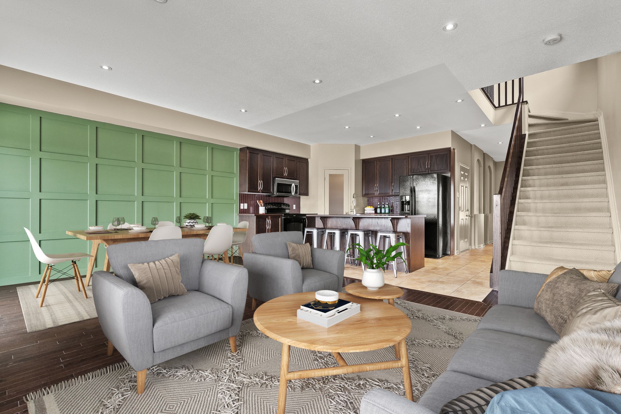 • Open concept main level with high ceilings and hardwood floors.