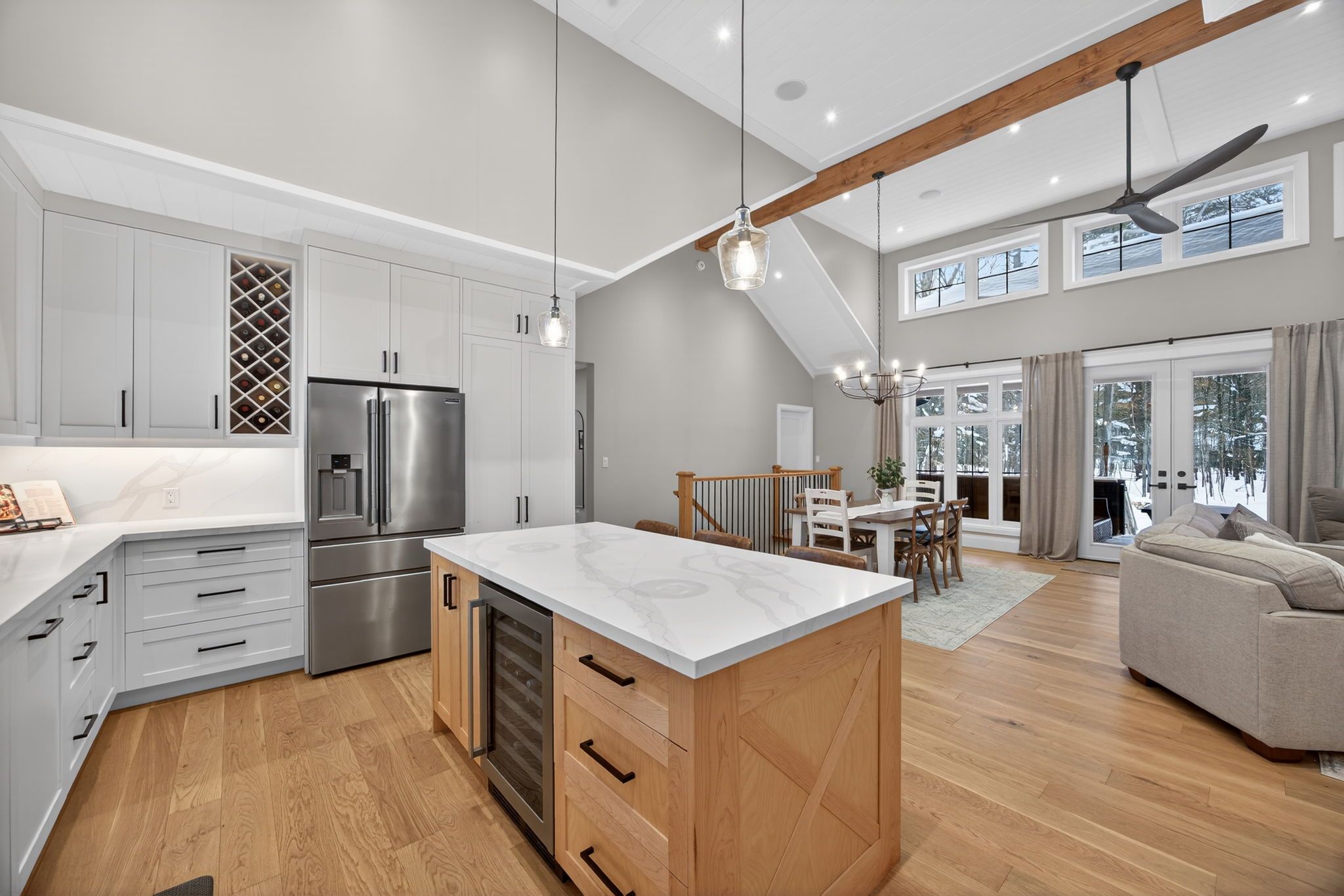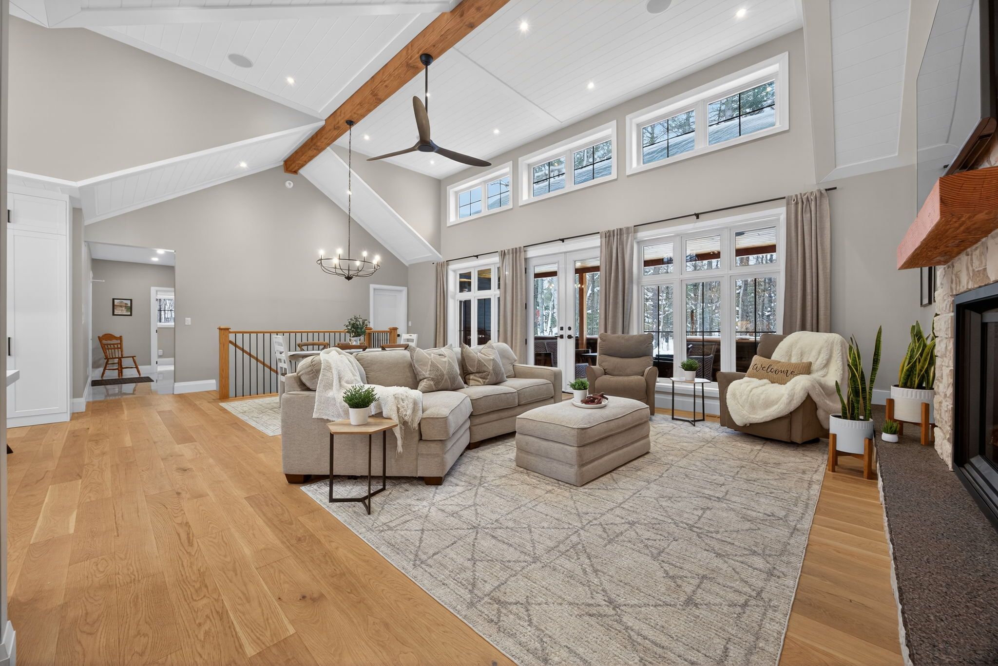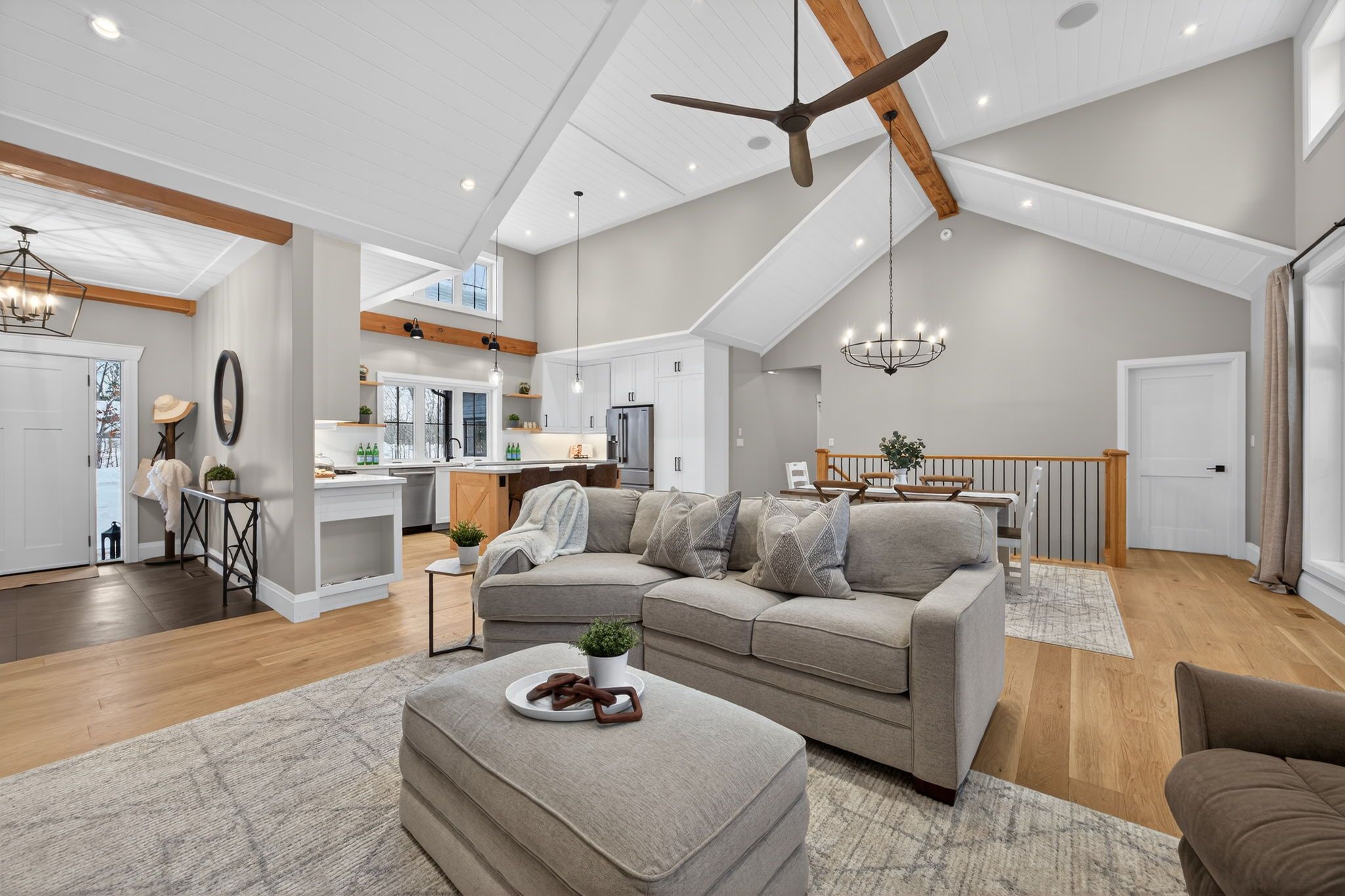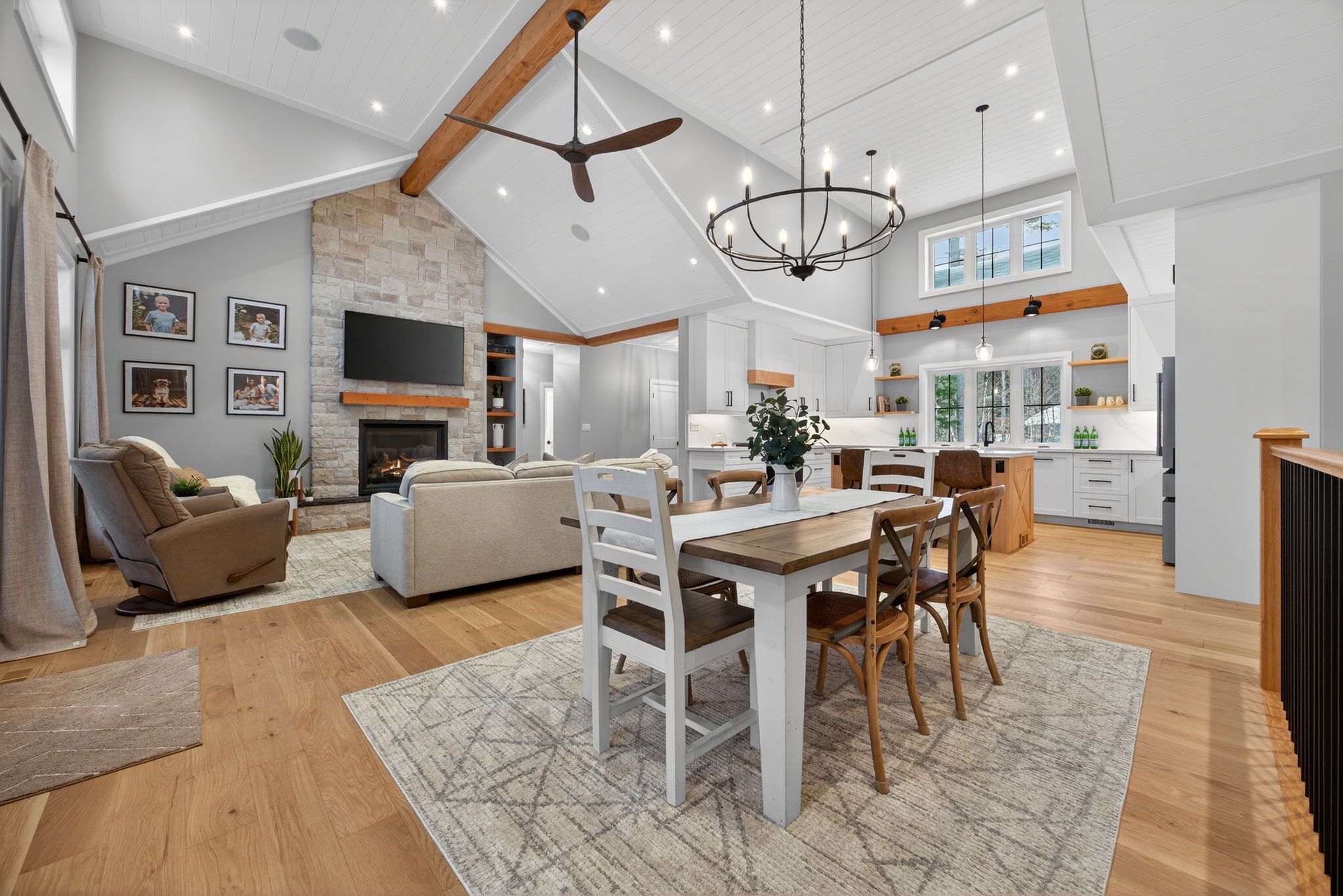 • Open-concept main level with wide-plank oak floors and vaulted ceilings.