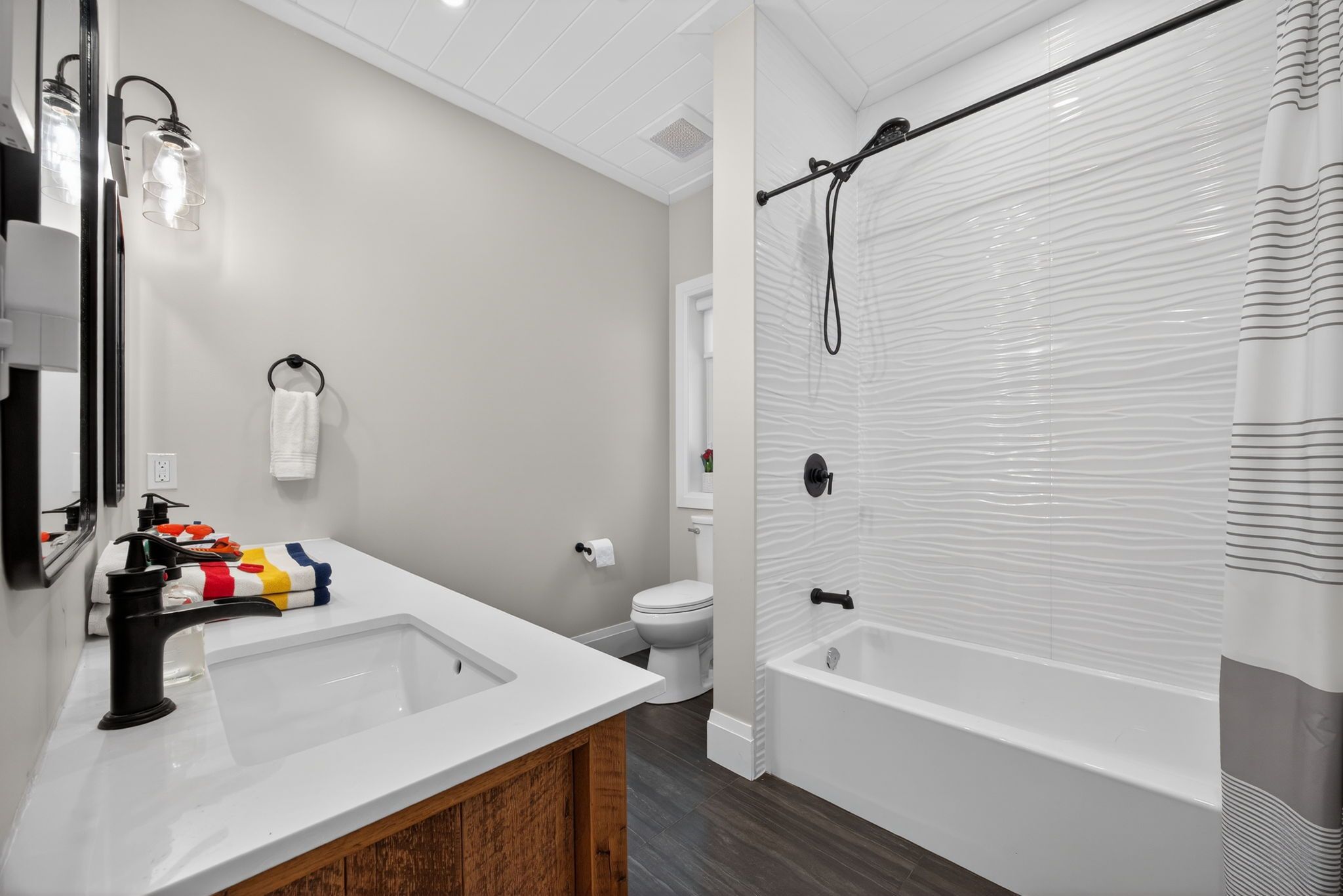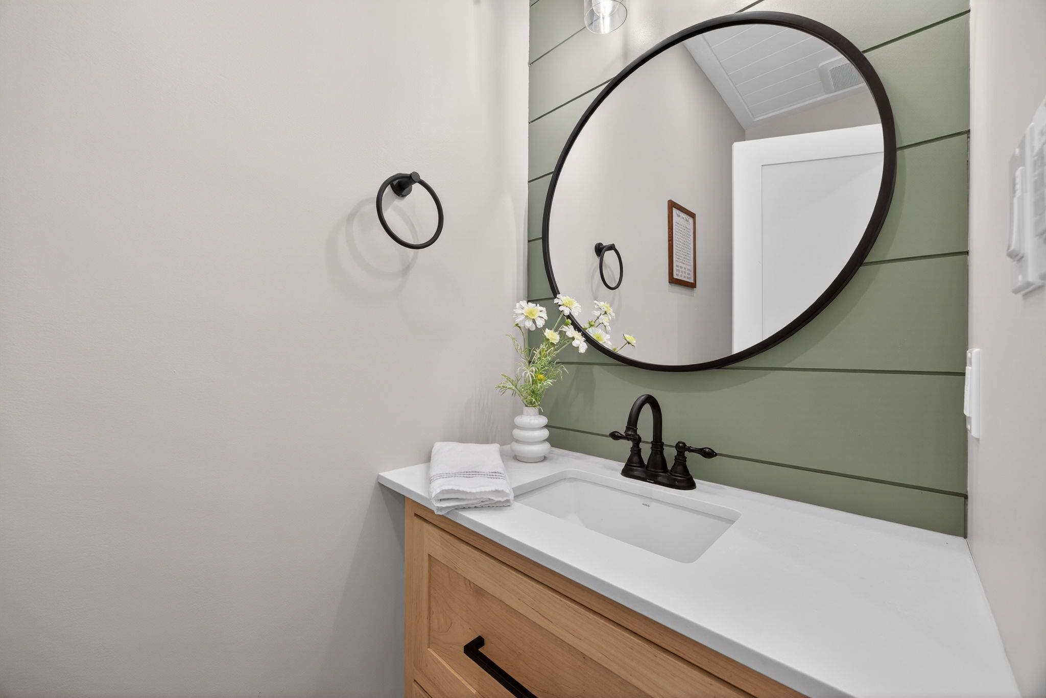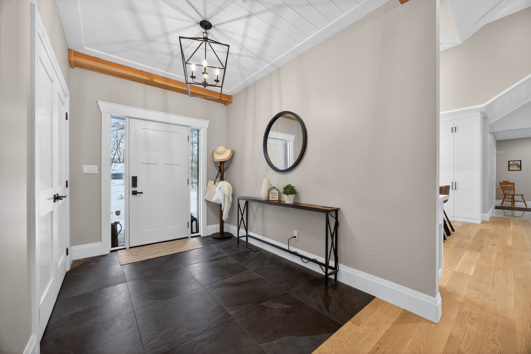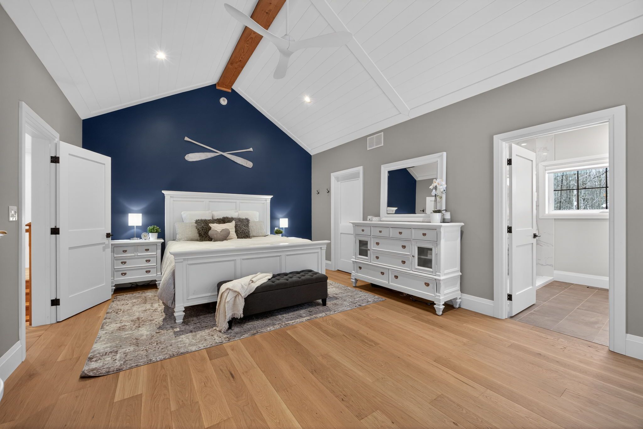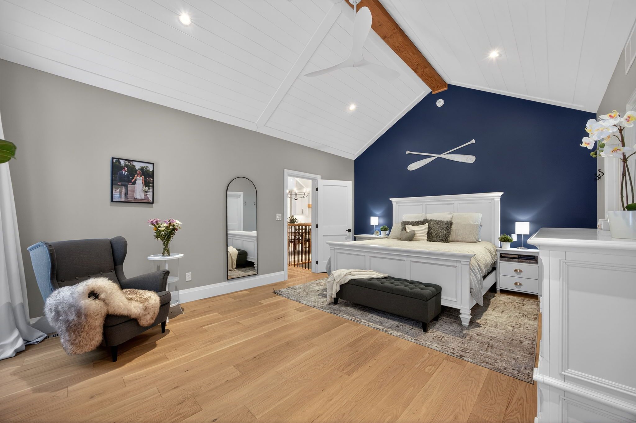 • Open-concept main level with wide-plank oak floors and vaulted ceilings.