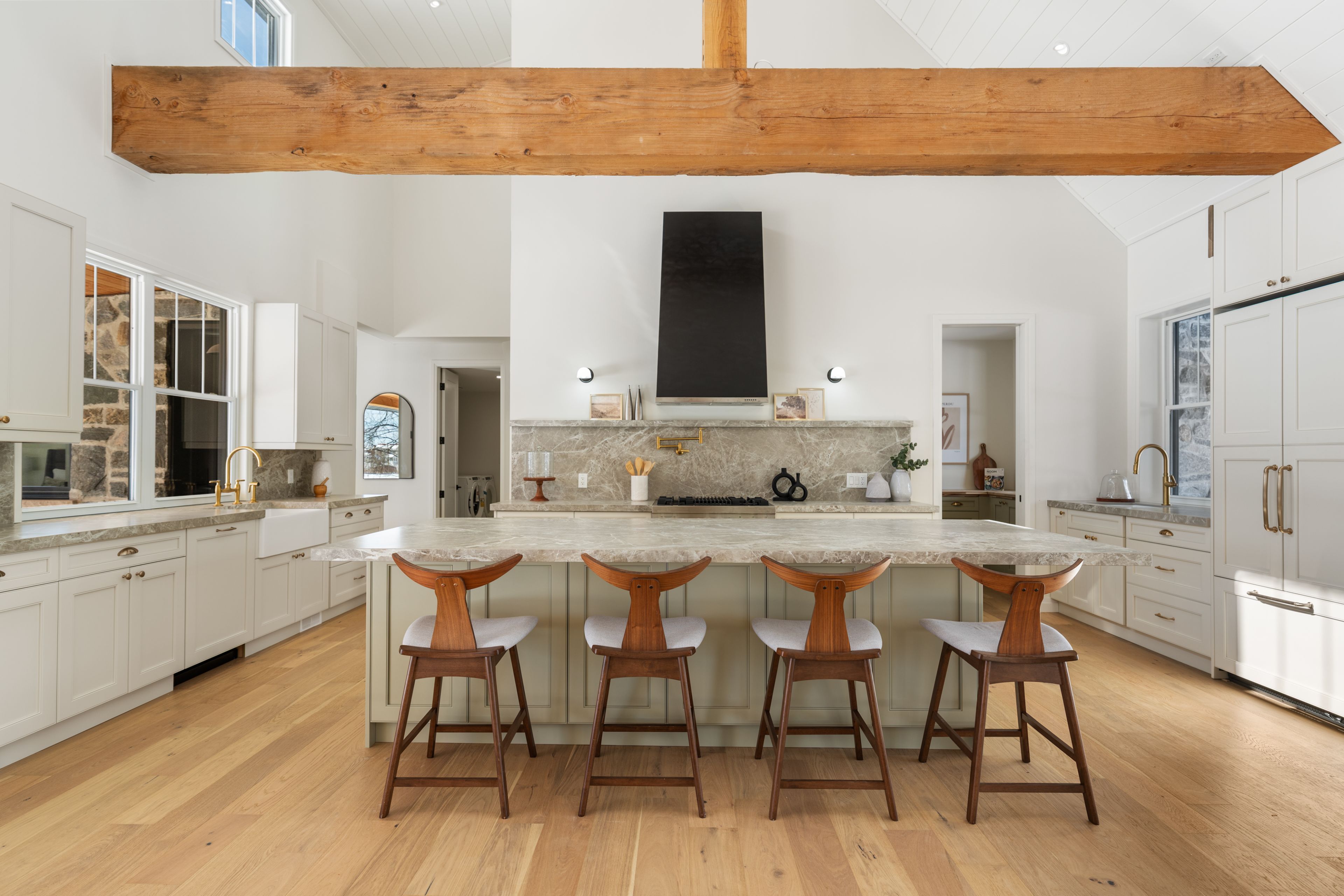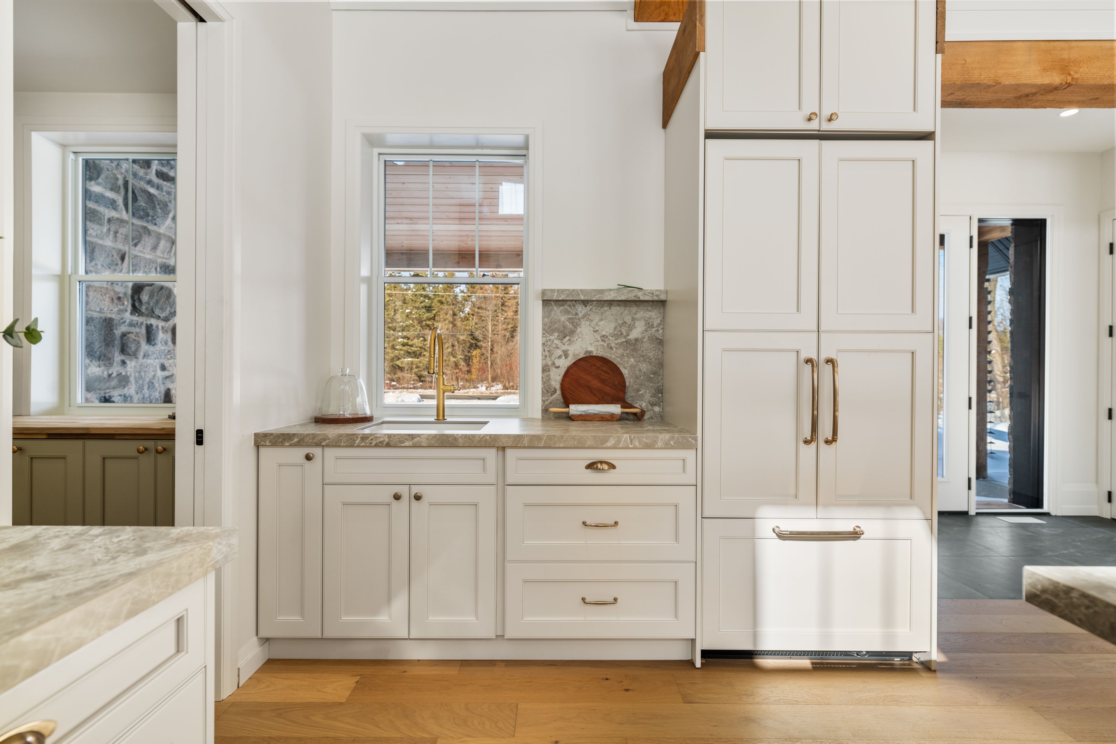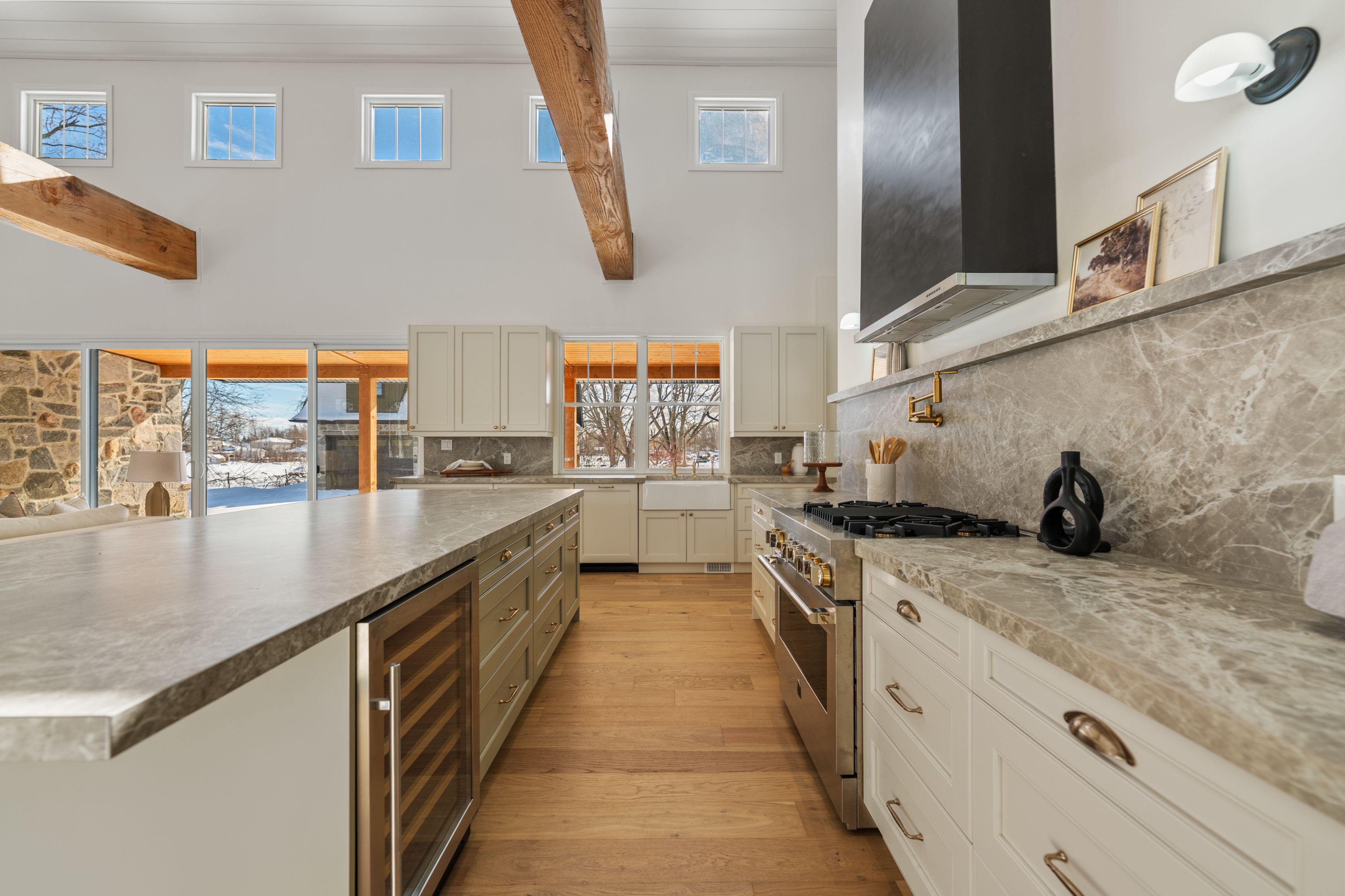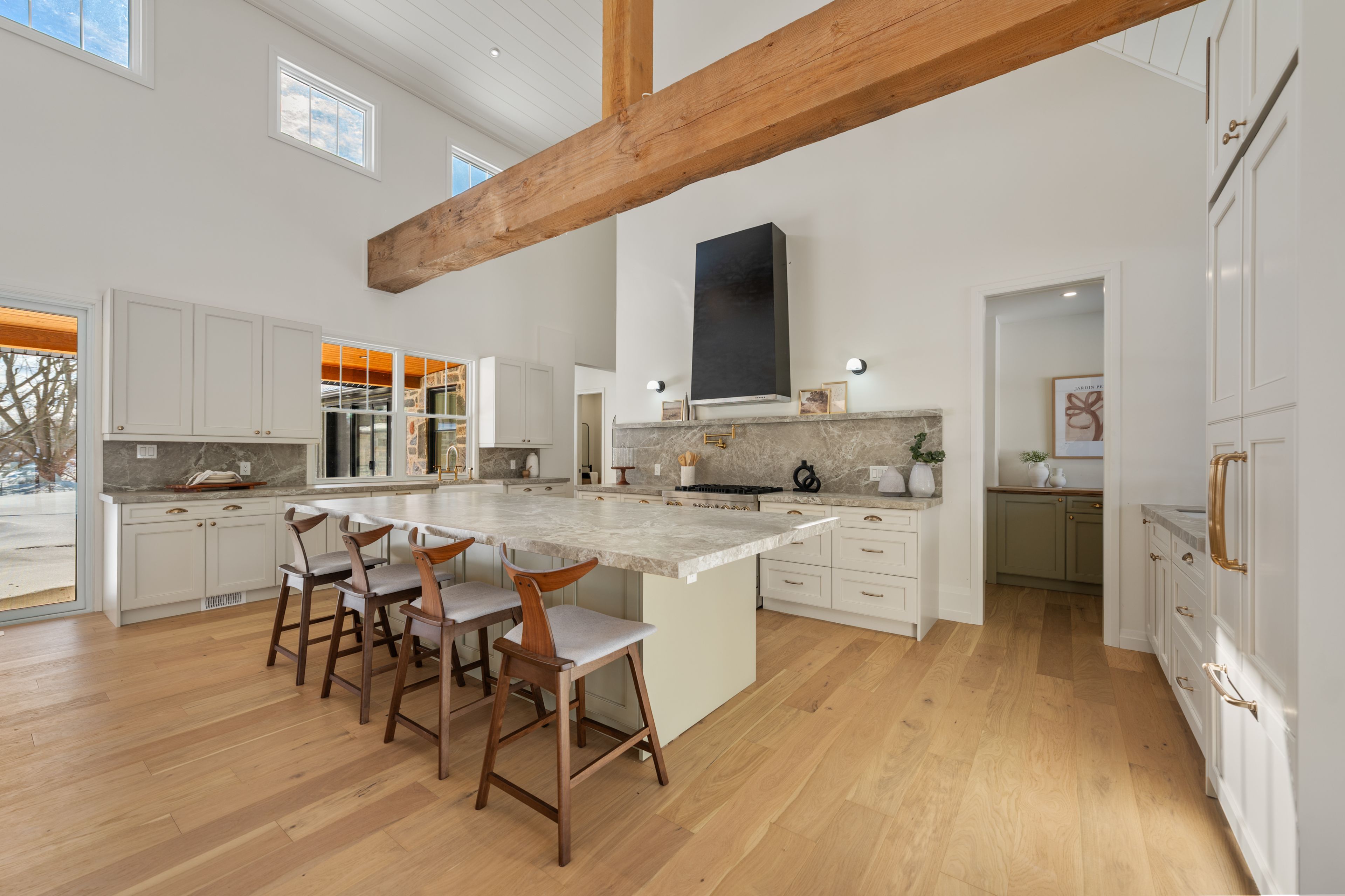 • Functional kitchen features premium appliances, walk-in pantry, and outdoor access.