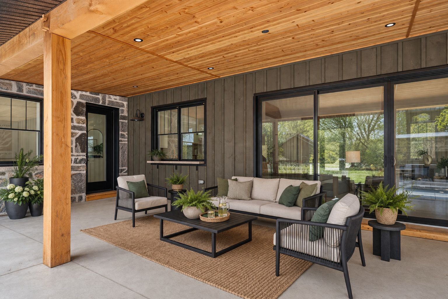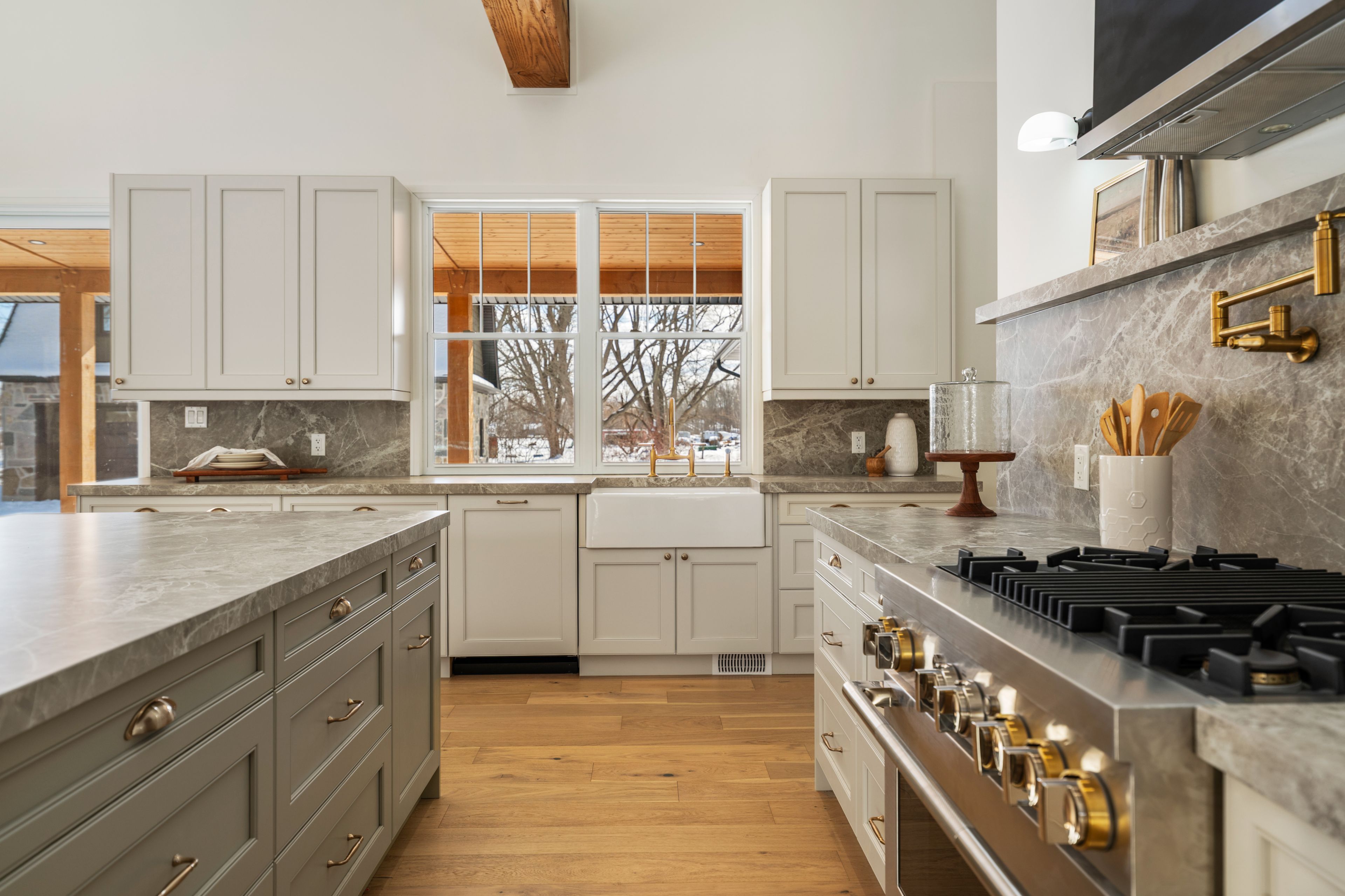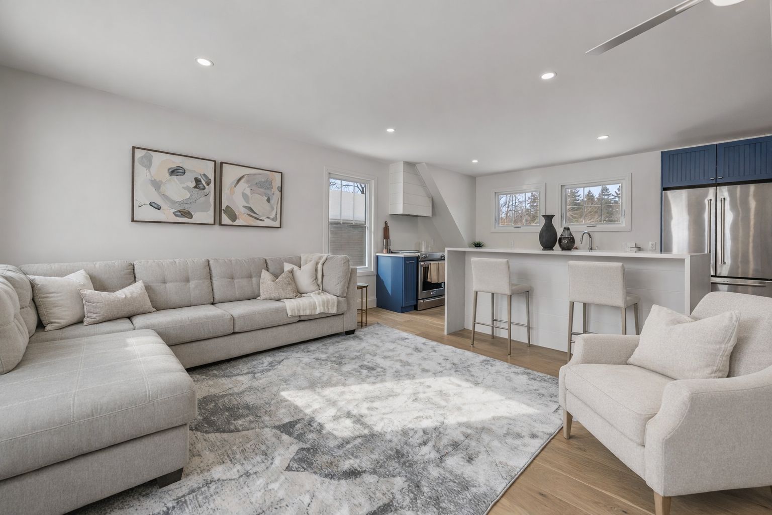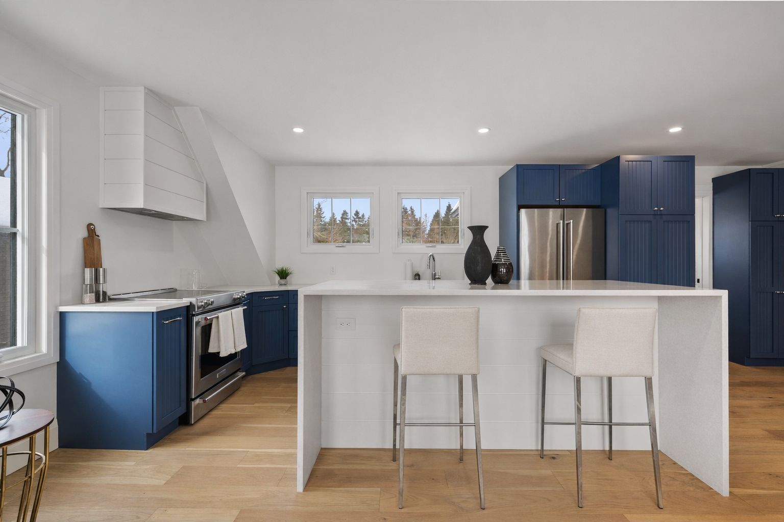 • Functional kitchen features premium appliances, walk-in pantry, and outdoor access.