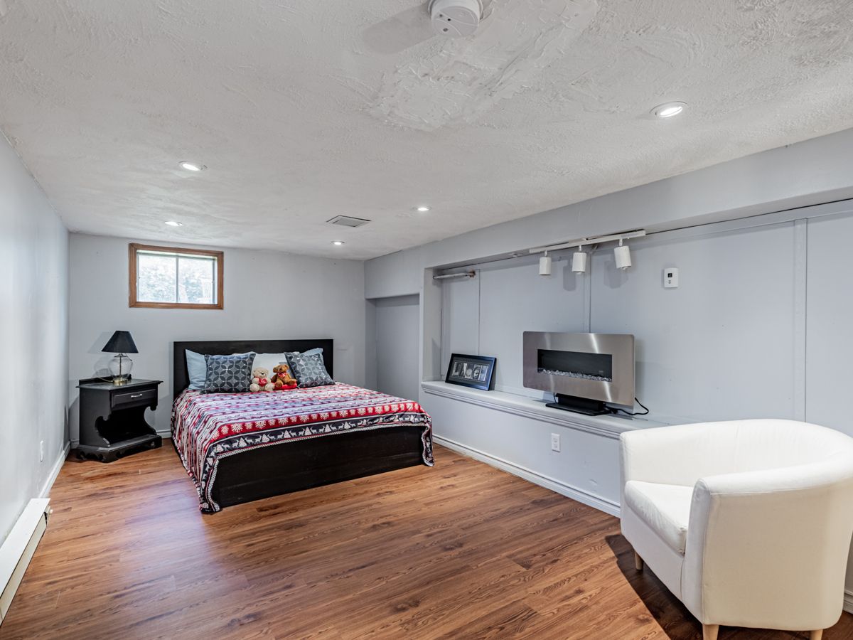 • Large bedroom includes an electric fireplace and a walk-in closet.