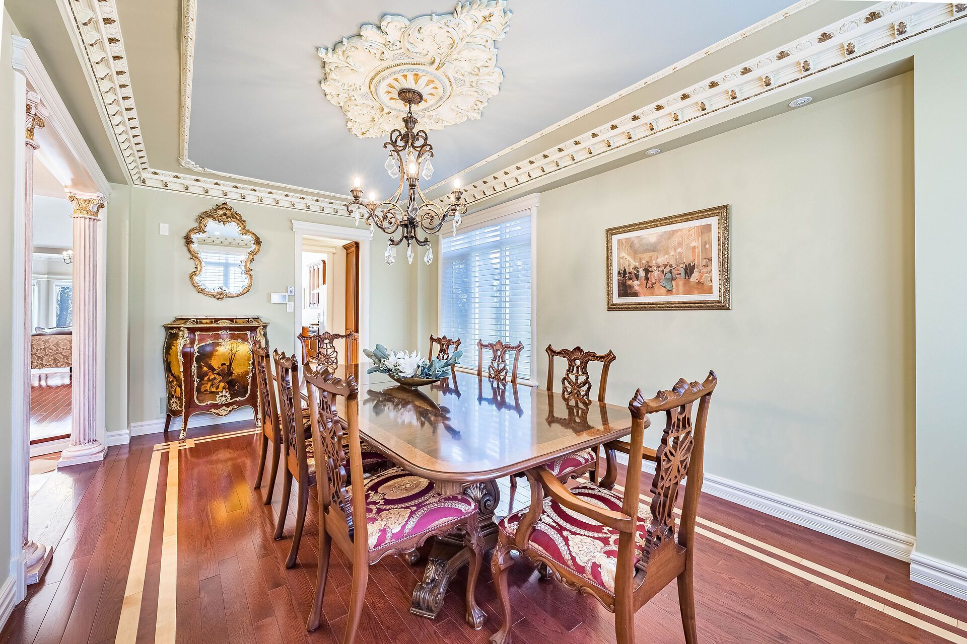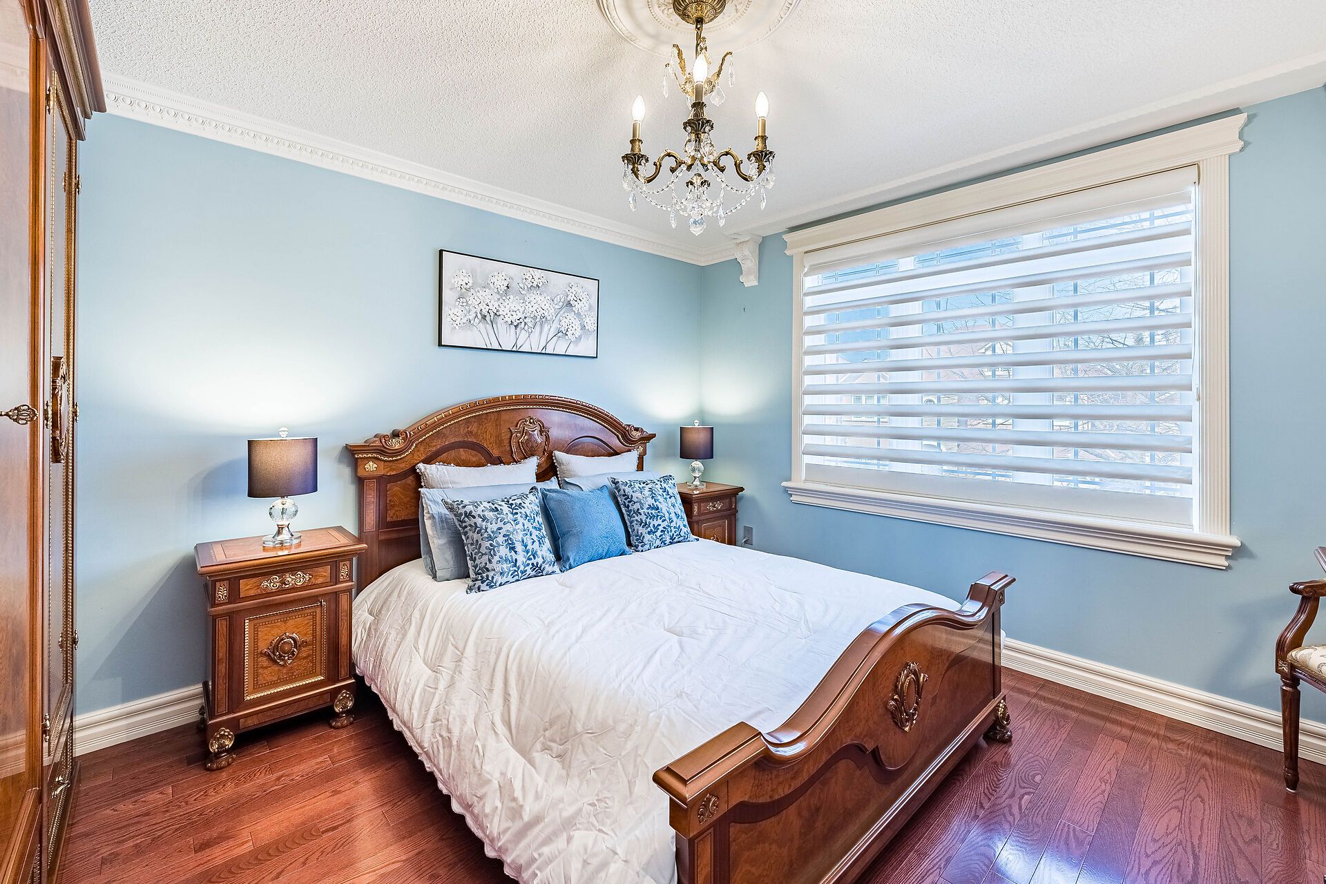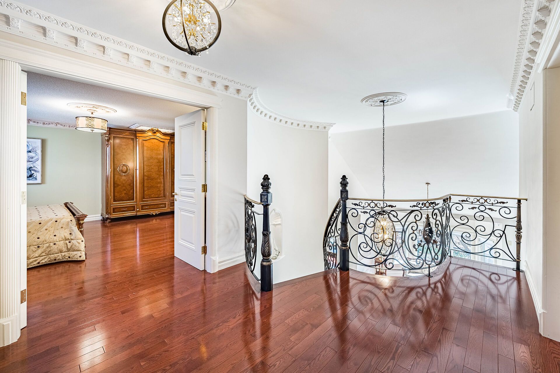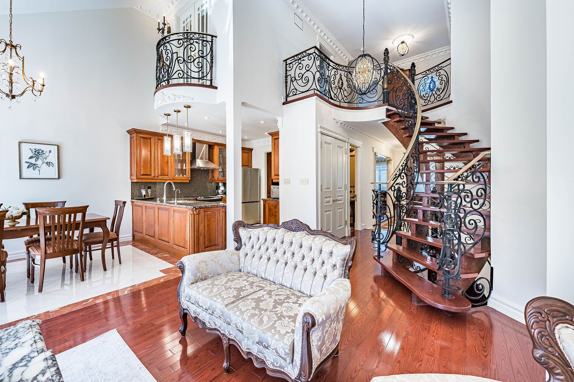 Nestled on a picturesque ravine lot in the exclusive islington woods community, this european-inspired home sits on a quiet family-friendly court surrounded by boyd park's nature trails along the humber river, and the burton trail. True craftsmanship tells this story. Walk through an oversized solid wood front entrance with motion sensored lighting and porcelain flooring. The open concept main level is anchored by a dramatic family room with soaring cathedral ceilings, crown moulding, cherry hardwood flooring, and best of all - breathtaking views. Great utilization of space and storage, enjoy built-in closet shelving. Solid wood doors with italian mortise hardware throughout. Main-floor den offers the potential for a home office or fourth bedroom with a bathroom rough-in. The formal dining/living room features a large bay window, hand-painted plaster crown moulding and is open to a custom servery and coffee nook. The kitchen is equipped with stainless steel appliances, granite countertops, solid wood cabinetry, and a walkout to a newly constructed heated concrete patio with outdoor kitchen - granite counter, roughed-in bbq, and under-mount stainless steel sink. A custom wrought iron floating staircase leads to the second level, where you will find the primary bedroom showcasing dual closets, motorized blinds, and a luxurious six-piece ensuite with ravine views. The third bedroom features an elegant juliet balcony overlooking the great room which is adorned by lots of natural light. The garage is fully finished with porcelain tile flooring, spray foam insulation, upgraded openers, and a mezzanine for storage. Impeccably manicured, professionally groomed landscaping front to back accented by a tumbled stone driveway and walkway. Walking distance to al palladini community centre, bus routes to st. Michael's college, villanova, and de la salle - plus nearby shops, transit. Freshly painted, move-in ready!