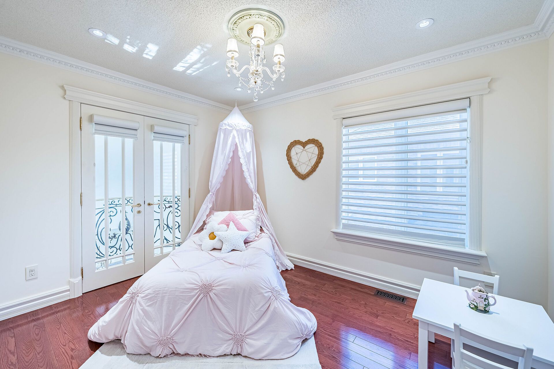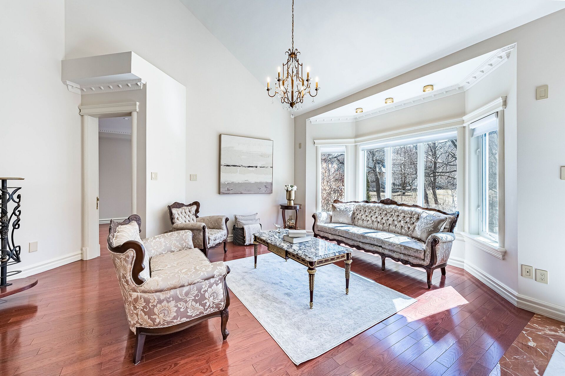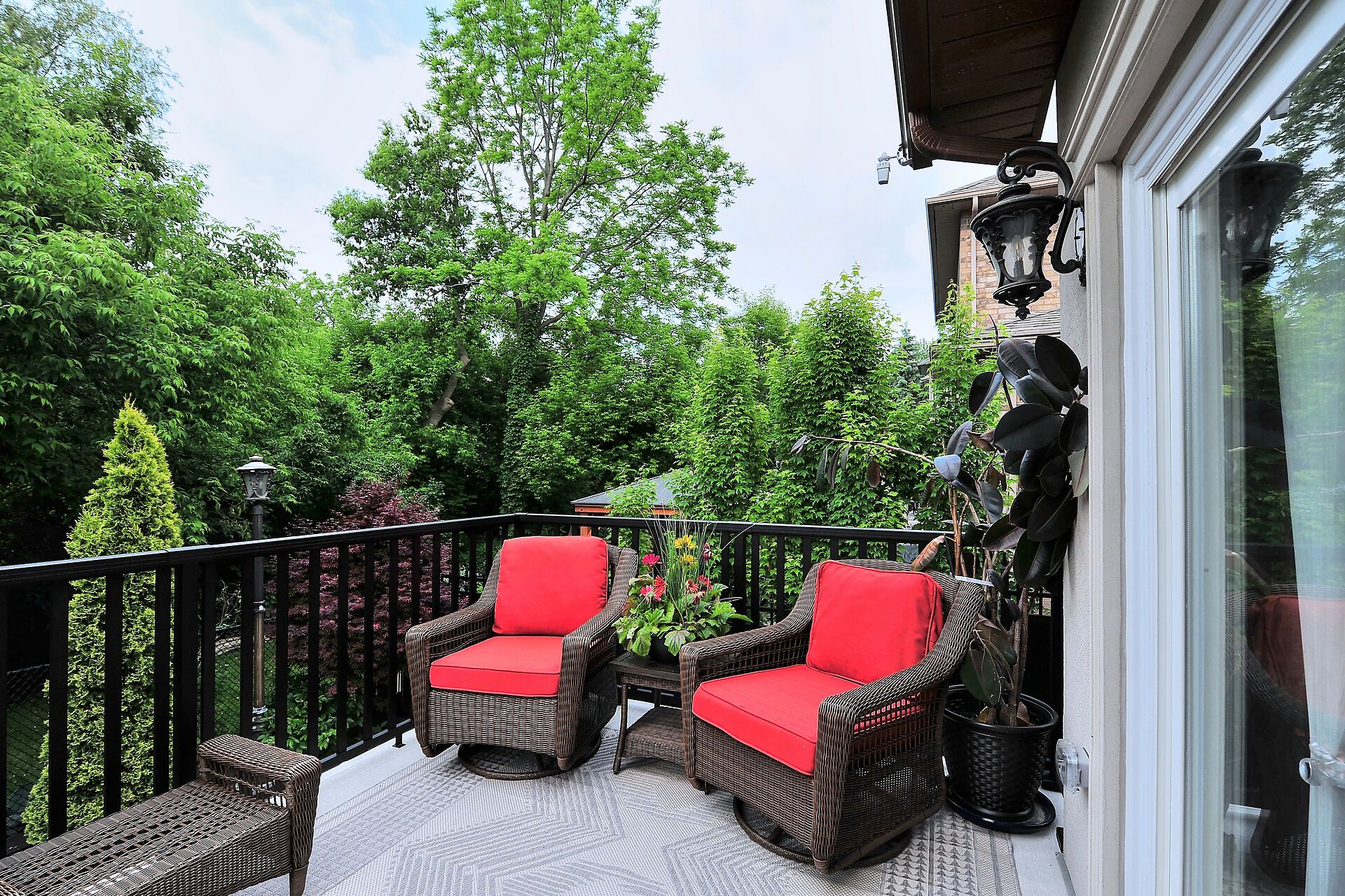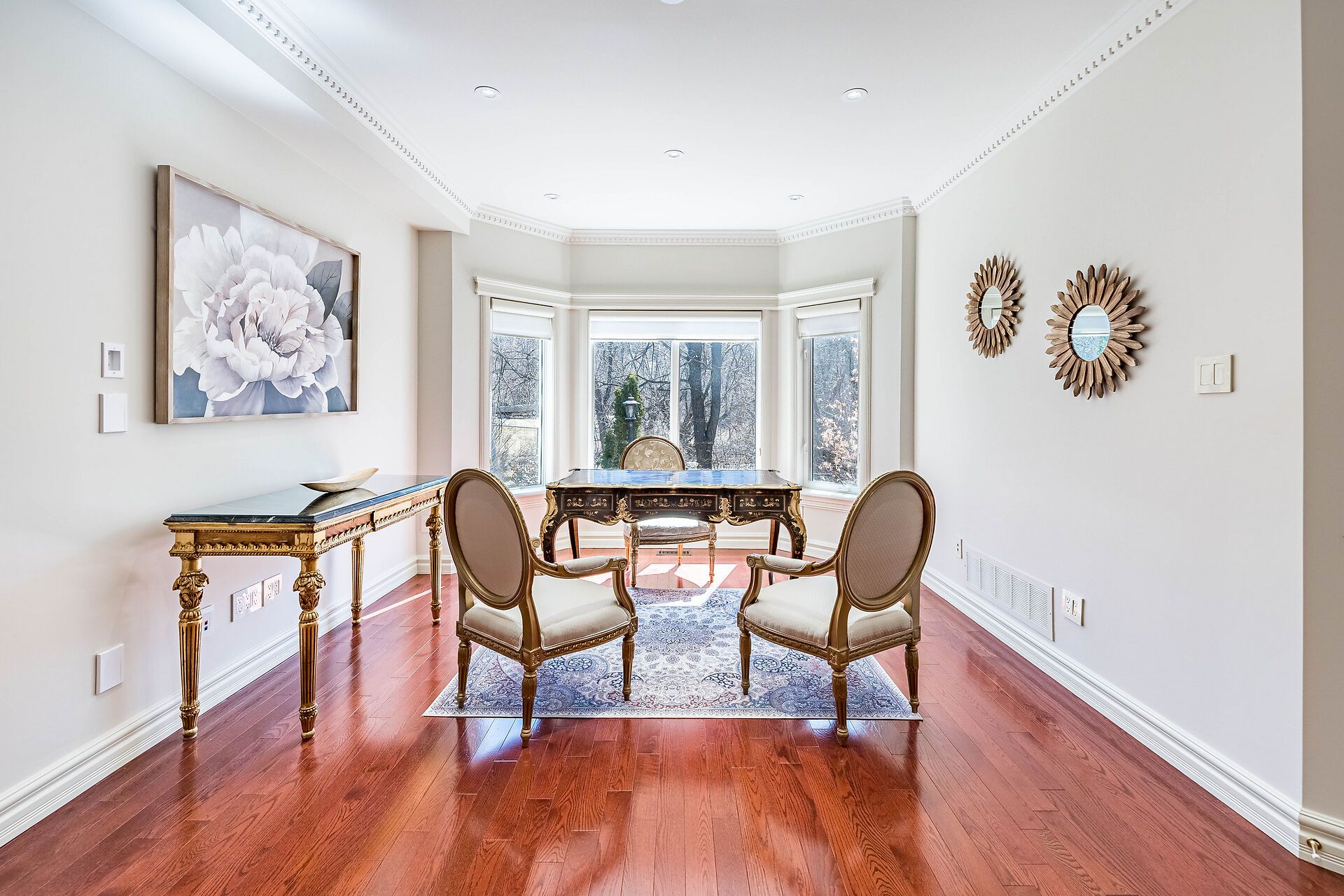 Nestled on a picturesque ravine lot in the exclusive islington woods community, this european-inspired home sits on a quiet family-friendly court surrounded by boyd park's nature trails along the humber river, and the burton trail. True craftsmanship tells this story. Walk through an oversized solid wood front entrance with motion sensored lighting and porcelain flooring. The open concept main level is anchored by a dramatic family room with soaring cathedral ceilings, crown moulding, cherry hardwood flooring, and best of all - breathtaking views. Great utilization of space and storage, enjoy built-in closet shelving. Solid wood doors with italian mortise hardware throughout. Main-floor den offers the potential for a home office or fourth bedroom with a bathroom rough-in. The formal dining/living room features a large bay window, hand-painted plaster crown moulding and is open to a custom servery and coffee nook. The kitchen is equipped with stainless steel appliances, granite countertops, solid wood cabinetry, and a walkout to a newly constructed heated concrete patio with outdoor kitchen - granite counter, roughed-in bbq, and under-mount stainless steel sink. A custom wrought iron floating staircase leads to the second level, where you will find the primary bedroom showcasing dual closets, motorized blinds, and a luxurious six-piece ensuite with ravine views. The third bedroom features an elegant juliet balcony overlooking the great room which is adorned by lots of natural light. The garage is fully finished with porcelain tile flooring, spray foam insulation, upgraded openers, and a mezzanine for storage. Impeccably manicured, professionally groomed landscaping front to back accented by a tumbled stone driveway and walkway. Walking distance to al palladini community centre, bus routes to st. Michael's college, villanova, and de la salle - plus nearby shops, transit. Freshly painted, move-in ready!