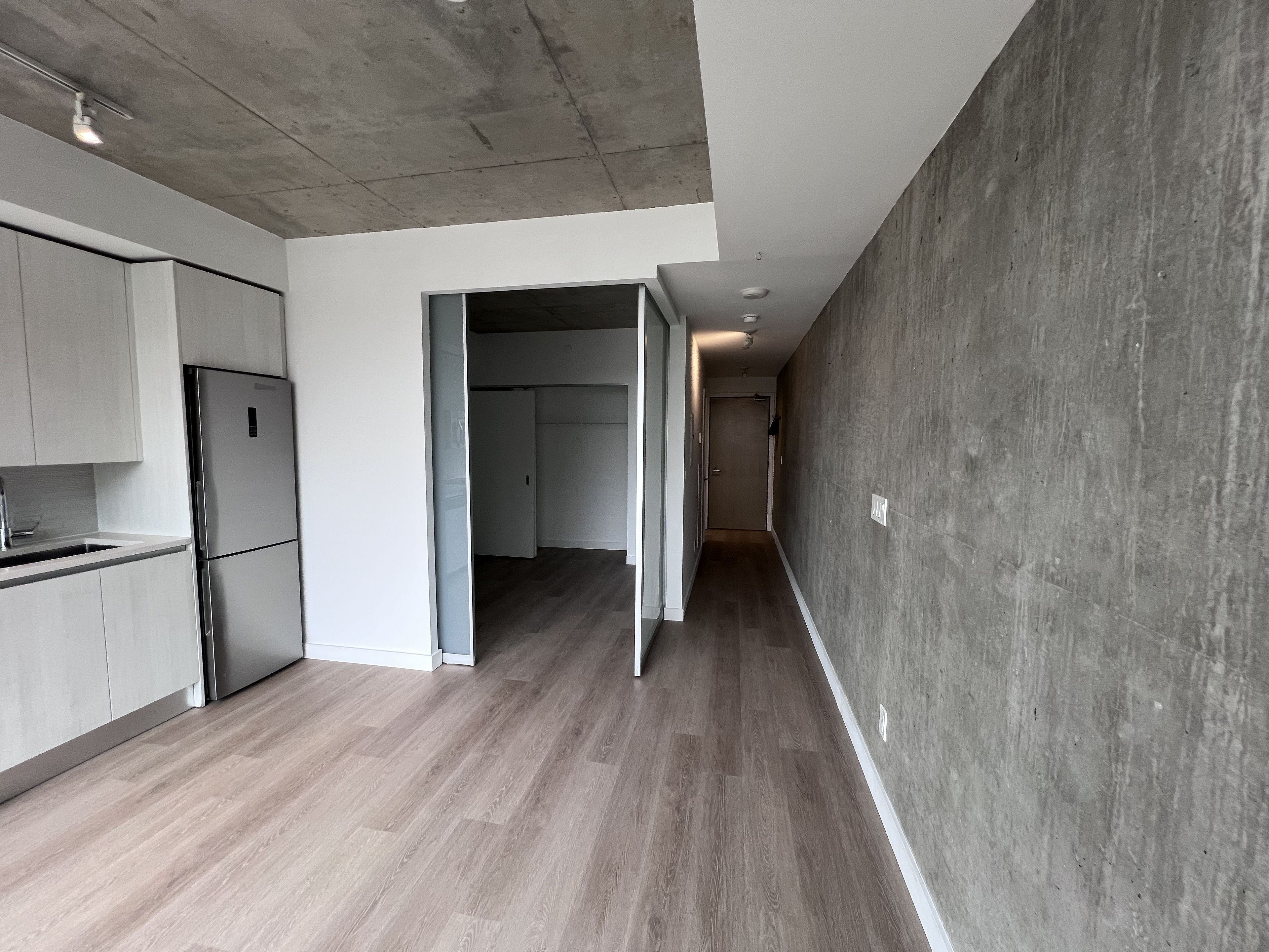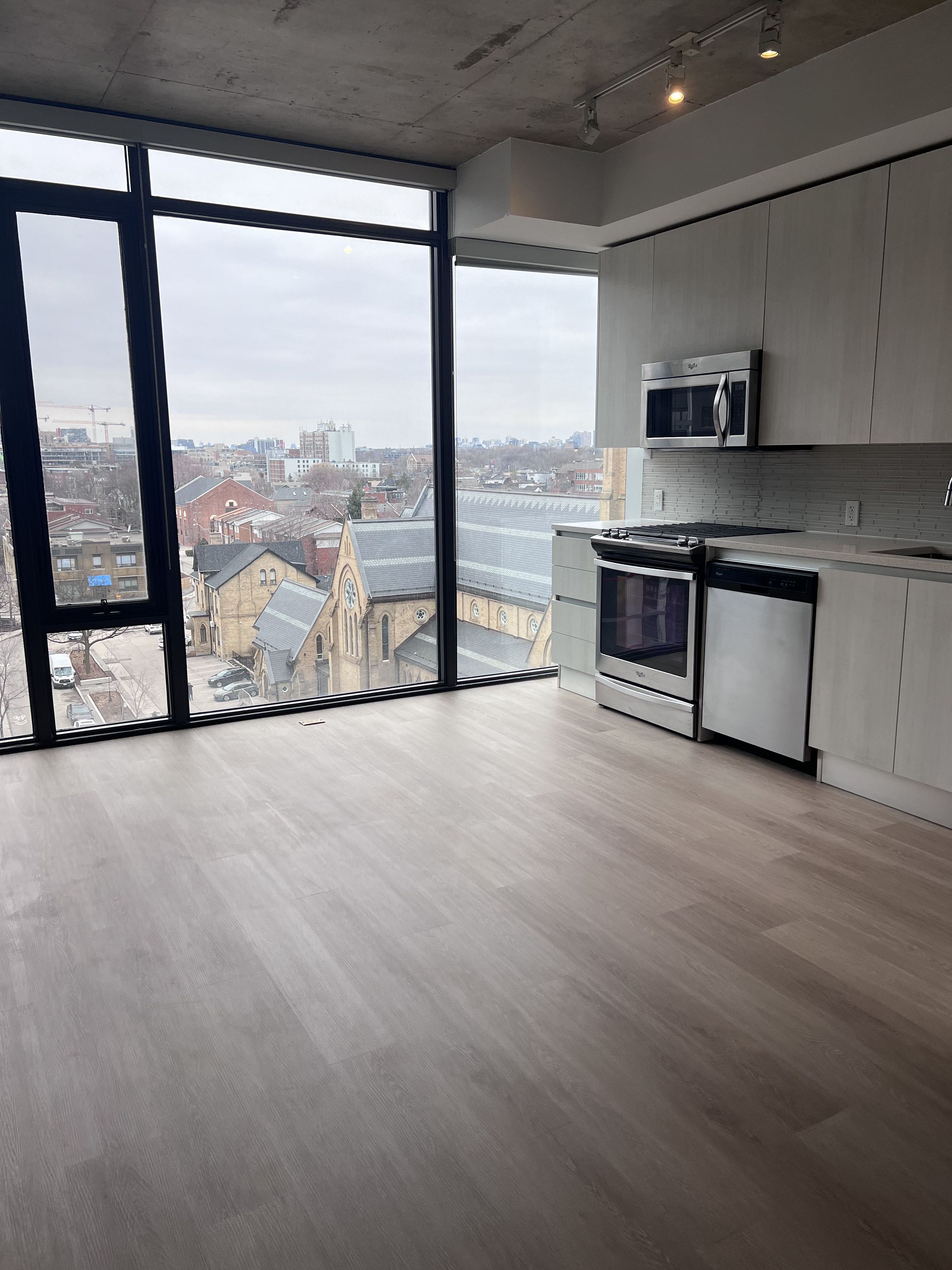 • Renovated unit with open-concept layout and high ceilings.