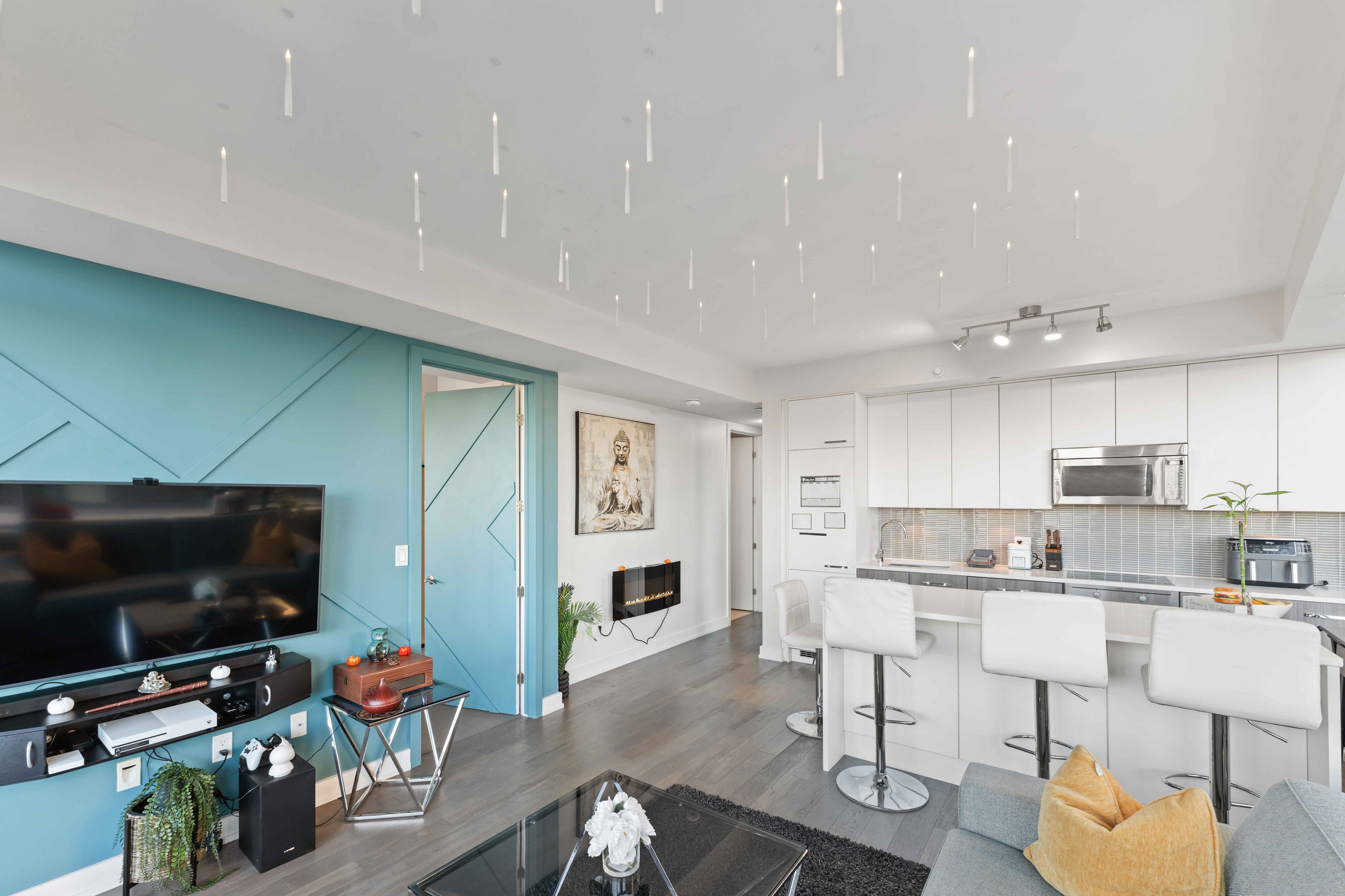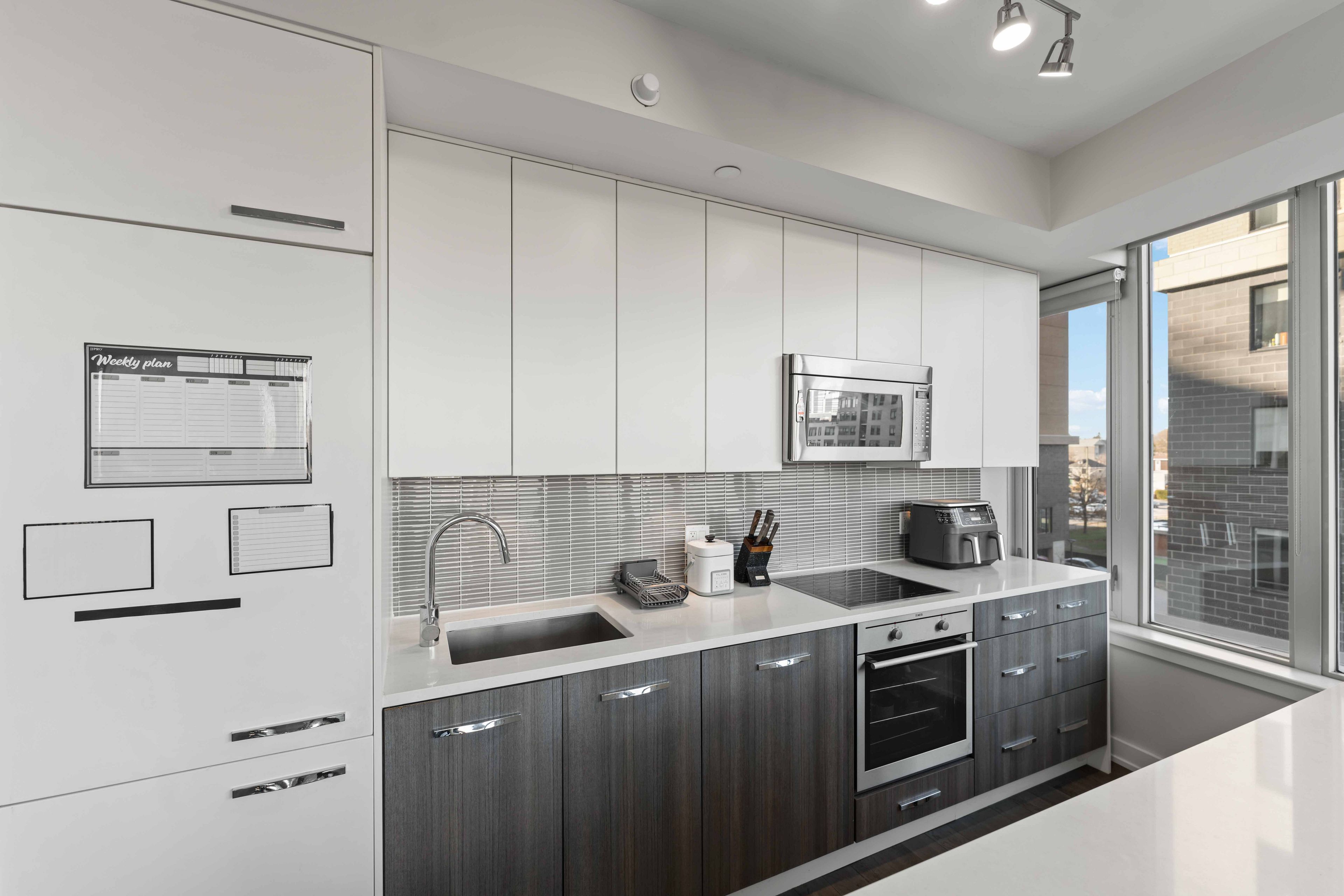 • Upgraded kitchen with quartz countertops and modern electric fireplace.
