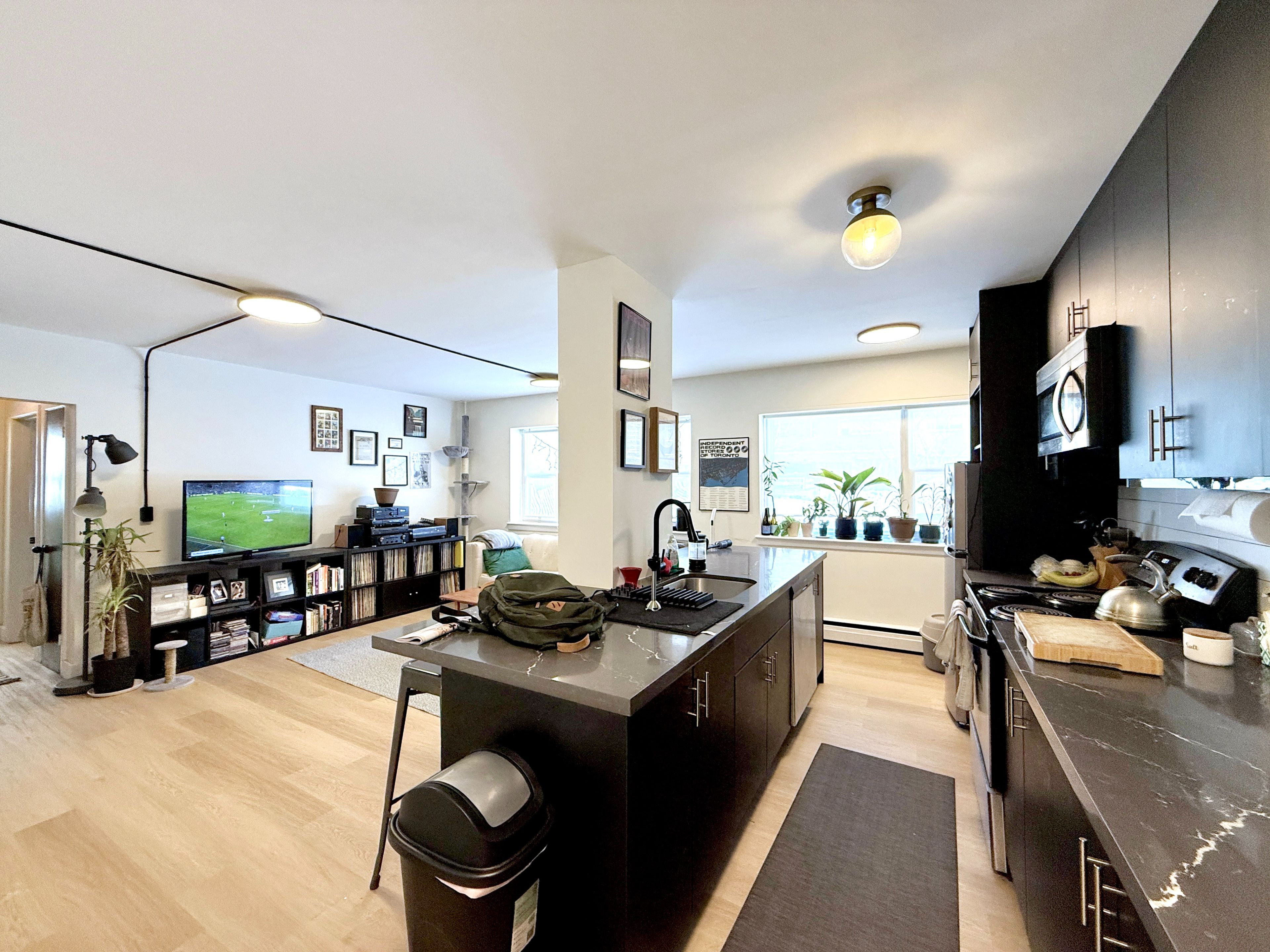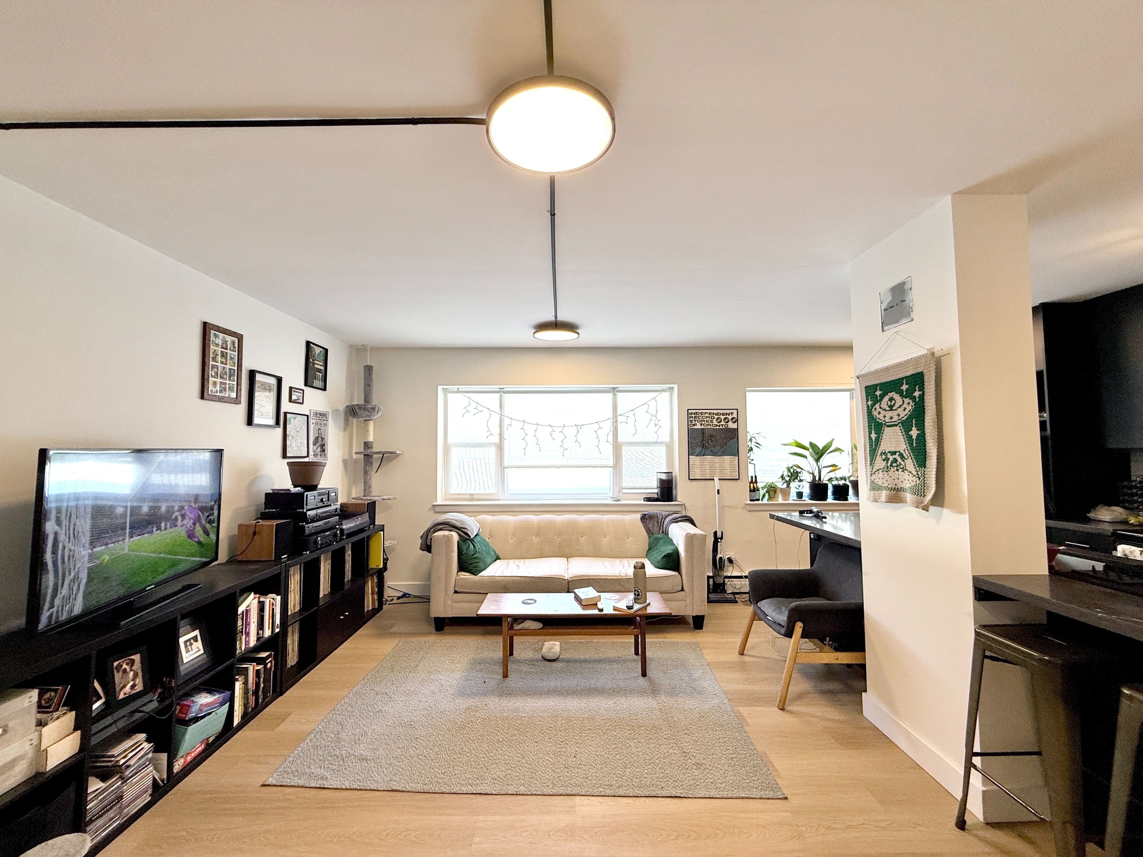 • Large windows fill the space with natural light all day.