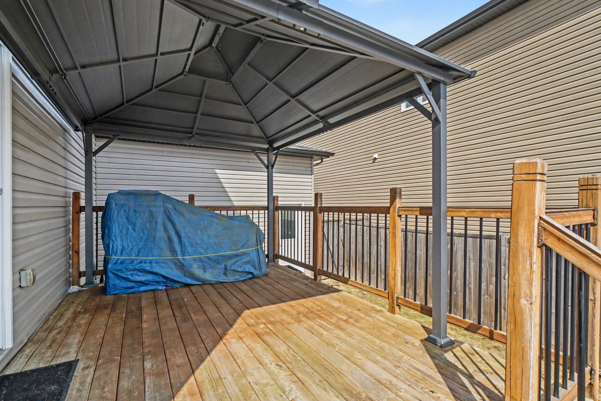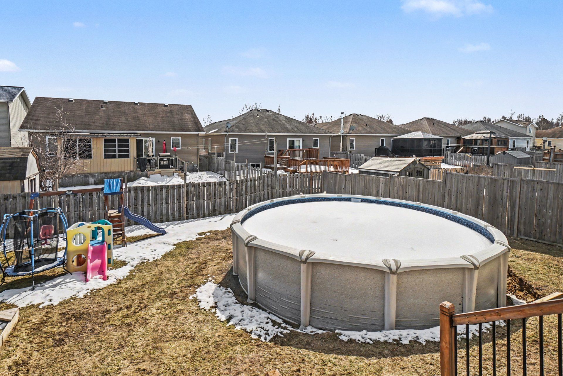• Fully fenced backyard with pool, deck, and gazebo for summer fun.