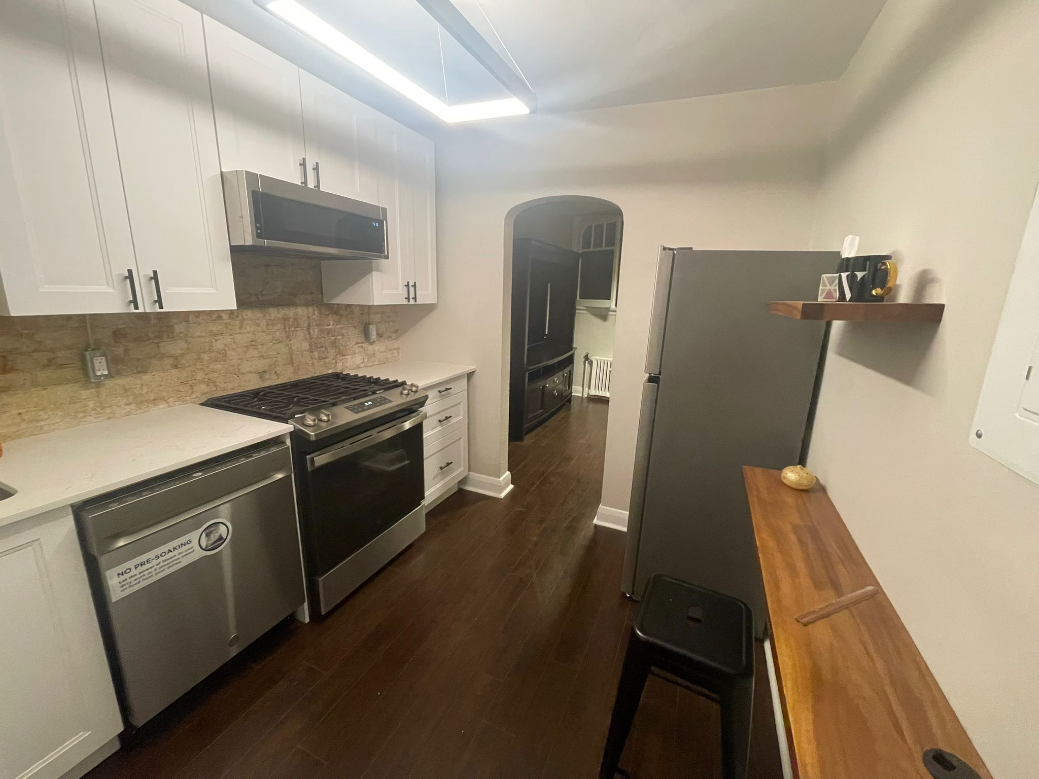 • Modern layout with stainless steel appliances and cozy electric fireplace.