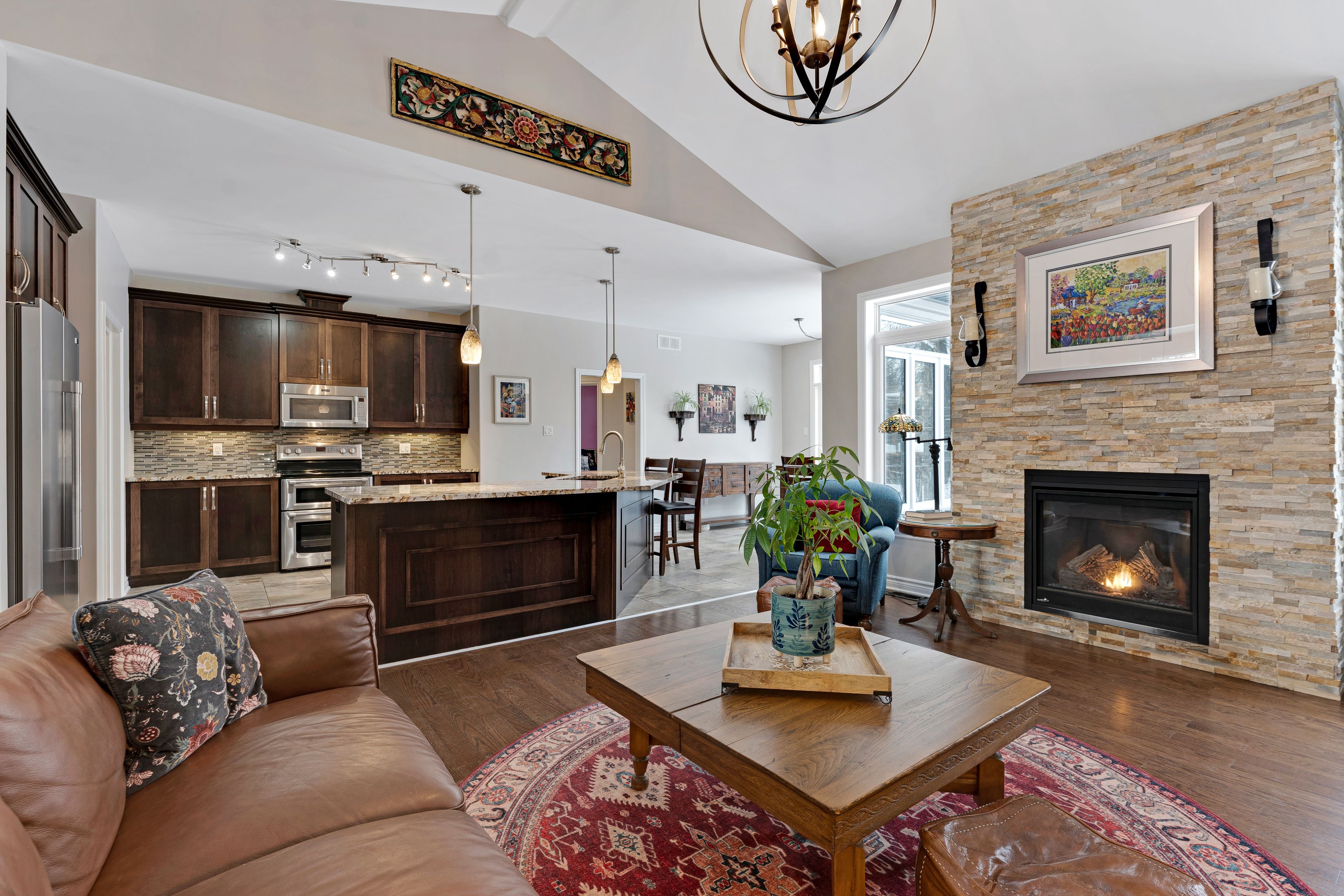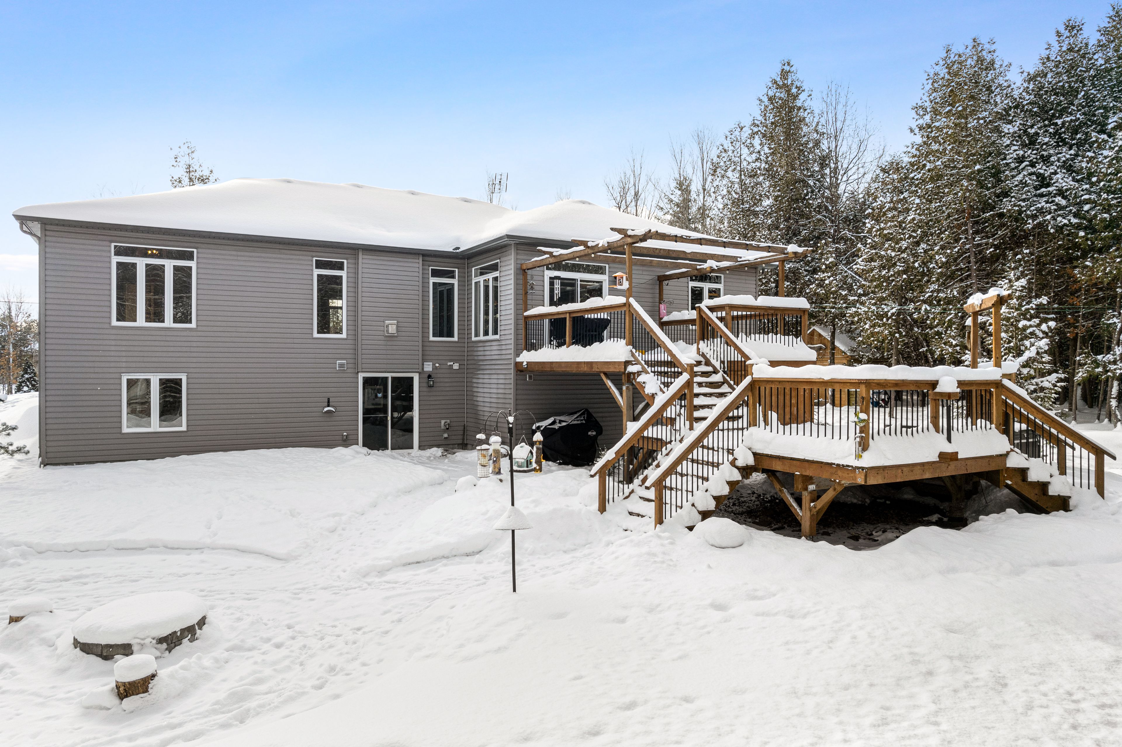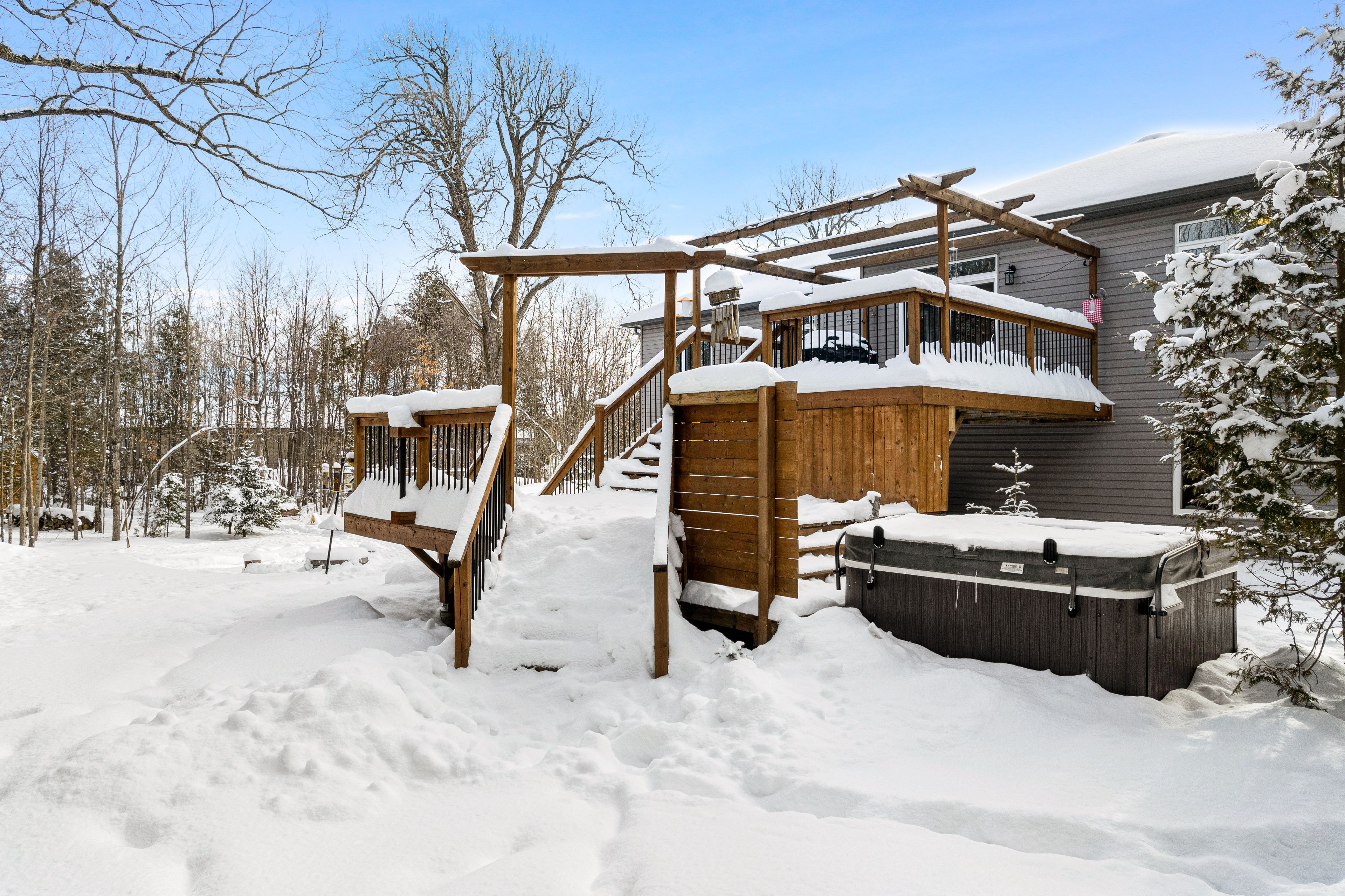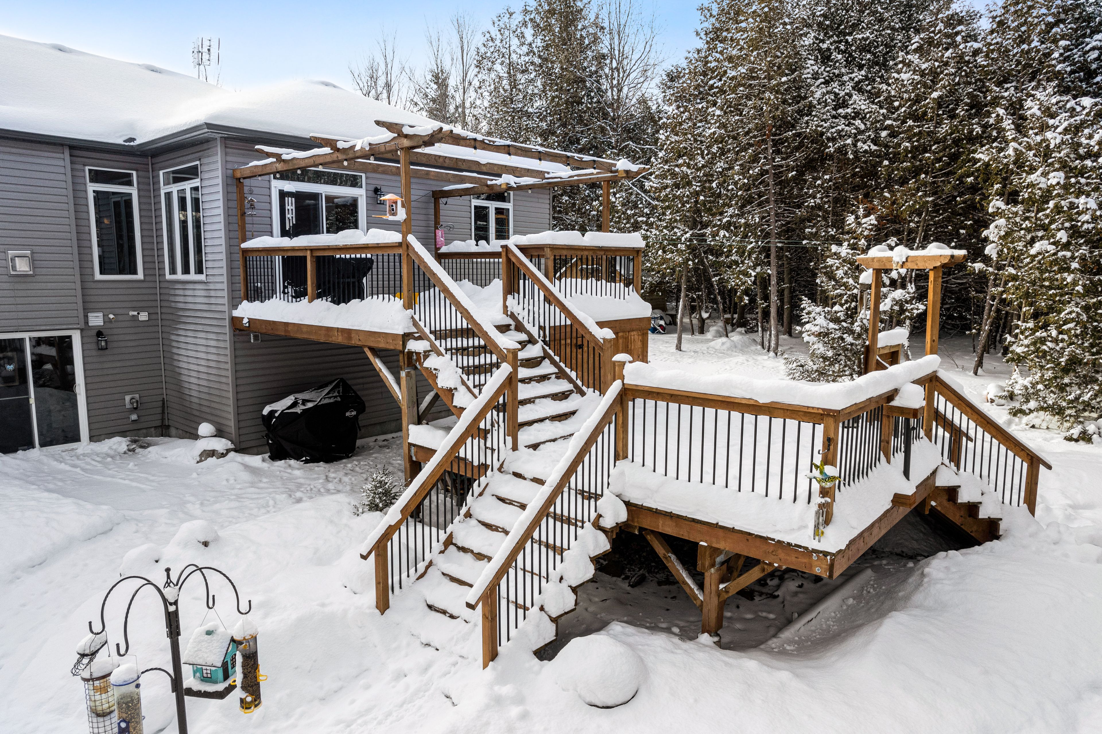 Welcome to beckenridge estates, where privacy, space, and style come together just 5 minutes from carleton place. This beautifully maintained 3 bedroom, 2 bathroom, 1,700 sq. Ft. Walkout bungalow sits on a stunning 1-acre treed lot, surrounded by extensive perennial gardens that create a peaceful, private retreat. Step inside to an inviting open concept main living space featuring a 13' vaulted ceiling and a cozy gas fireplace. The spacious kitchen is both functional and impressive with abundant cabinetry, maytag appliances, an oversized granite island with breakfast bar, a bright eating nook, and a dedicated coffee bar. The primary suite is tucked away for added privacy and includes a spacious 5-piece ensuite with a glass shower and walk-in closet. On the opposite side of the home, you'll find two additional bedrooms and a full bathroom-ideal for family, guests, or a home office. The large finished walkout basement boasts a wood pellet stove adding even more warmth to the pine detailing. Enjoy the calming zen-inspired fitness room or gather round the recreation area for movie nights or game day. Outside is where this property truly shines. Enjoy the sun and scenery from your private two-tiered 14' x 14' decks, unwind in the hot tub year-round, gather around the fire pit, and grow your own produce in the enclosed vegetable garden. Outbuildings offer excellent storage and flexible space for hobbies or a workshop. For outdoor enthusiasts, the home is also just a 1-minute walk to the ovr trail, making it easy to enjoy atving and snowmobiling right from your doorstep. Country living without giving up the convenience of town amenities nearby.