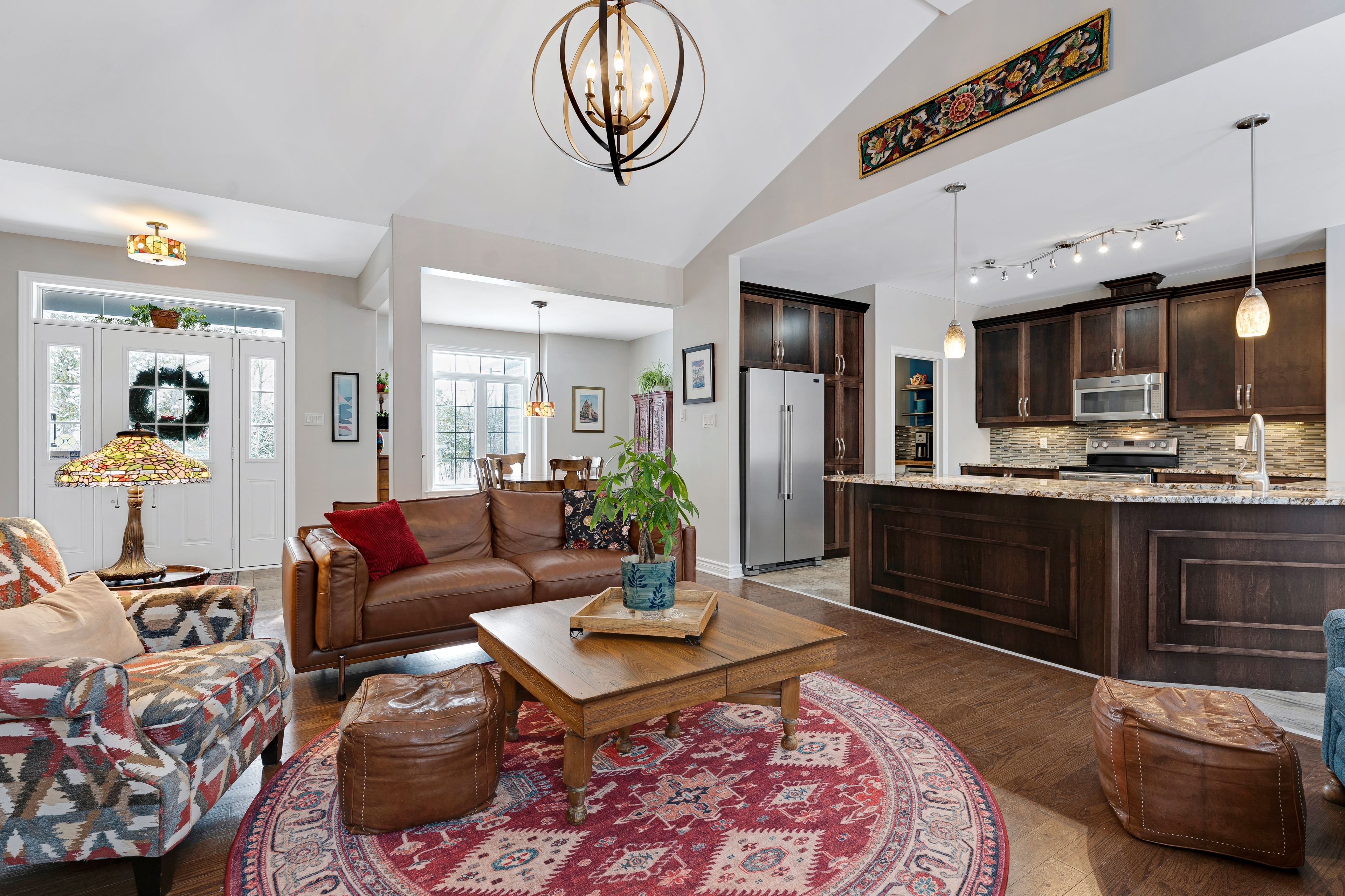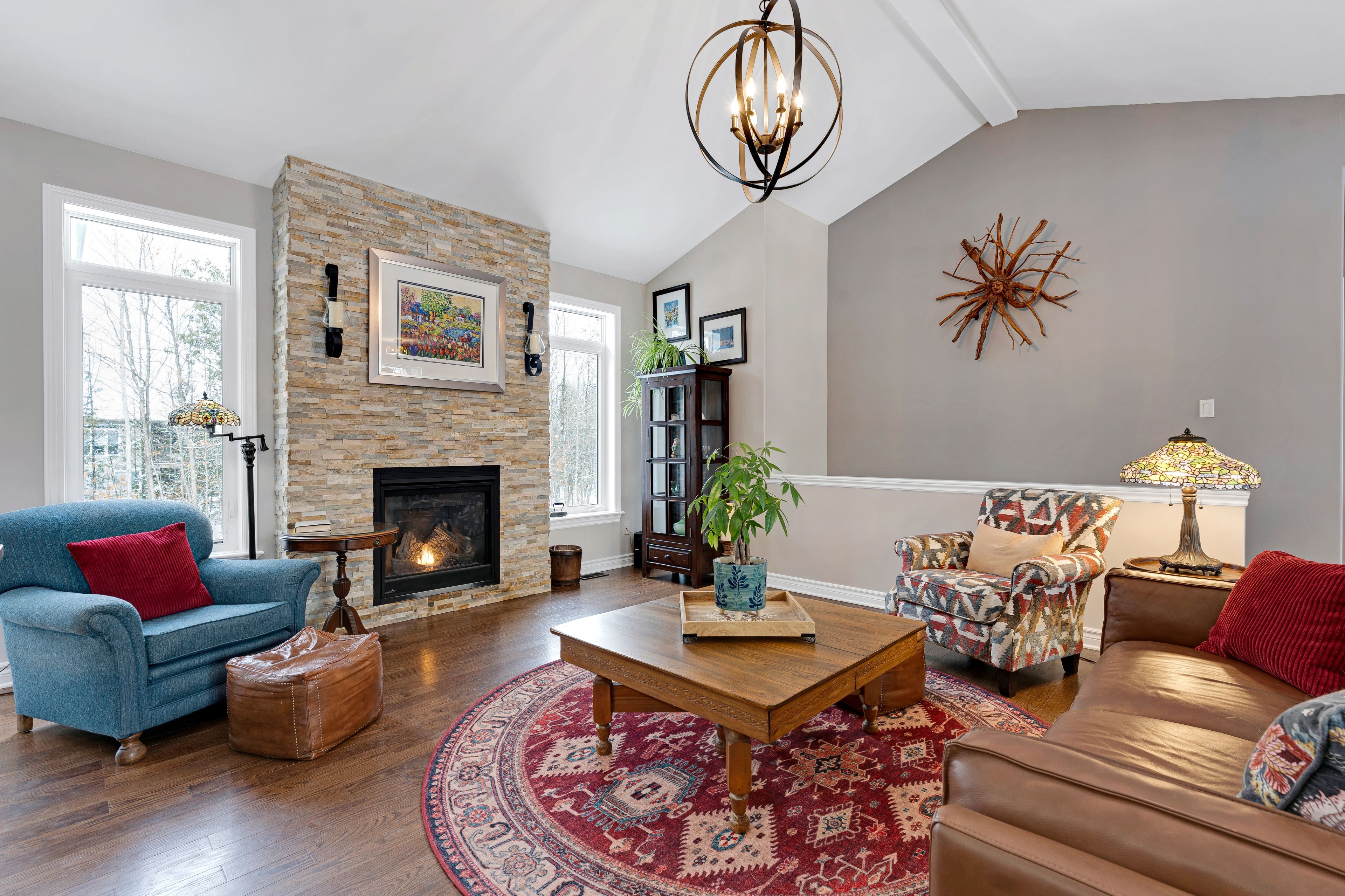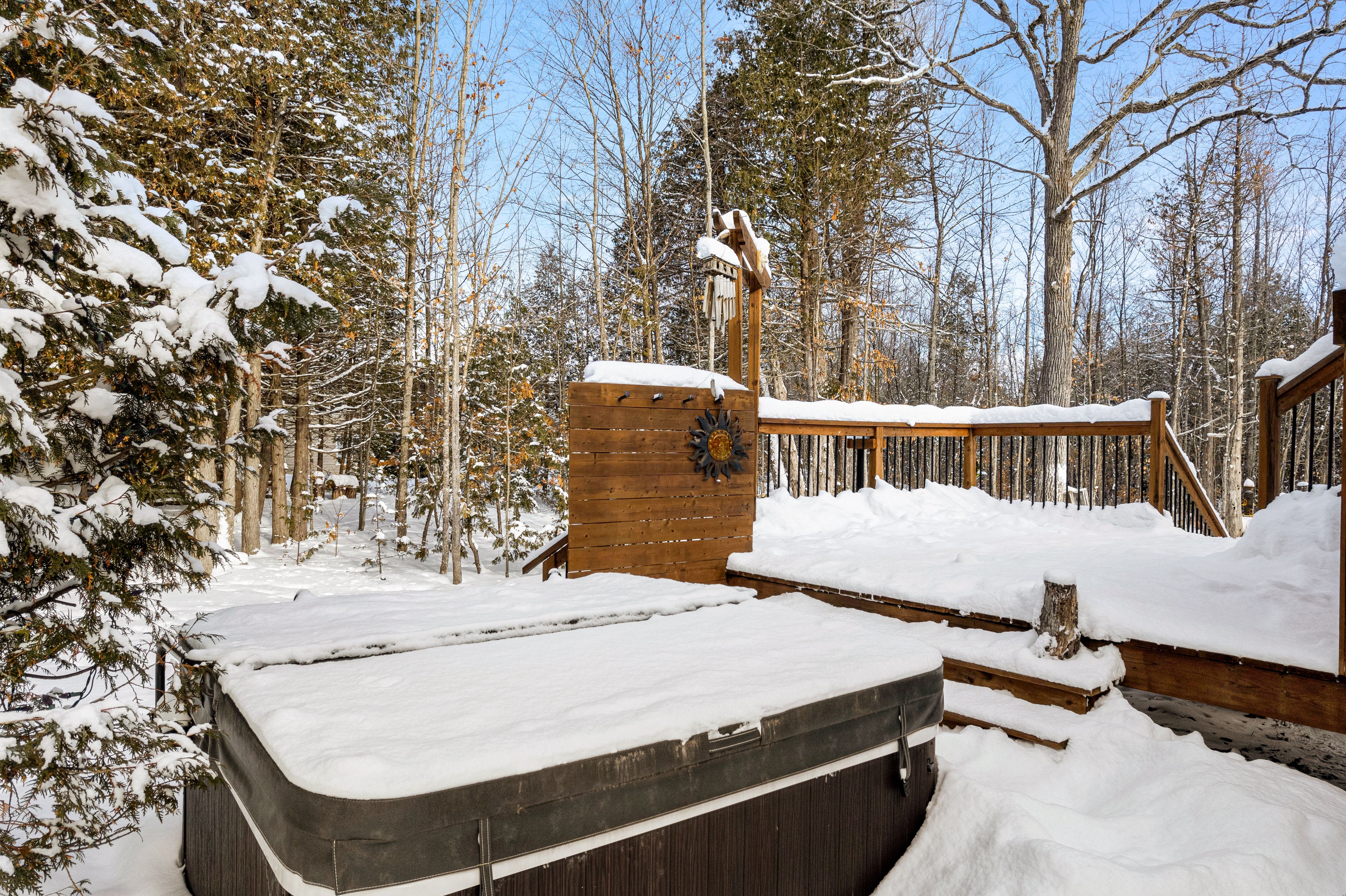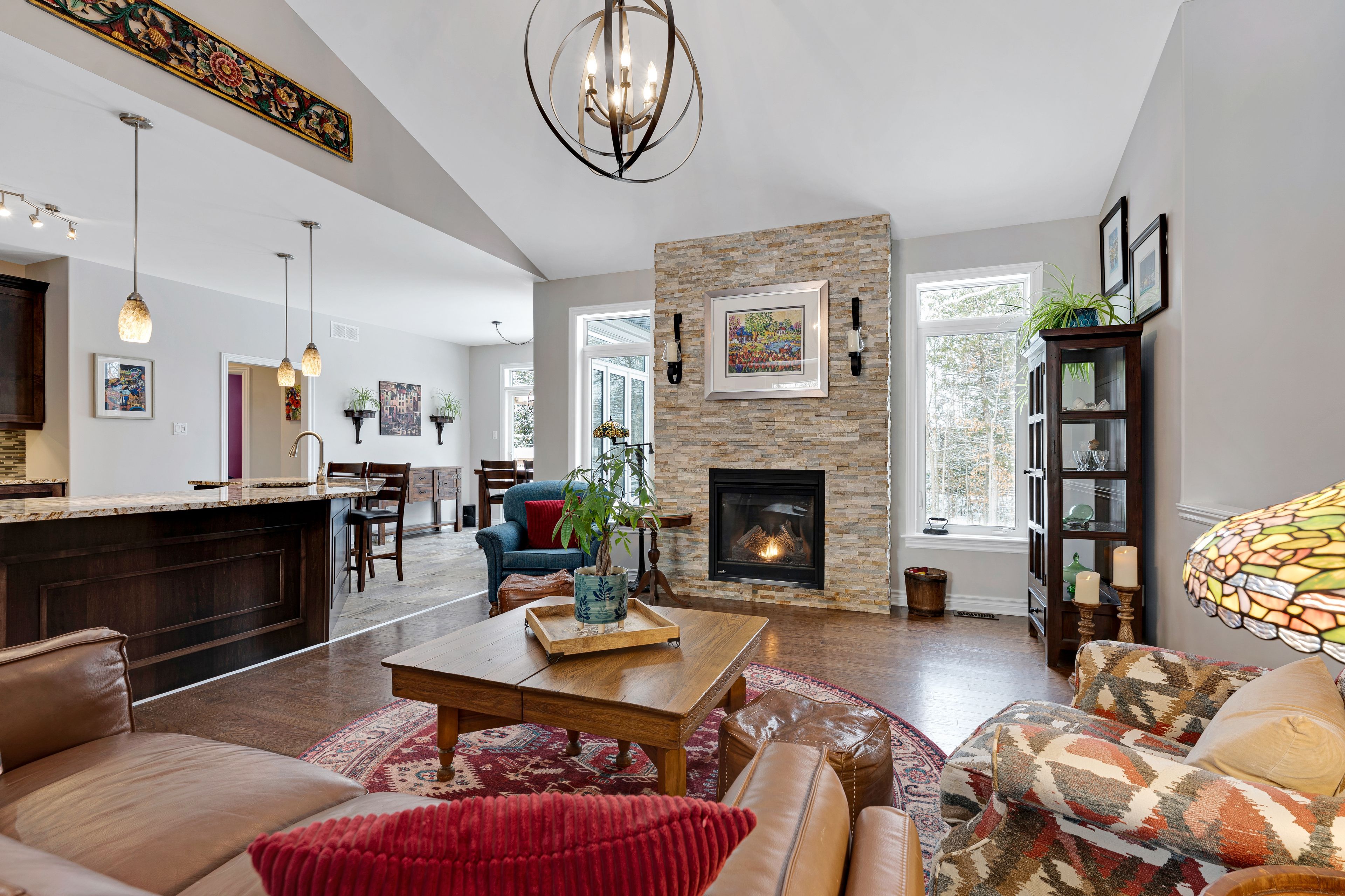 Welcome to beckenridge estates, where privacy, space, and style come together just 5 minutes from carleton place. This beautifully maintained 3 bedroom, 2 bathroom, 1,700 sq. Ft. Walkout bungalow sits on a stunning 1-acre treed lot, surrounded by extensive perennial gardens that create a peaceful, private retreat. Step inside to an inviting open concept main living space featuring a 13' vaulted ceiling and a cozy gas fireplace. The spacious kitchen is both functional and impressive with abundant cabinetry, maytag appliances, an oversized granite island with breakfast bar, a bright eating nook, and a dedicated coffee bar. The primary suite is tucked away for added privacy and includes a spacious 5-piece ensuite with a glass shower and walk-in closet. On the opposite side of the home, you'll find two additional bedrooms and a full bathroom-ideal for family, guests, or a home office. The large finished walkout basement boasts a wood pellet stove adding even more warmth to the pine detailing. Enjoy the calming zen-inspired fitness room or gather round the recreation area for movie nights or game day. Outside is where this property truly shines. Enjoy the sun and scenery from your private two-tiered 14' x 14' decks, unwind in the hot tub year-round, gather around the fire pit, and grow your own produce in the enclosed vegetable garden. Outbuildings offer excellent storage and flexible space for hobbies or a workshop. For outdoor enthusiasts, the home is also just a 1-minute walk to the ovr trail, making it easy to enjoy atving and snowmobiling right from your doorstep. Country living without giving up the convenience of town amenities nearby.