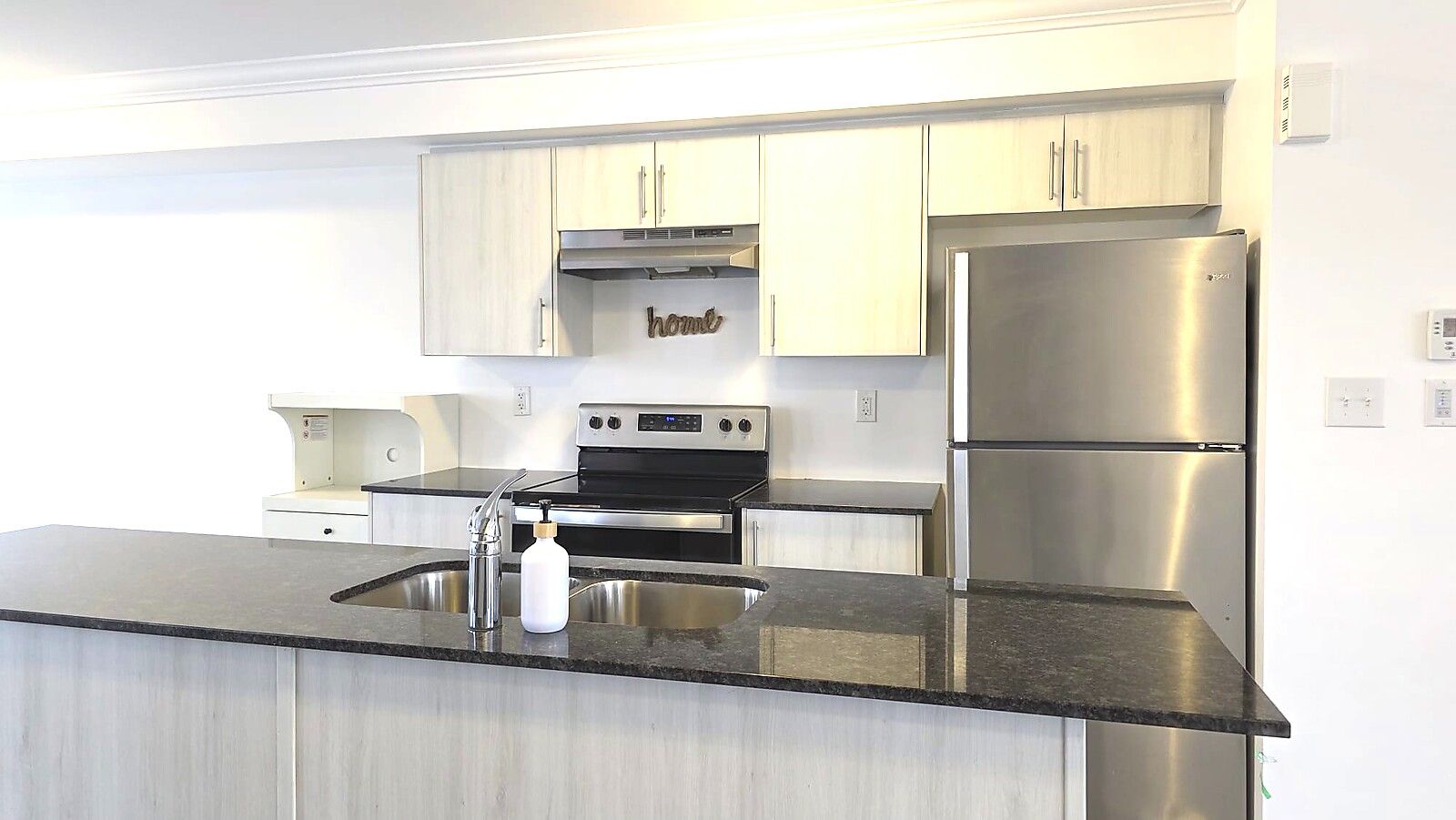 • Chef's kitchen with granite countertops and stainless steel appliances.