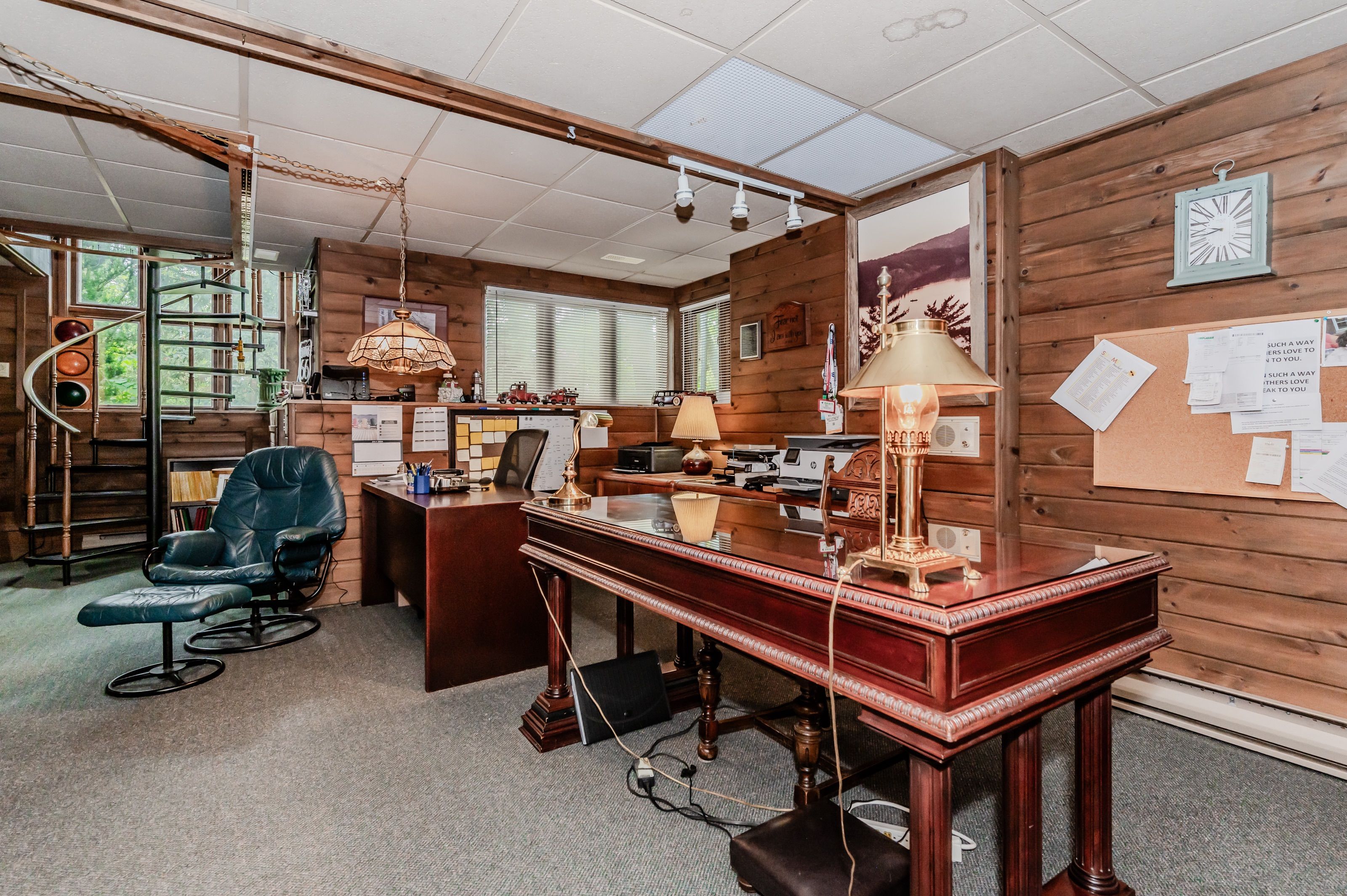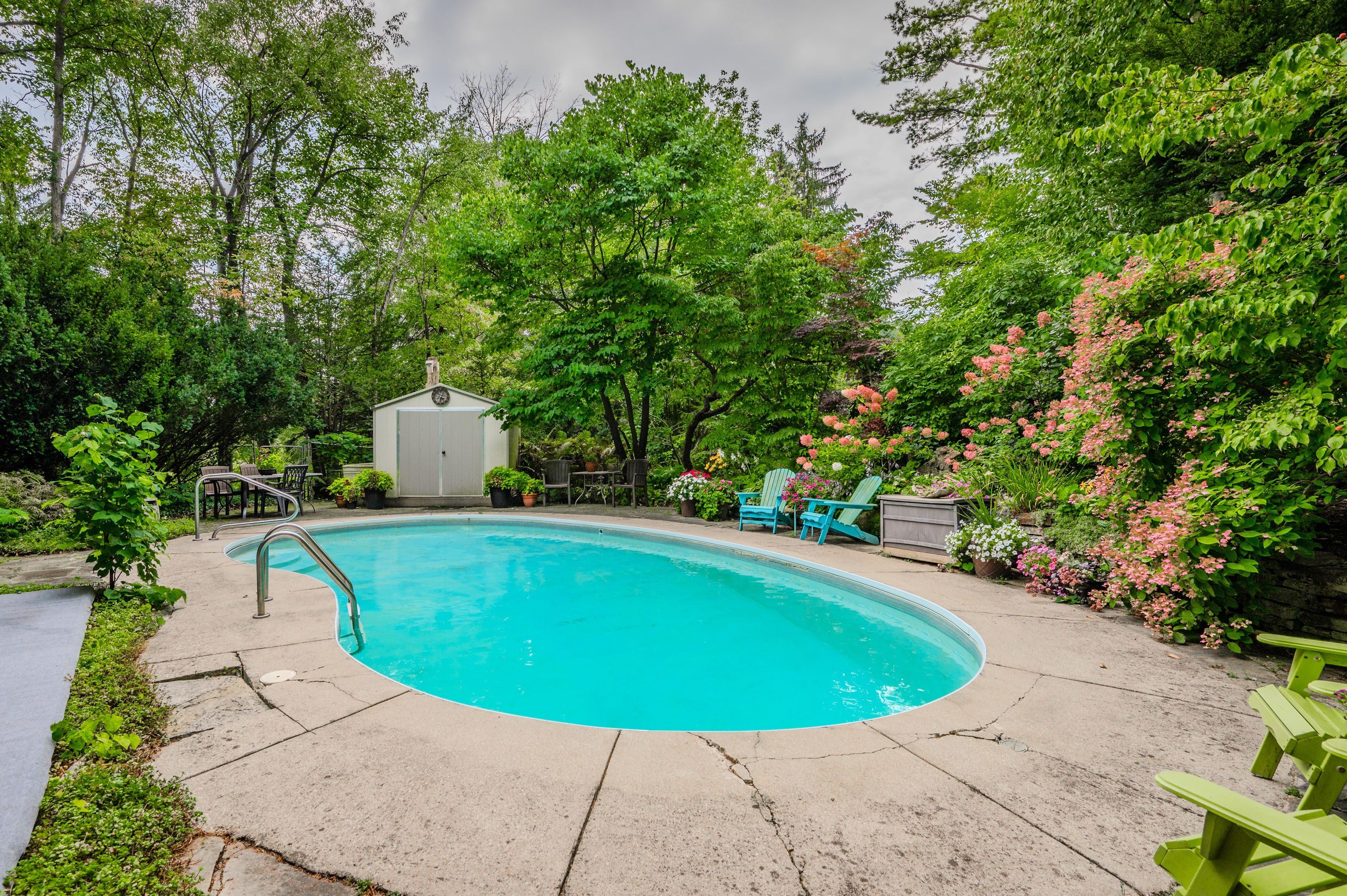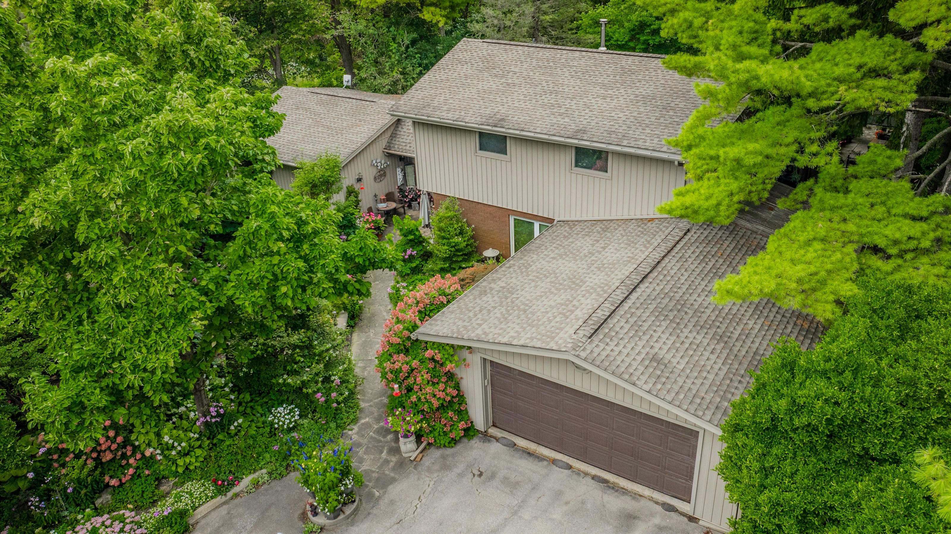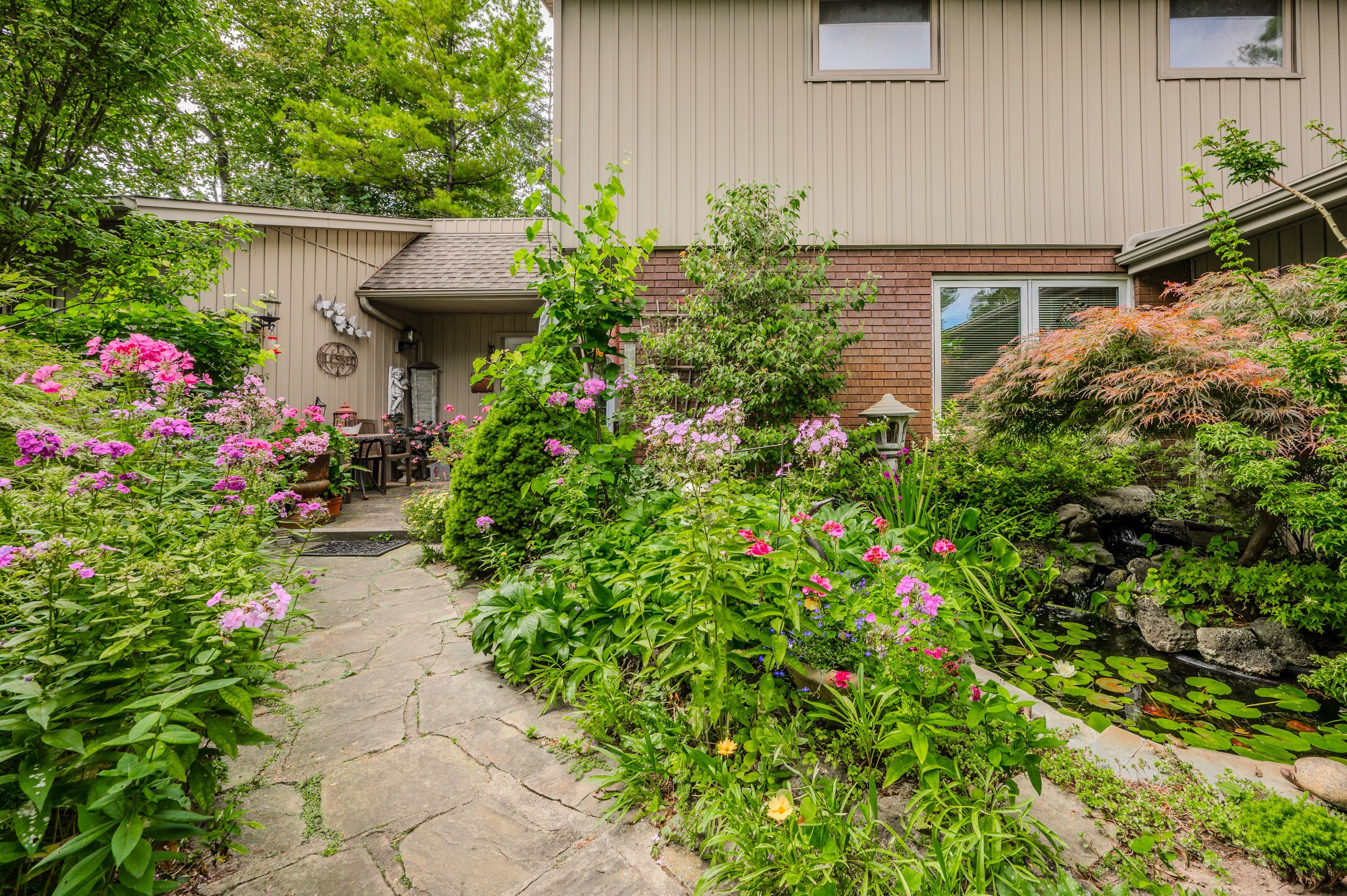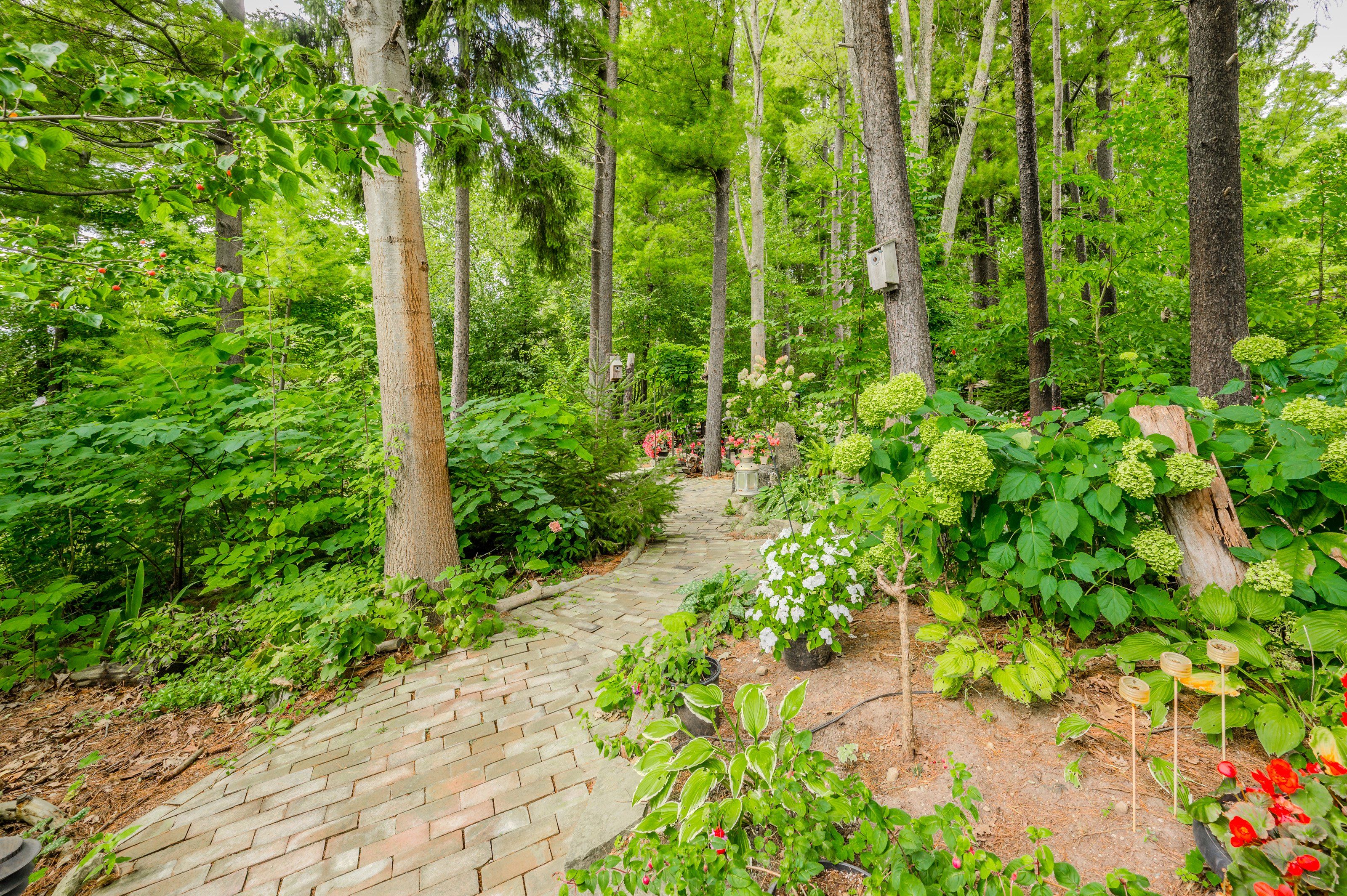 Rare find! Located on a stunning 1. 11 acre property, this unique home offers a postcard setting of singing pines, flowering trees, ponds, streams, an inviting inground pool and beautiful gardens. Step into the spacious foyer and to the left you'll find the serene primary suite addition (1983) featuring sloped ceilings, generous closet space, a spa-like ensuite, and a dramatic spiral staircase framed by windows that leads to the finished basement. The warm and welcoming kitchen is the room where your family will head for when they come home. The black granite counters contrast nicely with the white cabinetry, and there's lots of room for multiple people to cook with 2 sinks and a large island-perfect for casual family gatherings. Off the kitchen is a convenient powder room and laundry area. Enjoy garden views from the elegant formal dining room. A few steps up brings you to the large living room with cathedral ceilings and a cozy wood-burning fireplace-ideal for entertaining. From here, step into the enclosed, wrap-around sunroom deck that overlooks the magnificent yard. Travel up one more level to find three very spacious bedrooms and a full bath. The movie and sports crowd will love to relax in the lower-level family room with a wood stove, large windows, french doors to the patio and pool, and an adjacent full bathroom. The basement offers endless possibilities with space for a games room, home gym, hobbies, and ample storage. A bonus feature is the huge workshop with its own exterior entrance-great for hobbyists or home-based projects. With five finished levels, this home is ideal for large or multi-generational families. Magnificent sunsets!