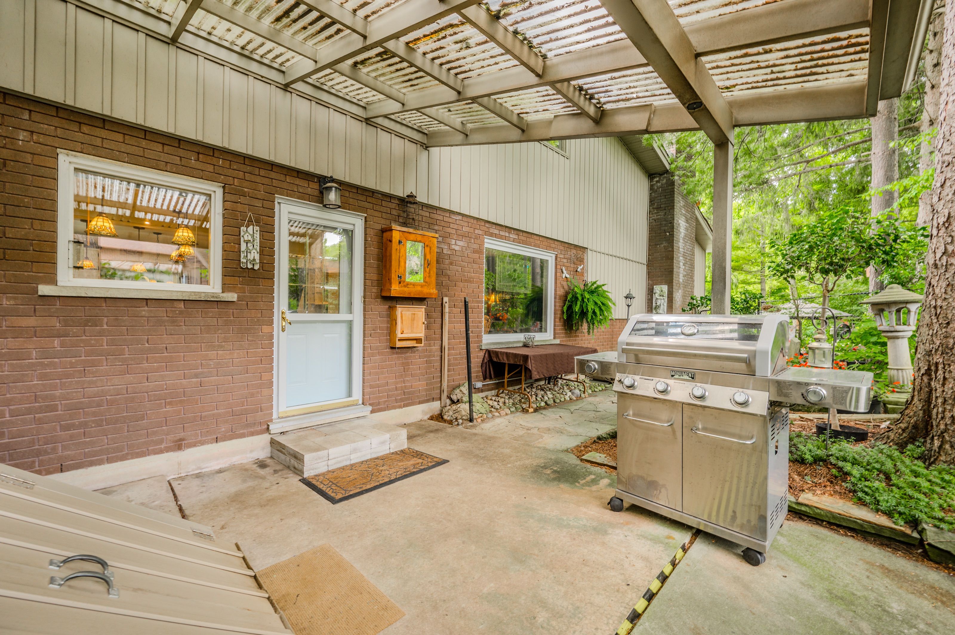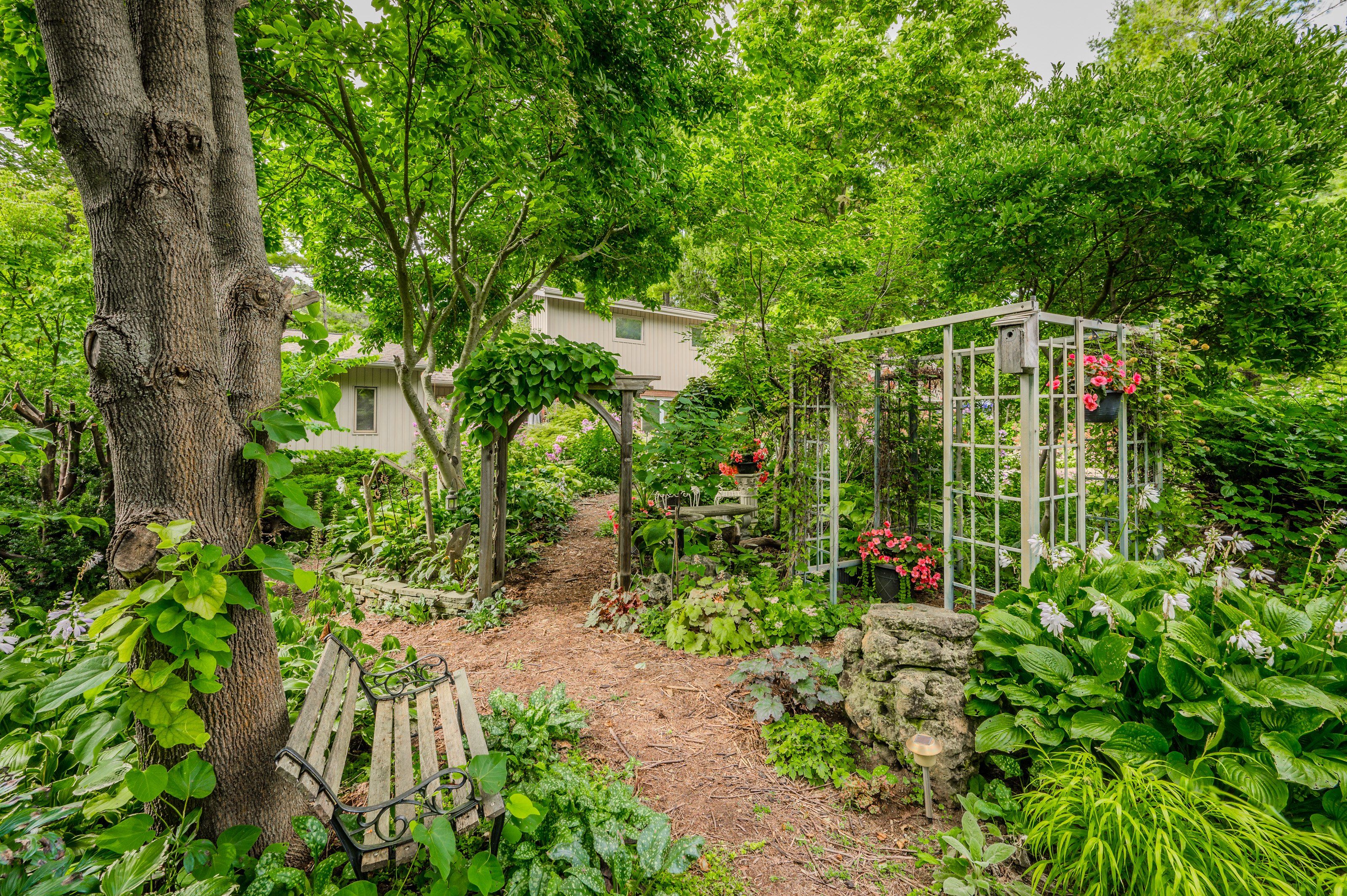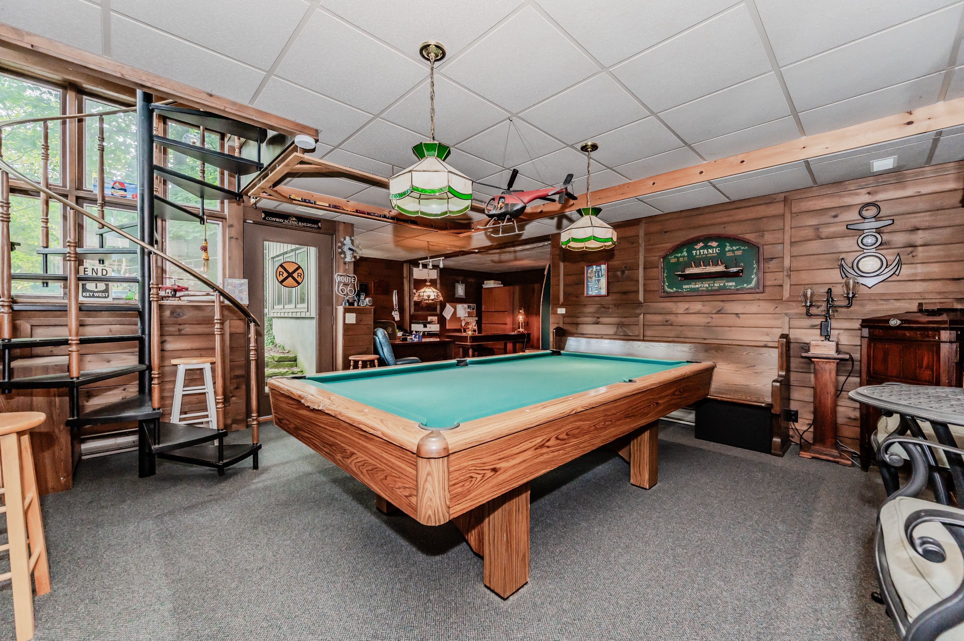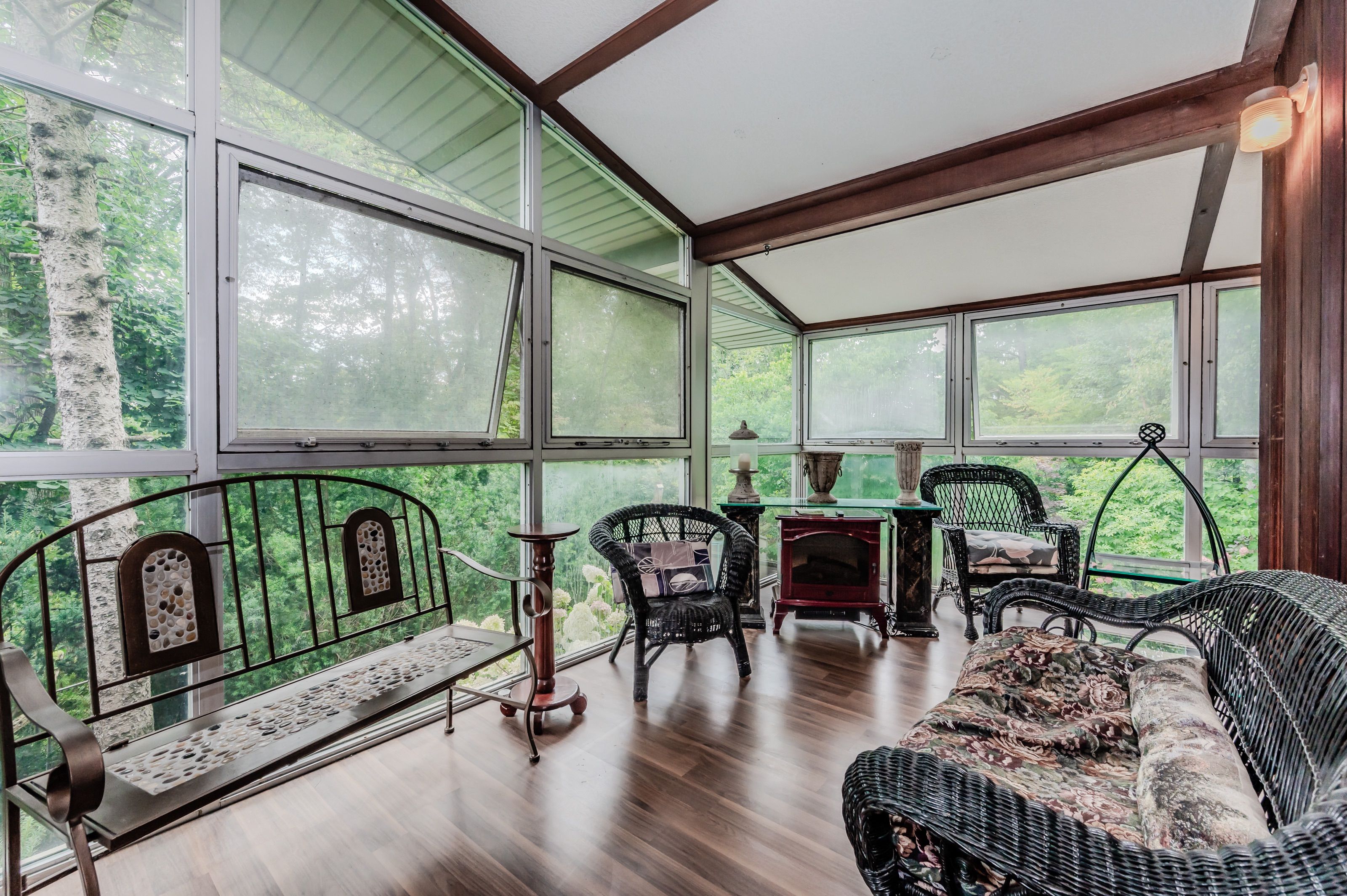 Rare find! Located on a stunning 1. 11 acre property, this unique home offers a postcard setting of singing pines, flowering trees, ponds, streams, an inviting inground pool and beautiful gardens. Step into the spacious foyer and to the left you'll find the serene primary suite addition (1983) featuring sloped ceilings, generous closet space, a spa-like ensuite, and a dramatic spiral staircase framed by windows that leads to the finished basement. The warm and welcoming kitchen is the room where your family will head for when they come home. The black granite counters contrast nicely with the white cabinetry, and there's lots of room for multiple people to cook with 2 sinks and a large island-perfect for casual family gatherings. Off the kitchen is a convenient powder room and laundry area. Enjoy garden views from the elegant formal dining room. A few steps up brings you to the large living room with cathedral ceilings and a cozy wood-burning fireplace-ideal for entertaining. From here, step into the enclosed, wrap-around sunroom deck that overlooks the magnificent yard. Travel up one more level to find three very spacious bedrooms and a full bath. The movie and sports crowd will love to relax in the lower-level family room with a wood stove, large windows, french doors to the patio and pool, and an adjacent full bathroom. The basement offers endless possibilities with space for a games room, home gym, hobbies, and ample storage. A bonus feature is the huge workshop with its own exterior entrance-great for hobbyists or home-based projects. With five finished levels, this home is ideal for large or multi-generational families. Magnificent sunsets!