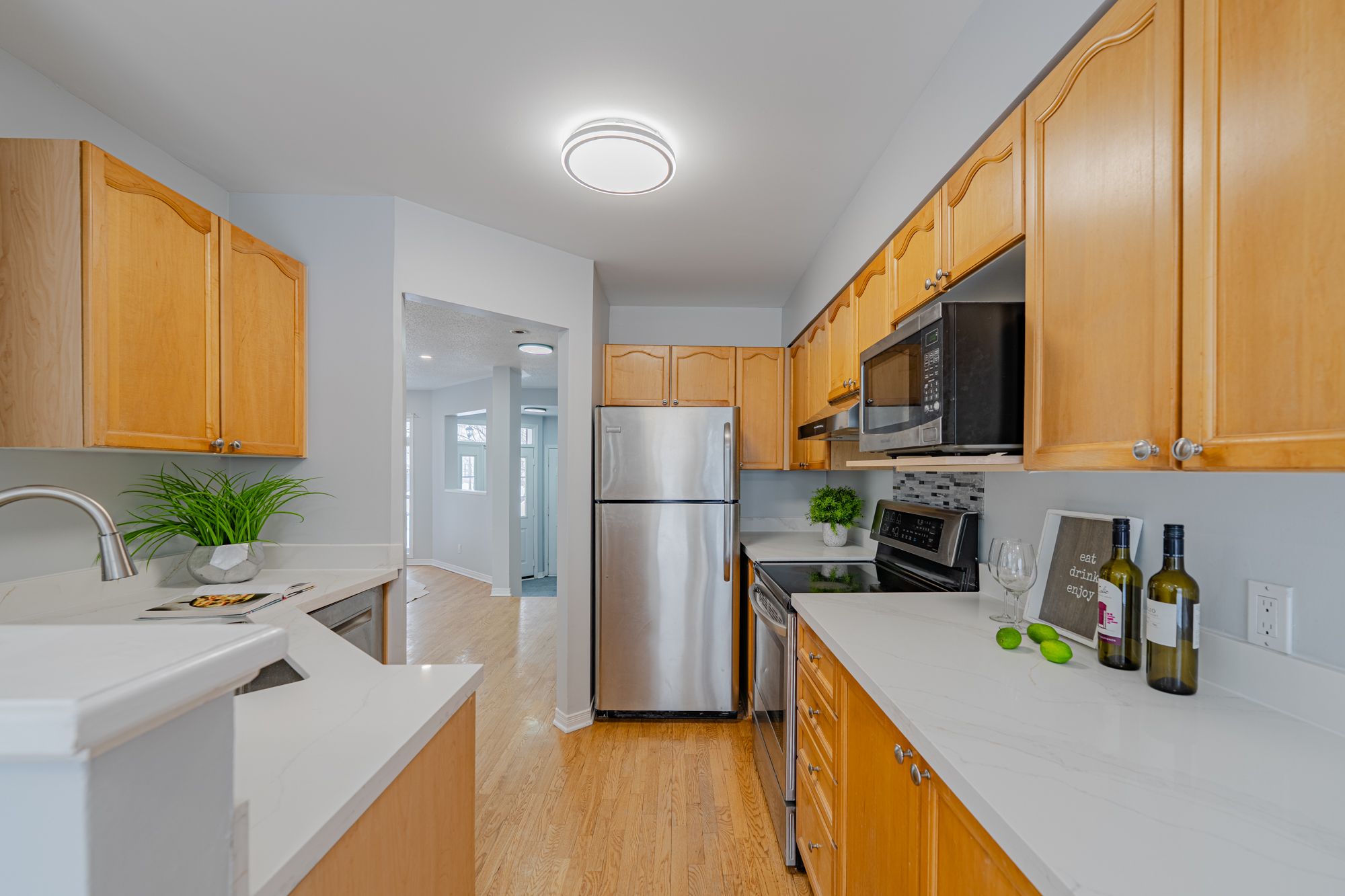 Rarely offered end-unit townhome in the heart of kanata lakes situated on a premium lot with a fully fenced backyard, this exceptional end-unit townhome offers added privacy and a functional, family-friendly layout in one of ottawa's most desirable communities. Located within the boundaries of top-ranked schools including w. Erskine johnston public school, stephen leacock public school, earl of march secondary school, and all saints high school, this is a prime opportunity for families seeking both quality and location. This bright, carpet-free home features 3 bedrooms, 3 bathrooms, and a fully finished basement ideal for a recreation room, home office, or gym. The spacious primary bedroom includes a walk-in closet and a beautifully updated ensuite. The kitchen and all bathrooms have been renovated with elegant quartz countertops, new sinks, faucets, and mirrors, combining modern design with durability and low maintenance. Extensively upgraded with efficiency and comfort in mind: heat pump (2024) upgraded insulation (2024) owned hot water tank pot lights and updated lighting throughout (2025-2026) new staircase fresh paint (2025) professional duct cleaning new window glass installed throughout (2026)the fully finished basement provides flexible living space to suit today's lifestyle needs. Move-in ready and thoughtfully updated, this home delivers exceptional value in the highly sought-after kanata lakes neighbourhood, close to parks, shopping, transit, and all amenities.