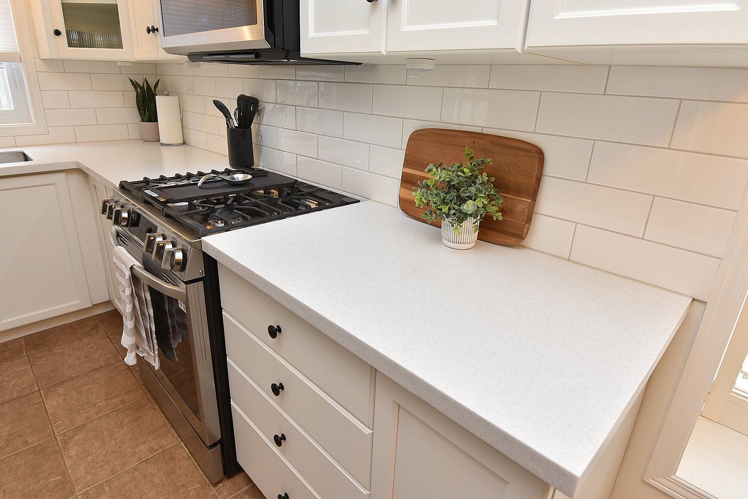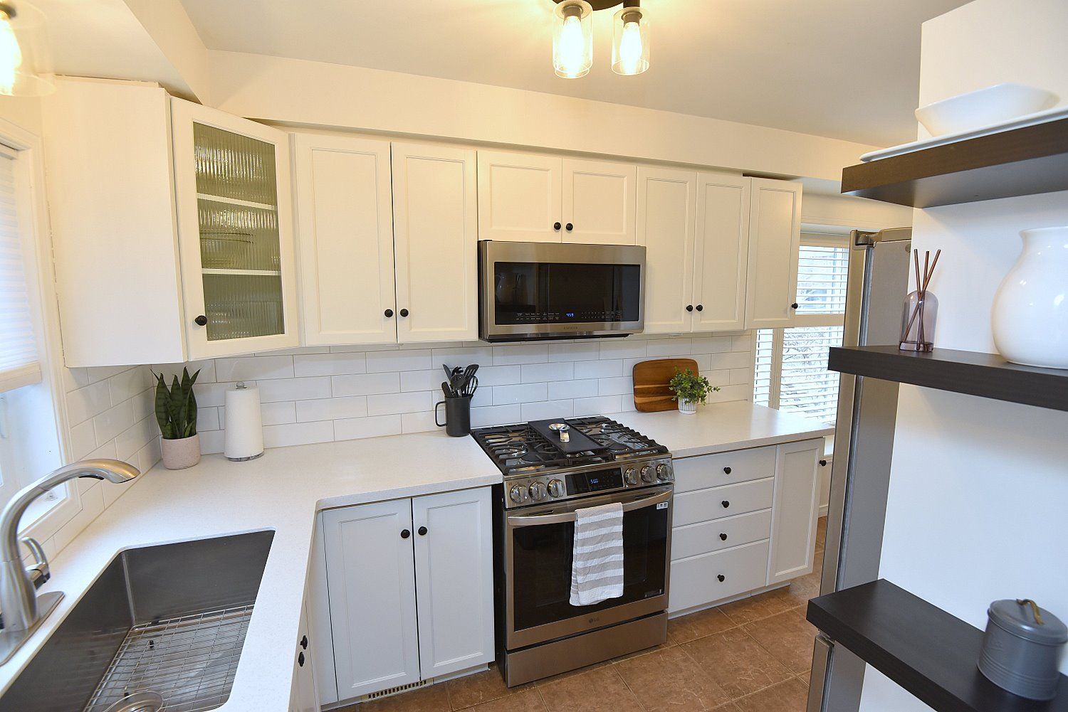 • Bright kitchen features Corian countertops and stainless steel appliances.